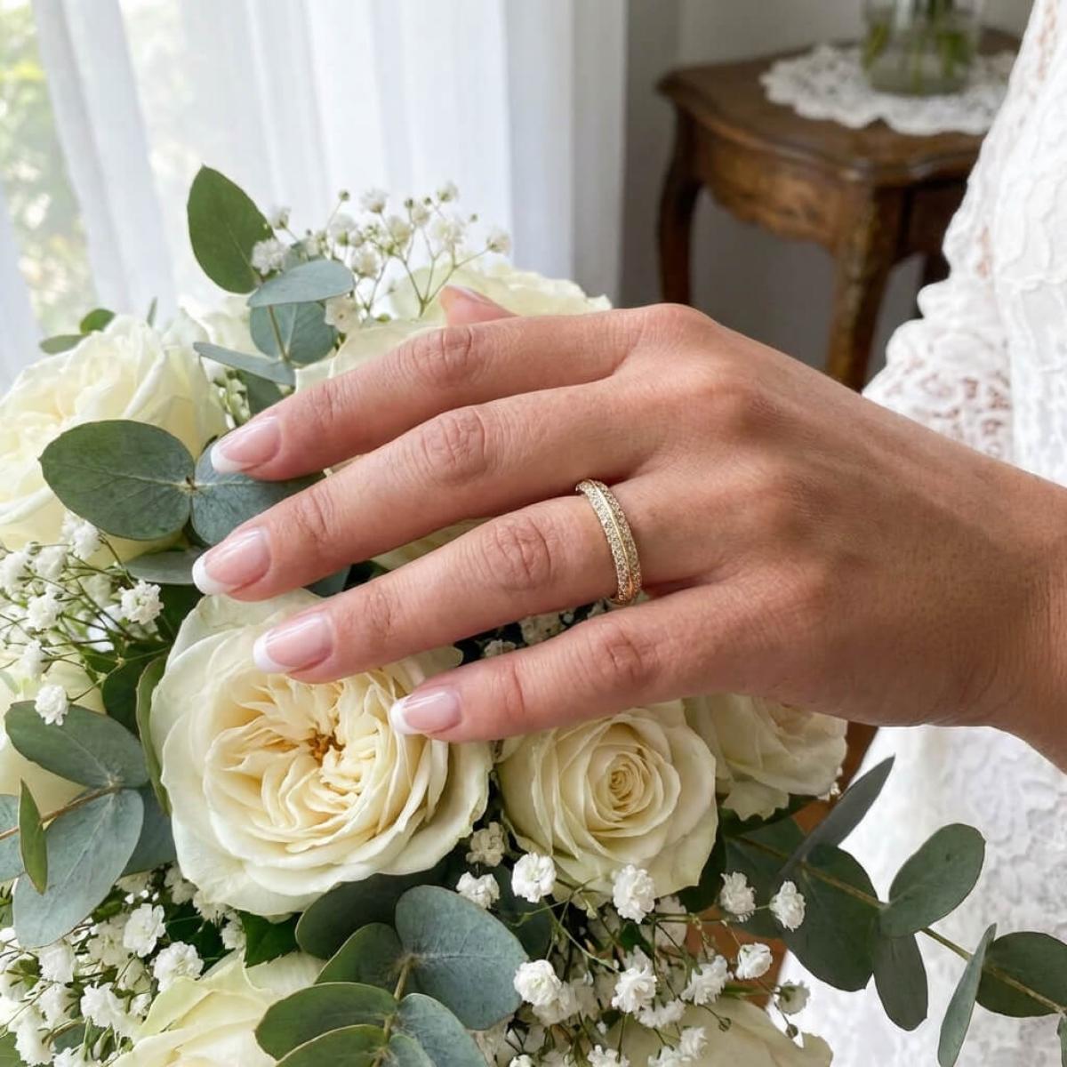 По отношение на благородните метали, хората са разделени почти по равно – почитатели на златото и фенове на среброто. Бялото злато пресъздава визуално излъчването на сребърните сплави с разликата, че е с по-тъмен оттенък и с доста по-висока цена. Нашата брачна халка, изработена в два цвята, отговаря на вкуса на почитателите и на златните, и на сребърните накити.