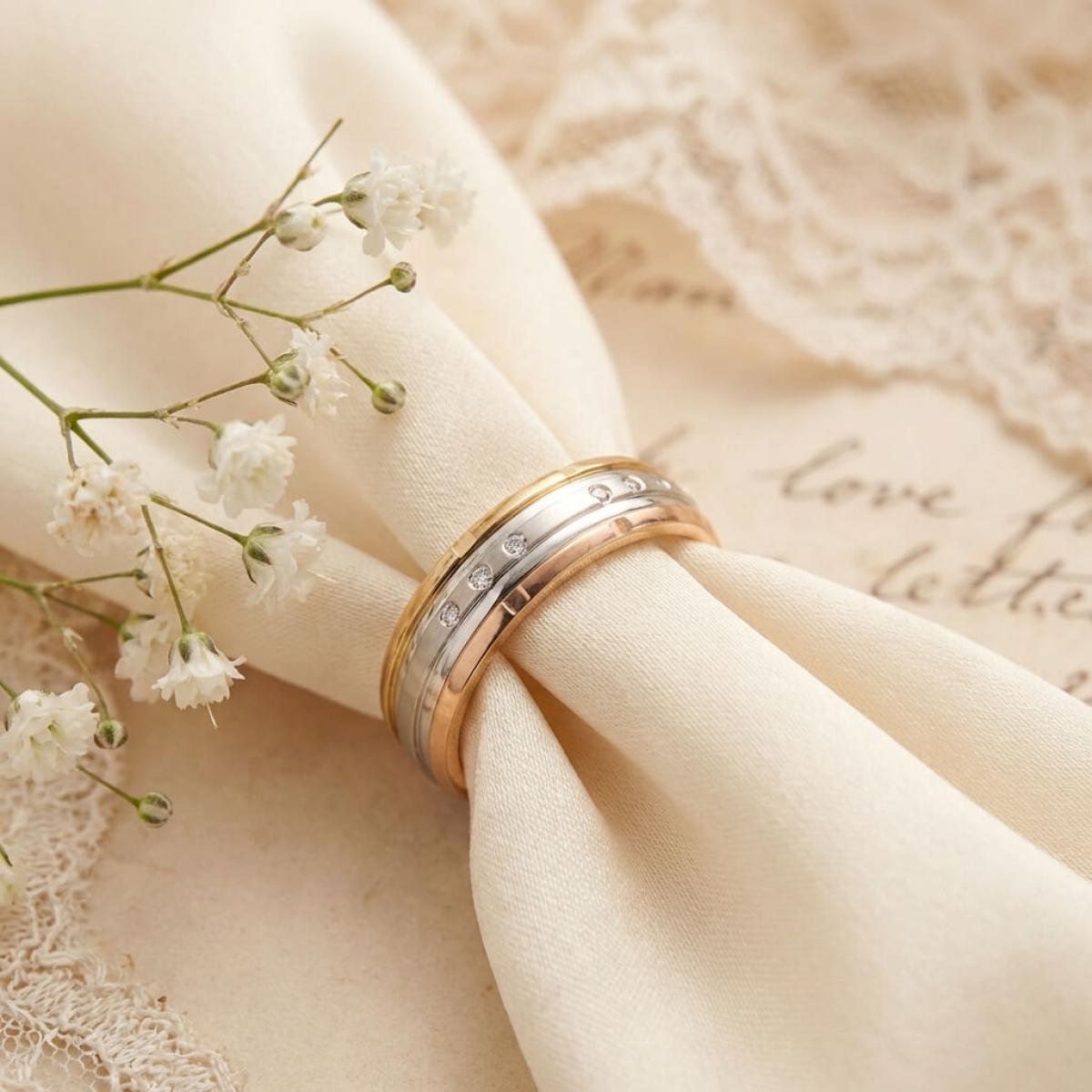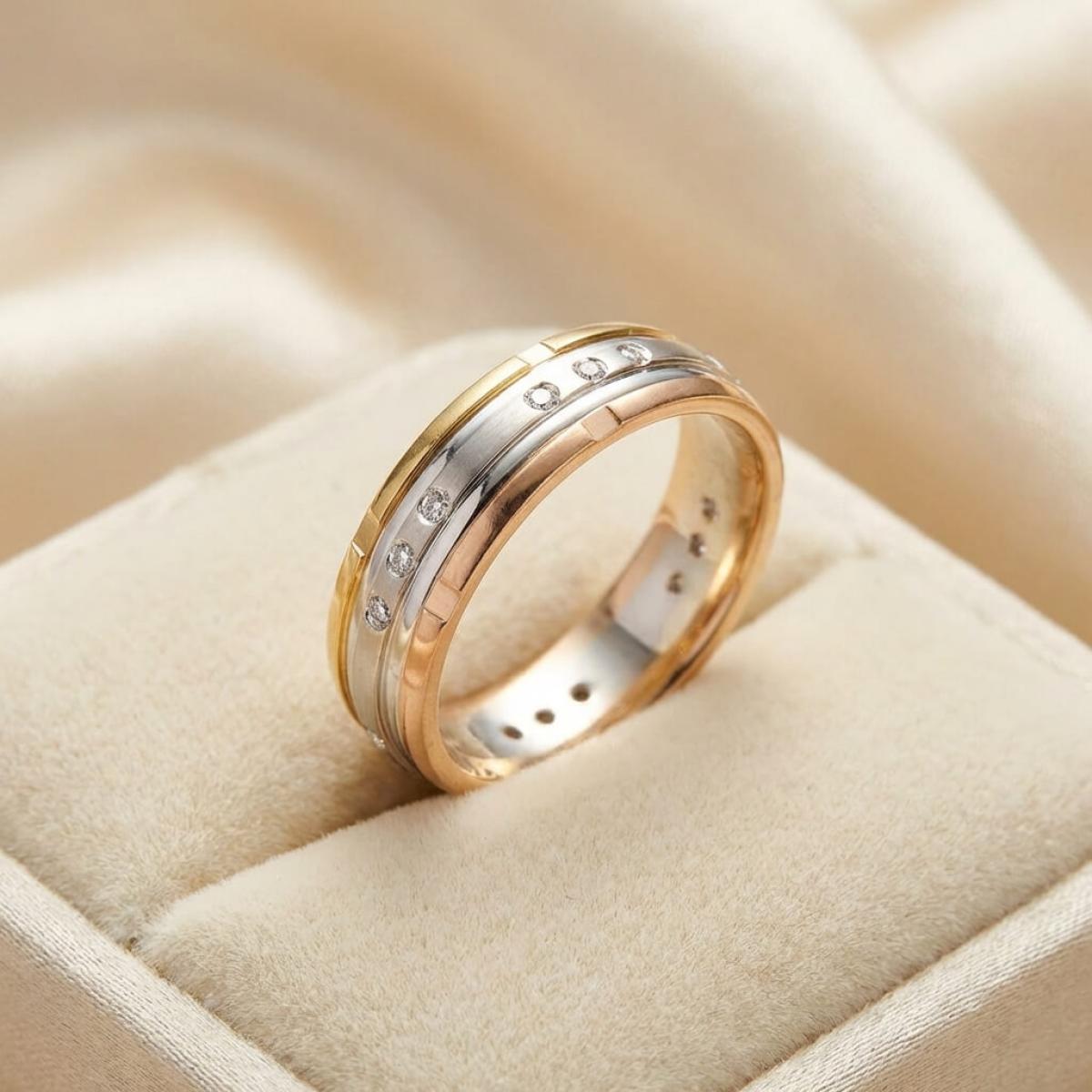 Предлагаме ви трицветна брачна халка, декорирана с малки бели циркони. Този нетрадиционен дизайн ви позволява да се откроите сред останалите семейни хора. Изберете халката Н9994 като символ на семейния ви статус и добър вкус. Халките се изработват ръчно от 14-каратово злато проба 585 и се доставят с гаранция – сертификат за произход и качество.