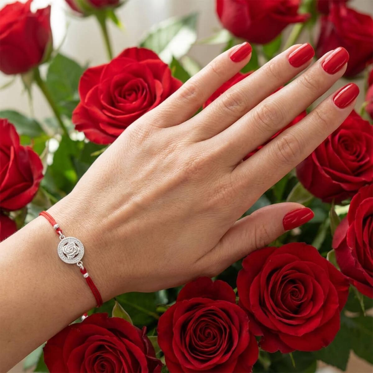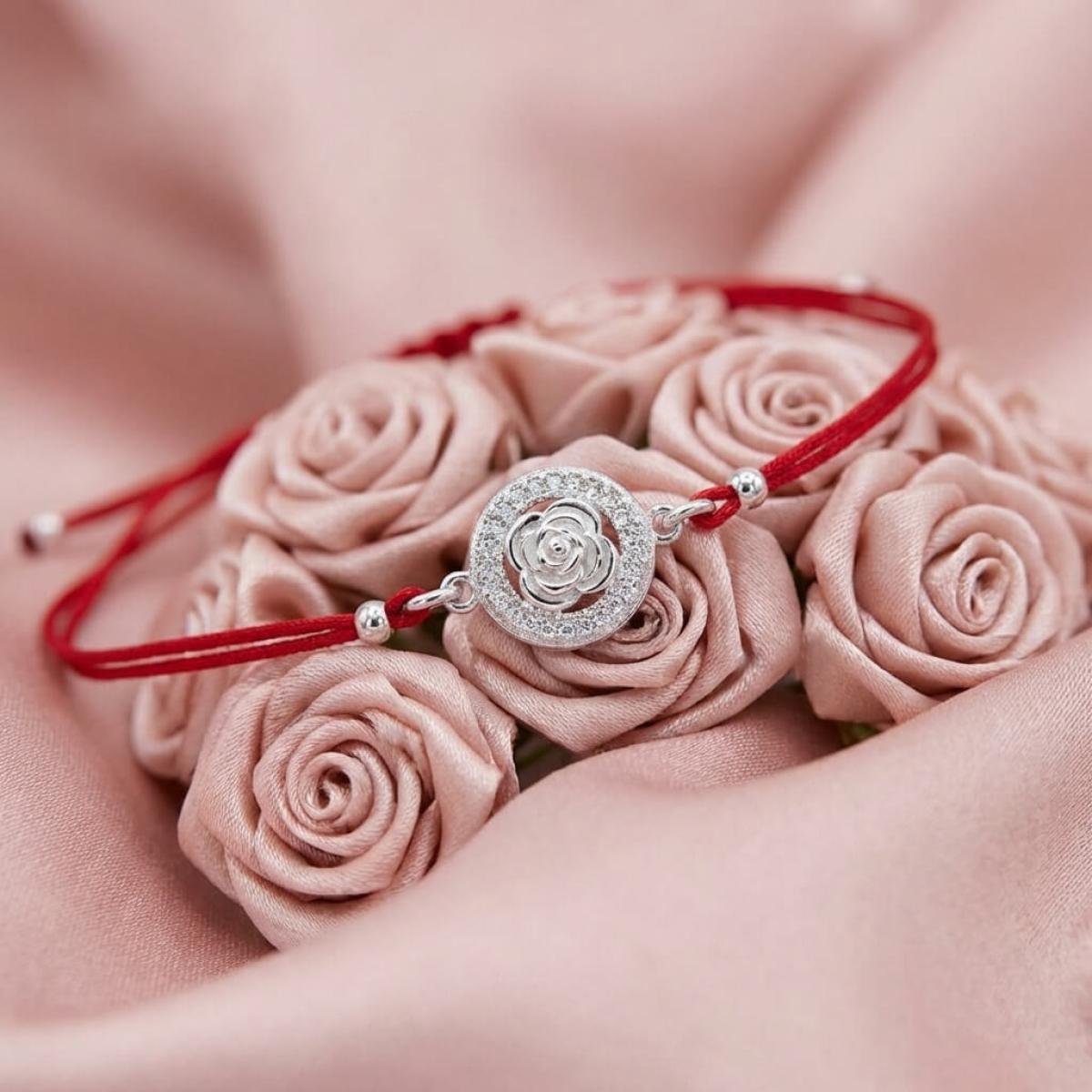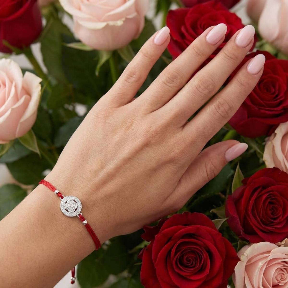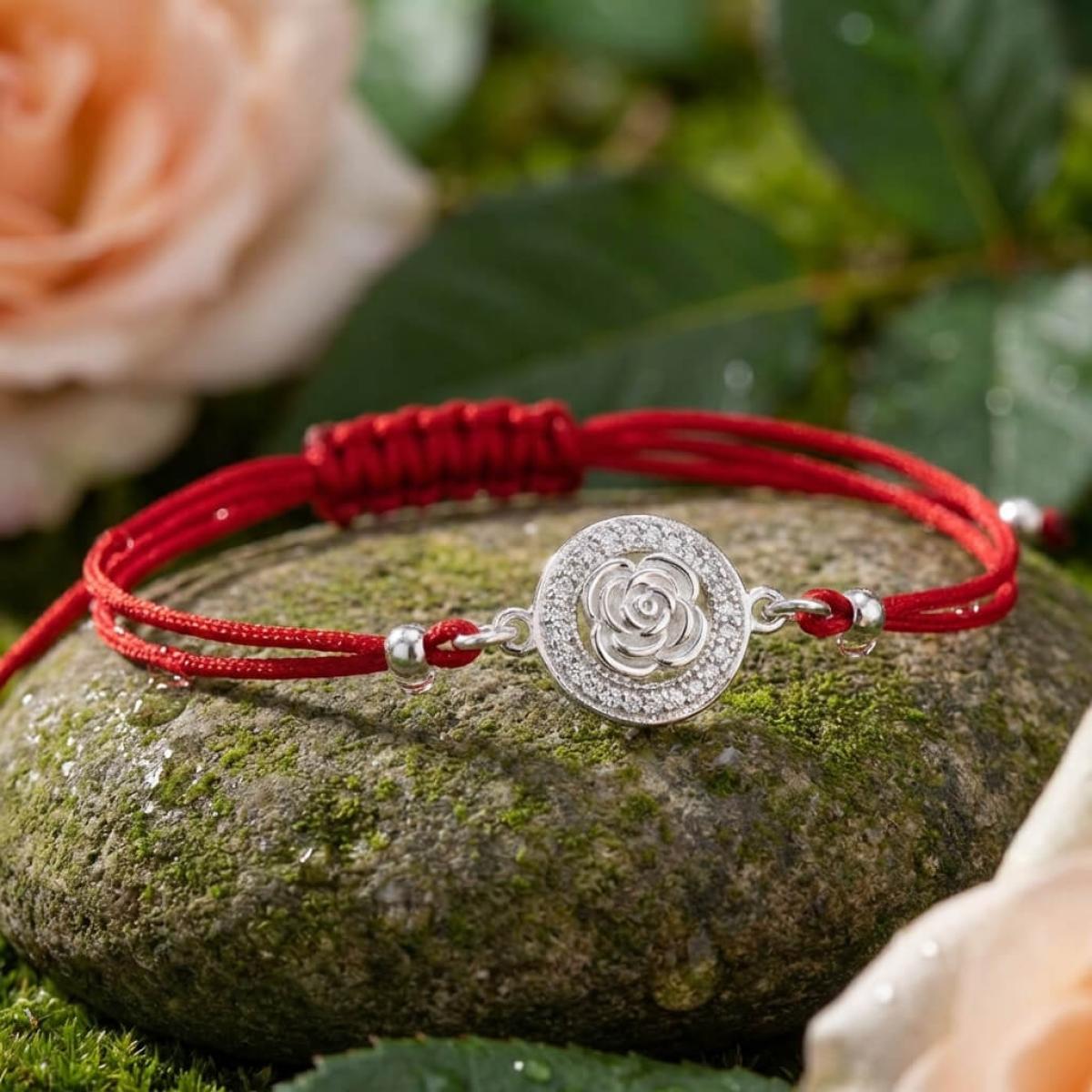 Гривна с червен конец и сребърен елемент роза с циркони