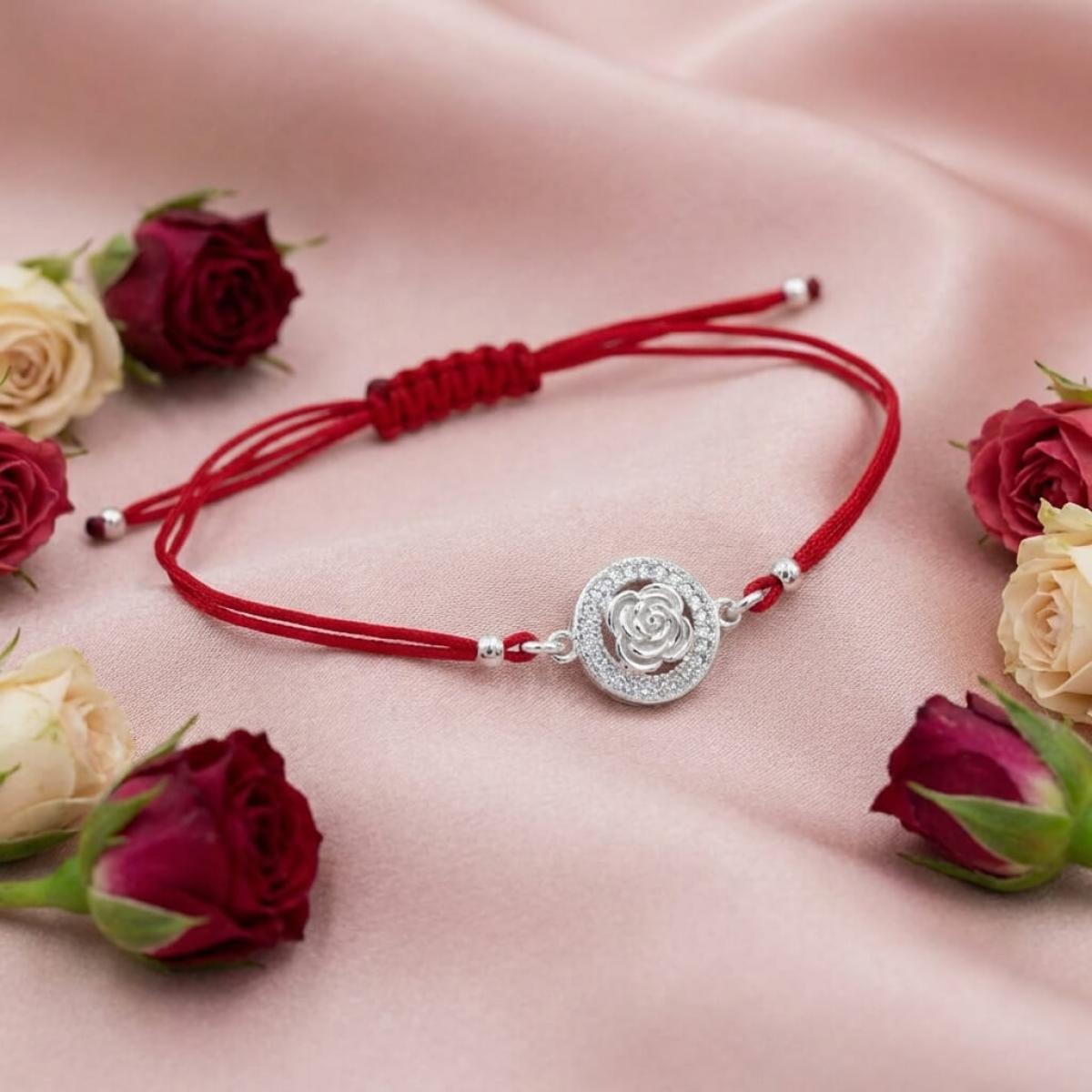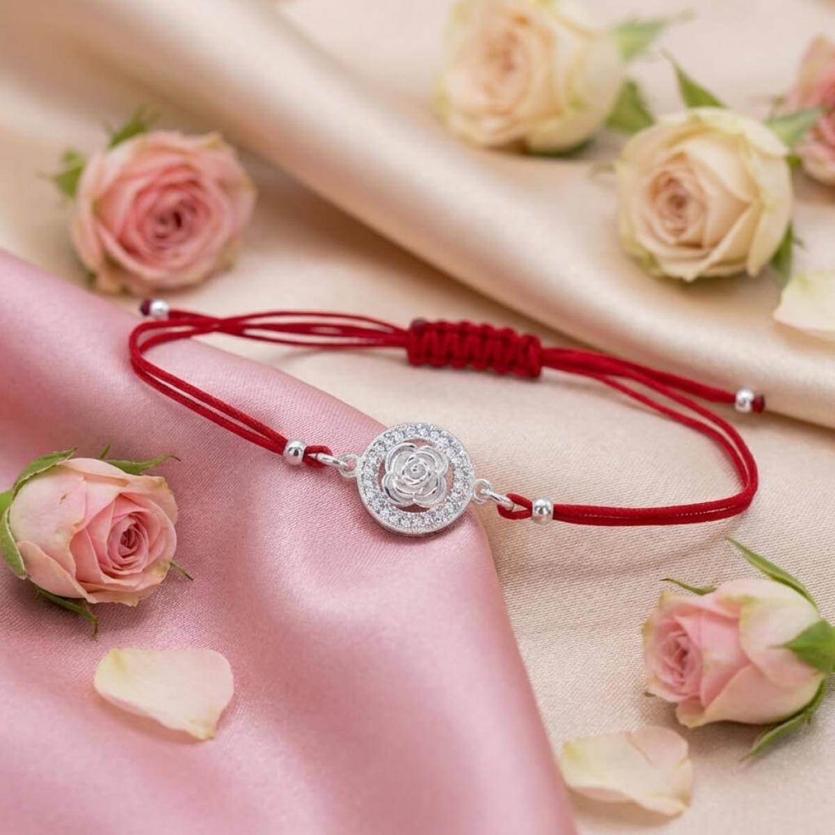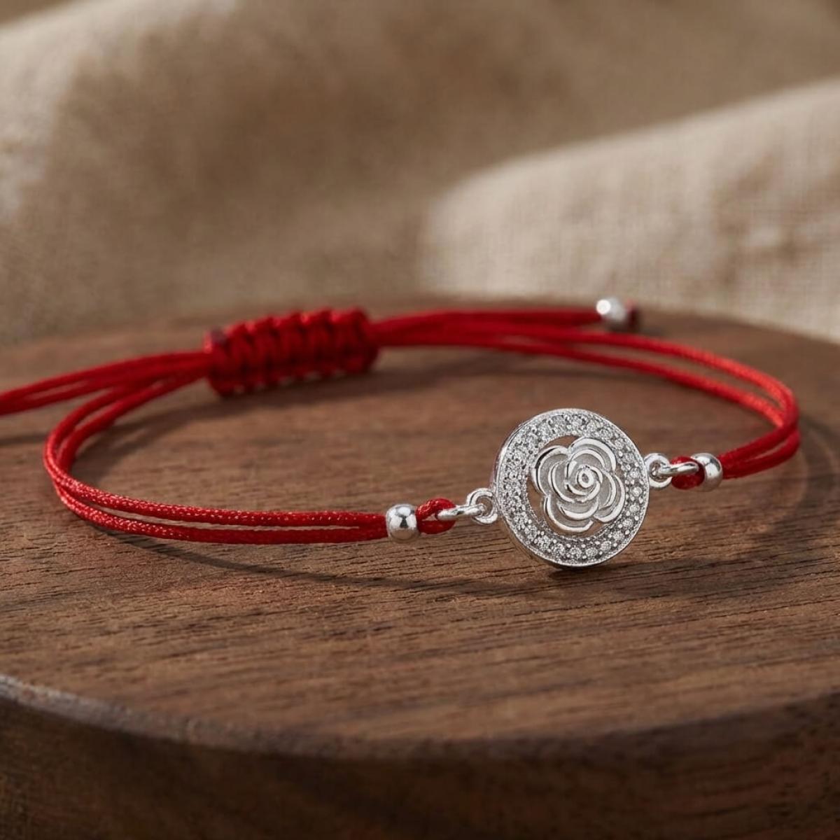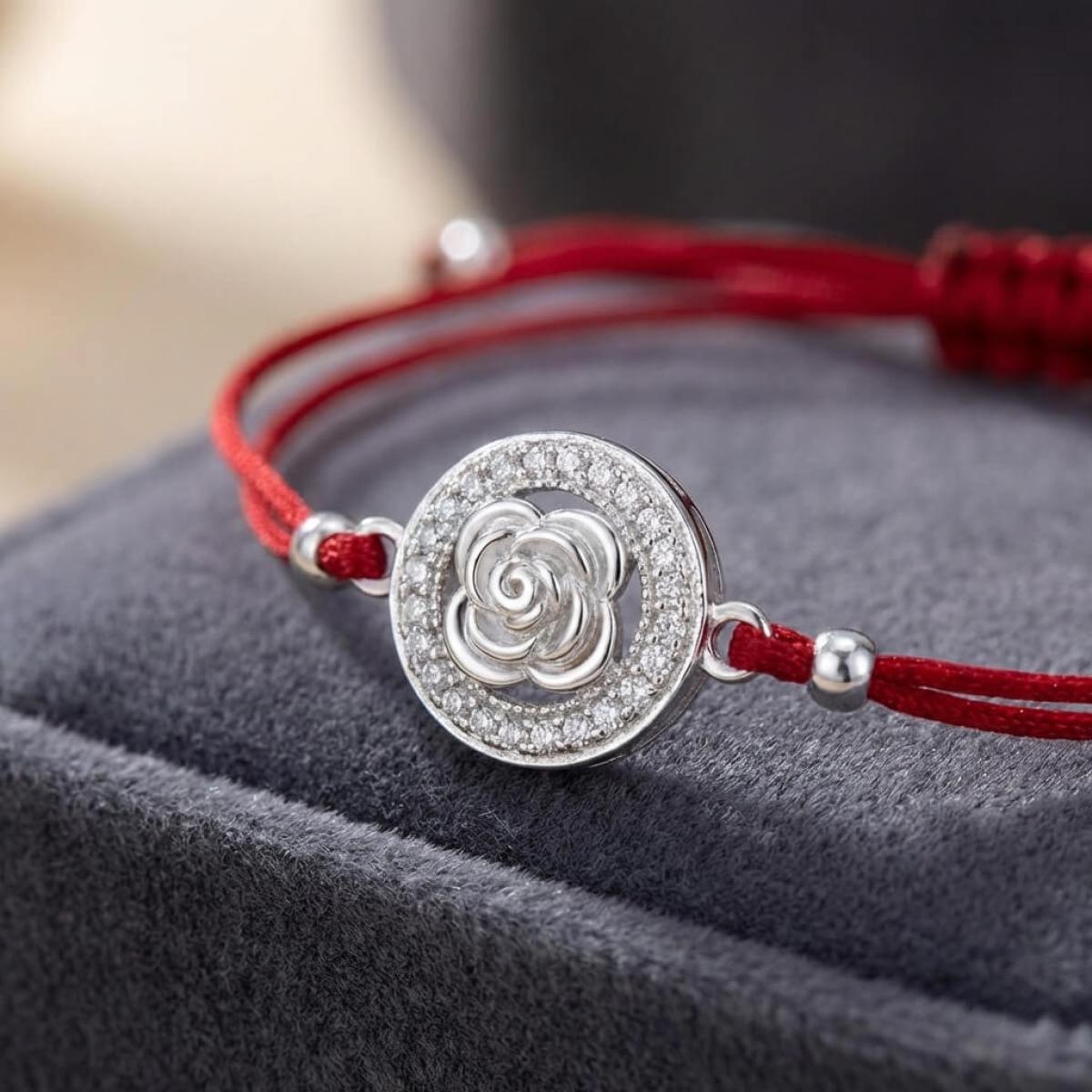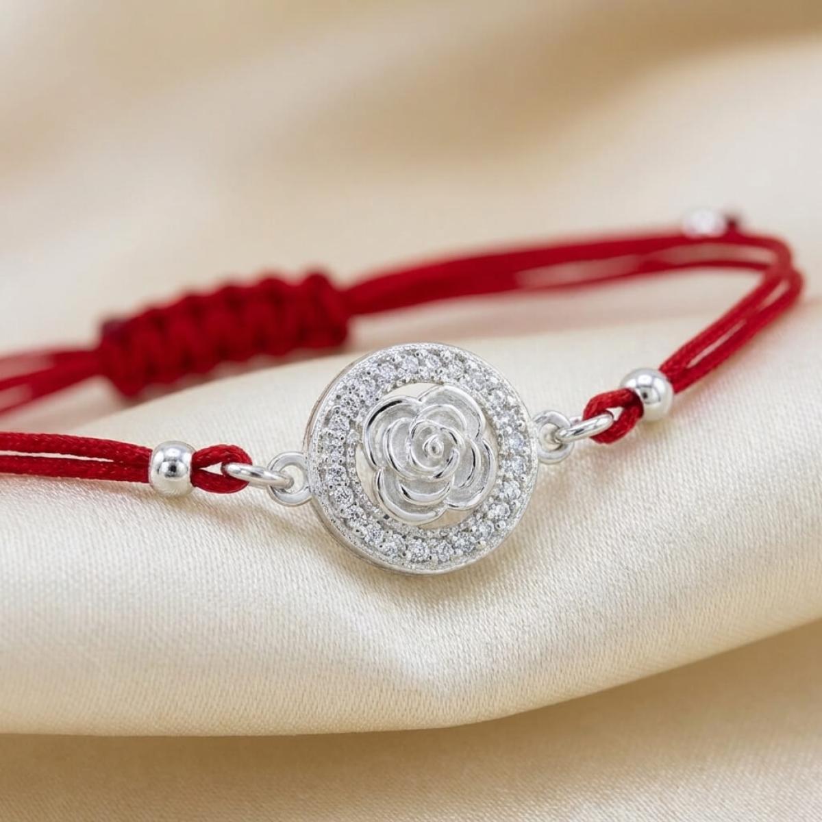Гривна с червен конец и сребърен елемент роза с циркони