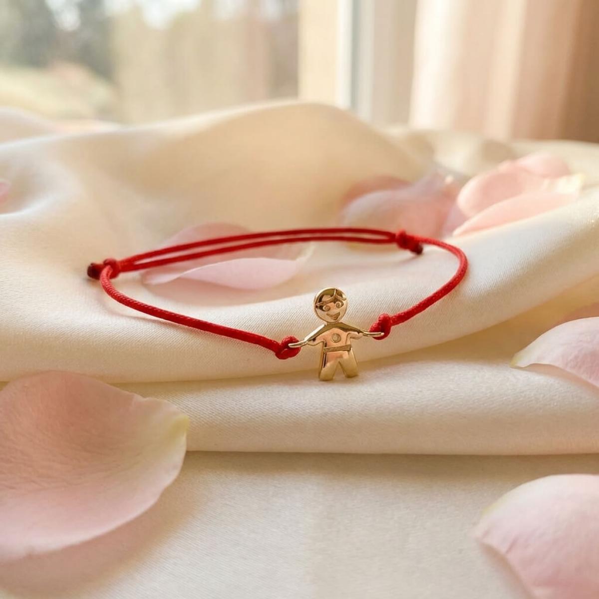 За да отпразнувате раждането на нов член на семейството, особено ако той е от мъжки пол, ние ви предлагаме да заложите на тази стилна гривна с червен конец и златен елемент „момче”. Декоративният детайл е изработен от 14-каратово злато и придава на амулета стилно и представително излъчване. Регулируемият размер на изделието го прави подходящо както за майката, така и за нейната мъжка рожба.