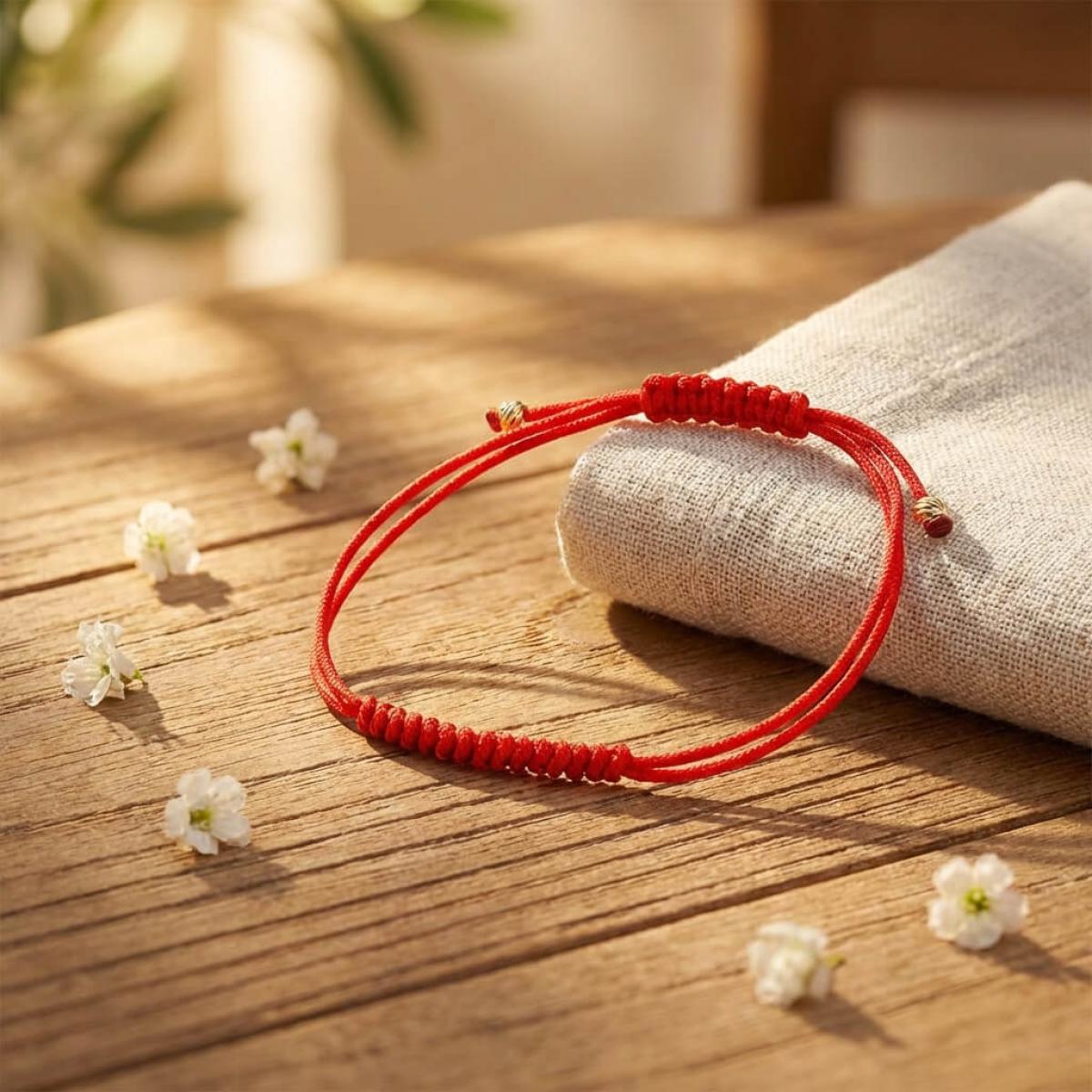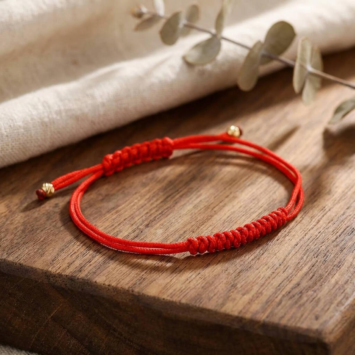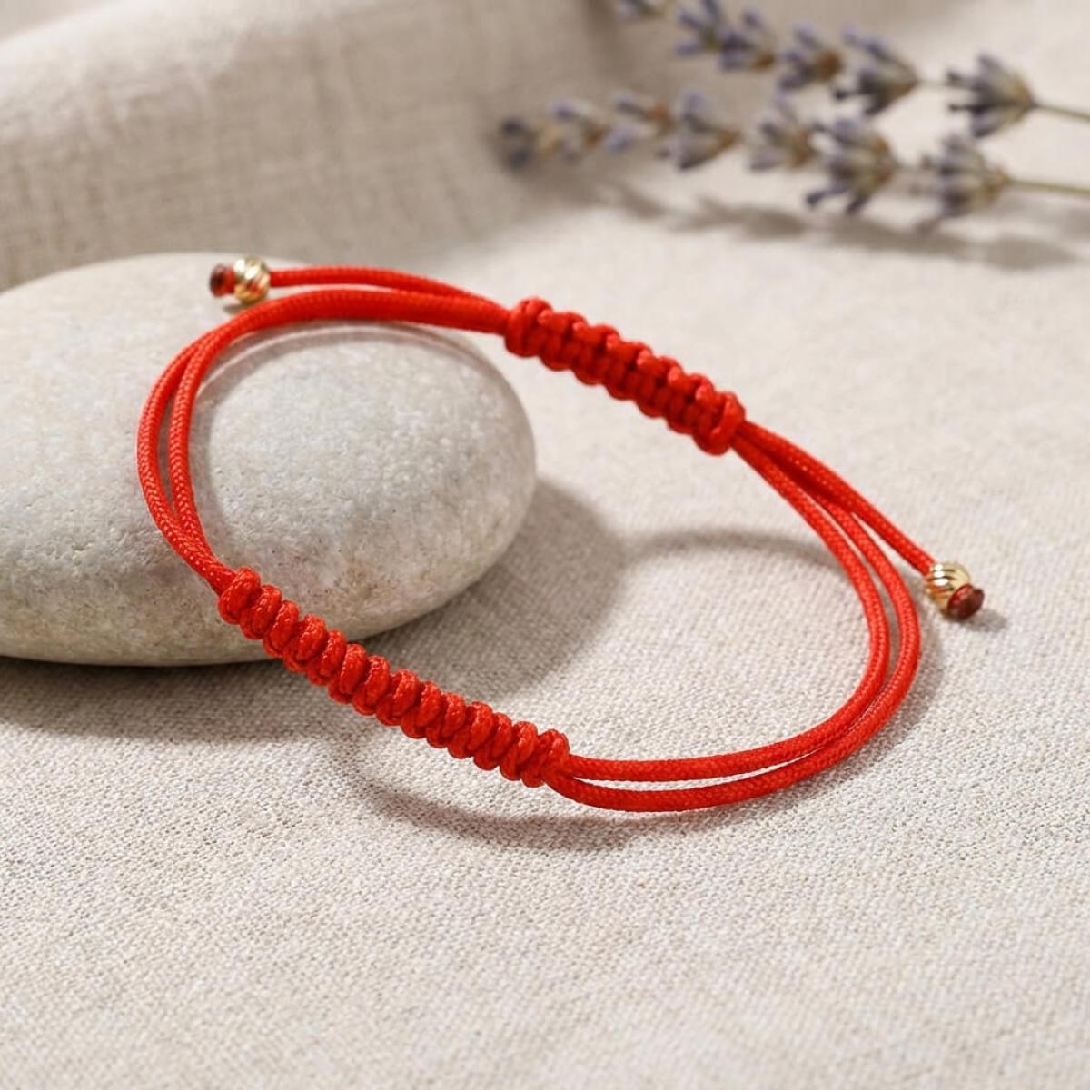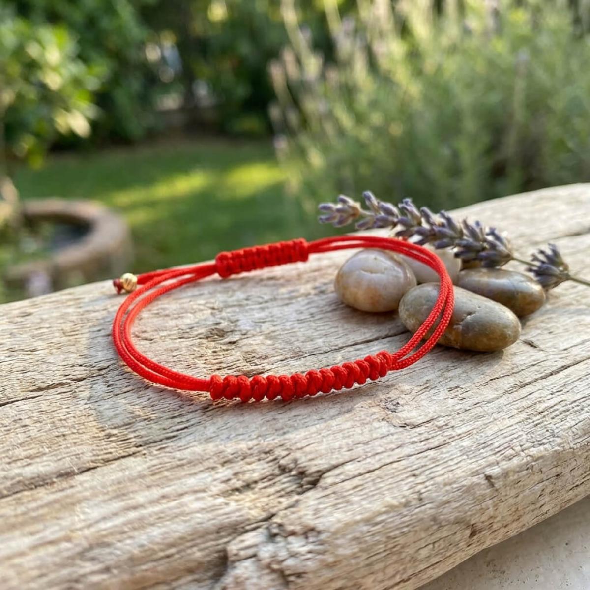 Гривна с червен конец и 14 карата златни топчета