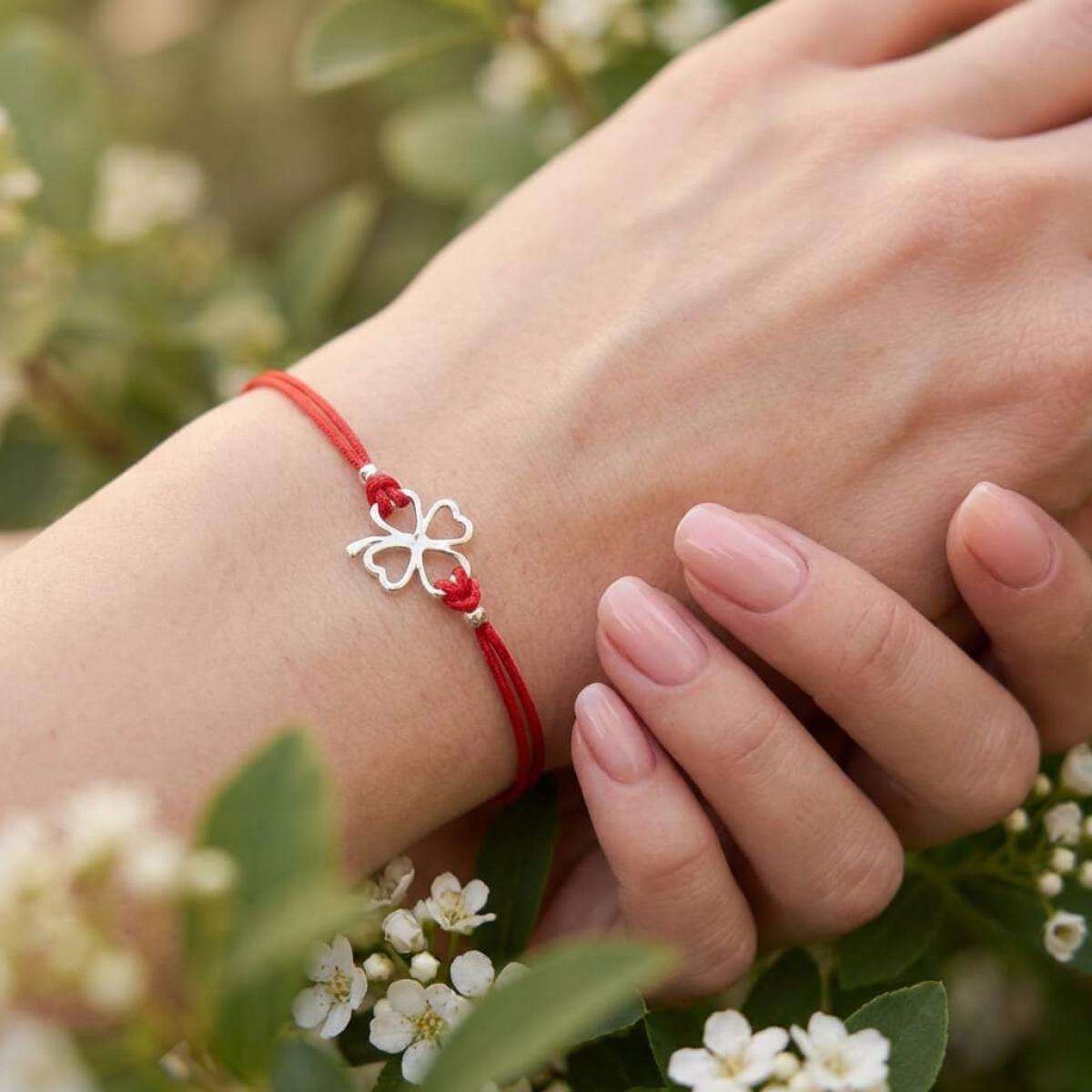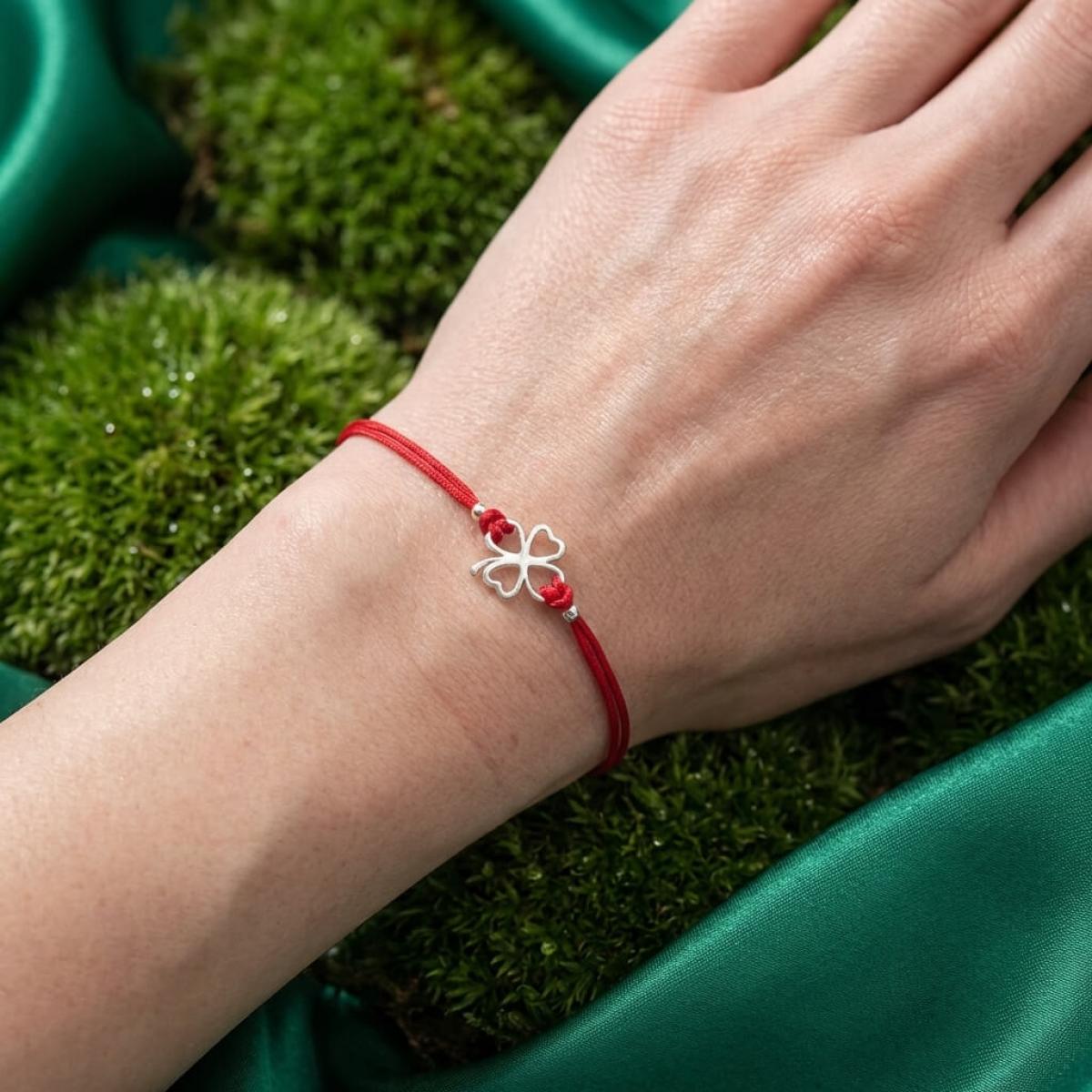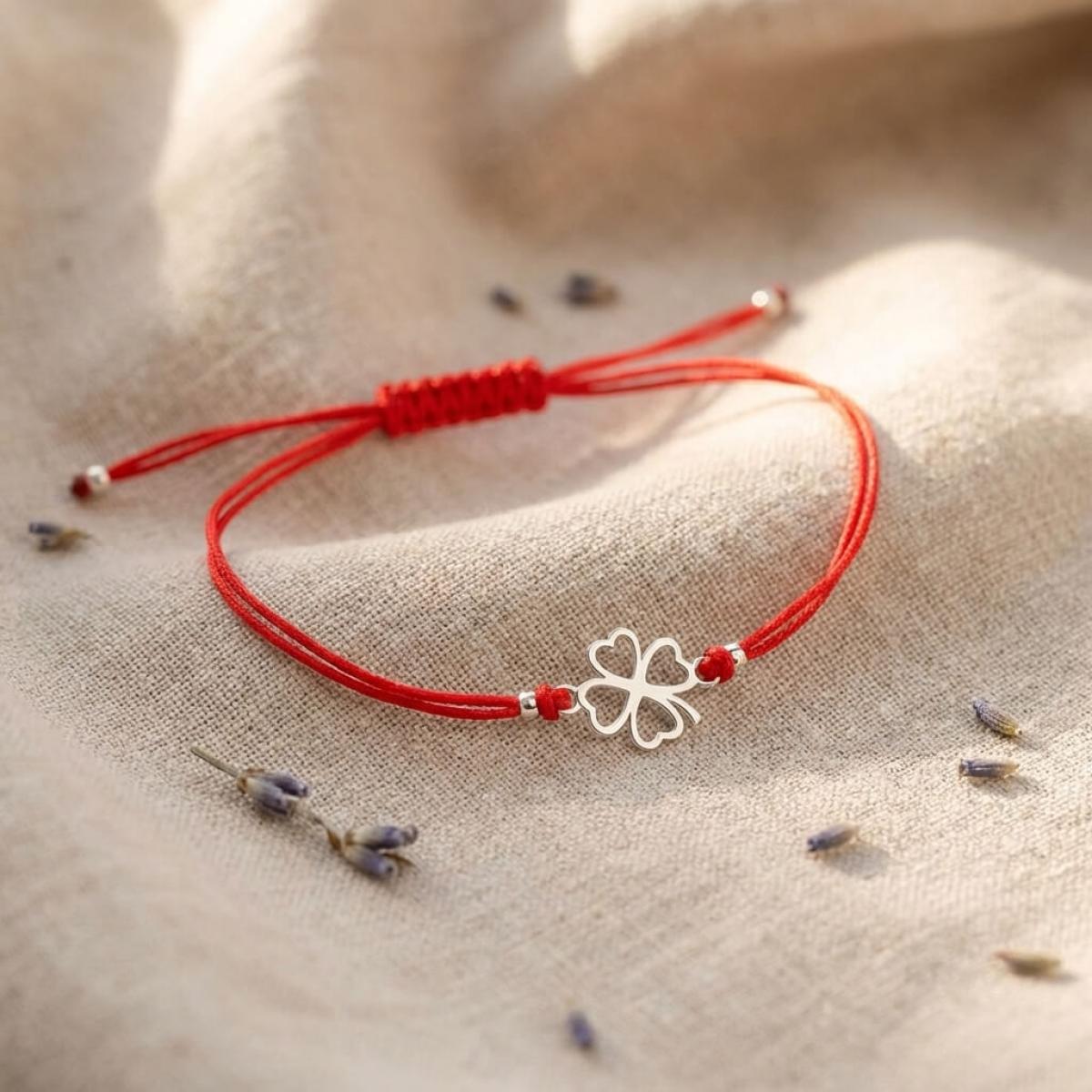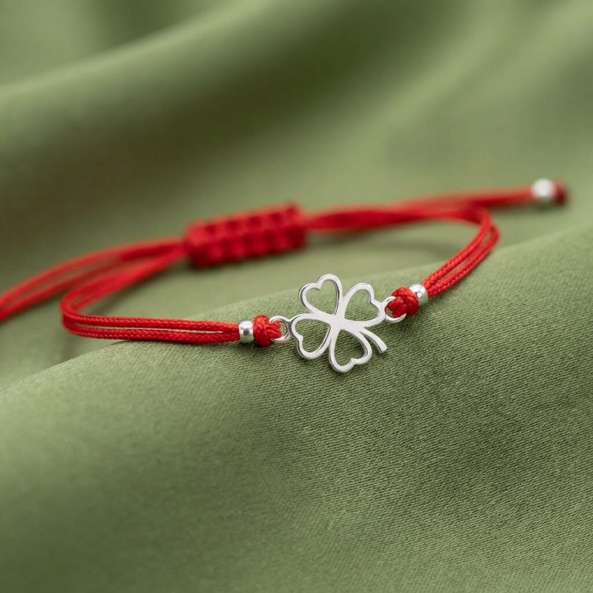 Гривна с червен конец и сребърен елемент детелинка