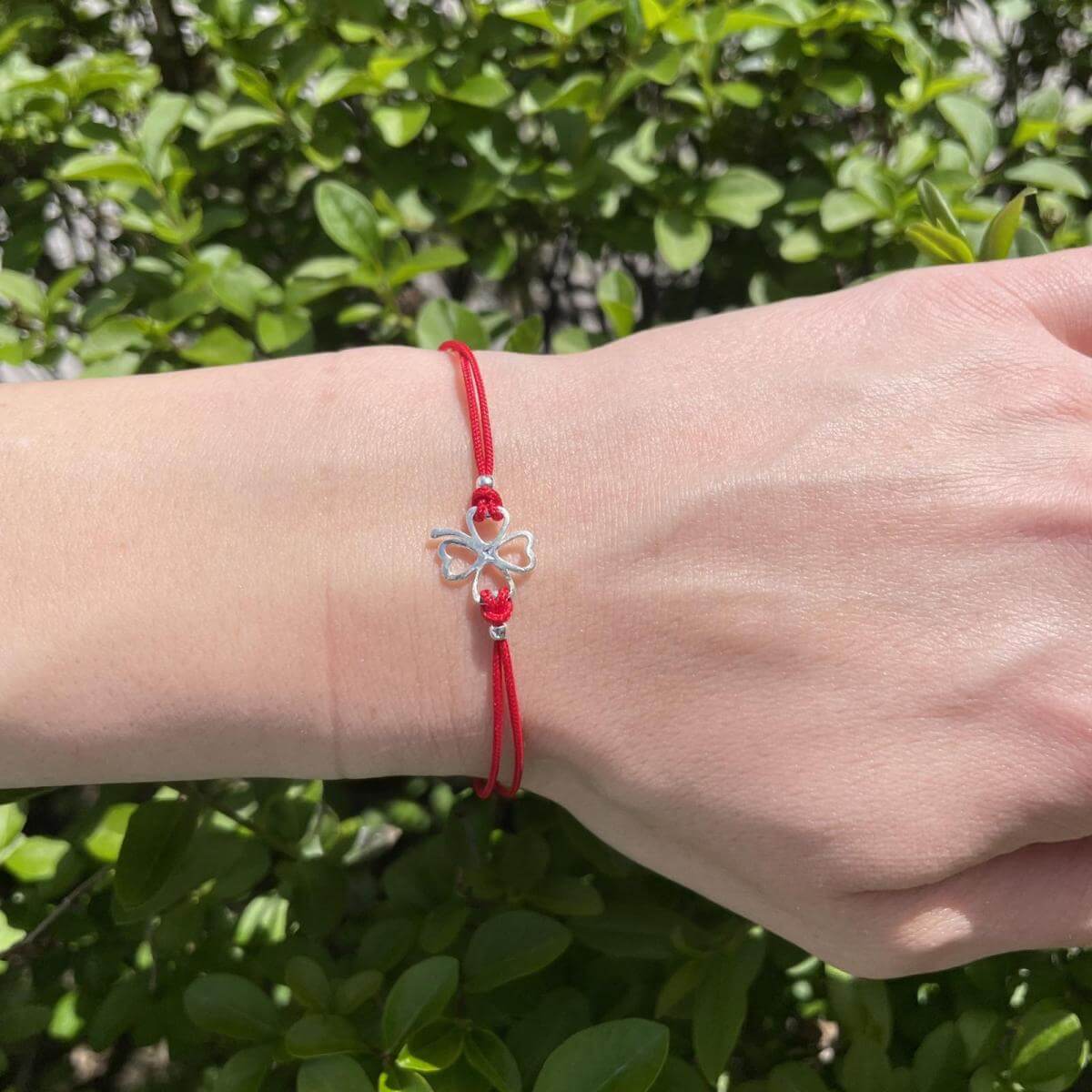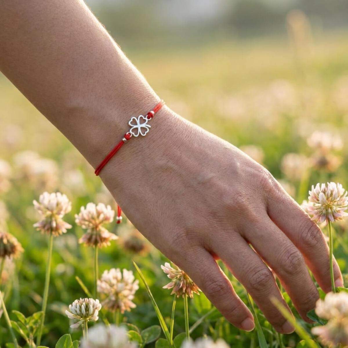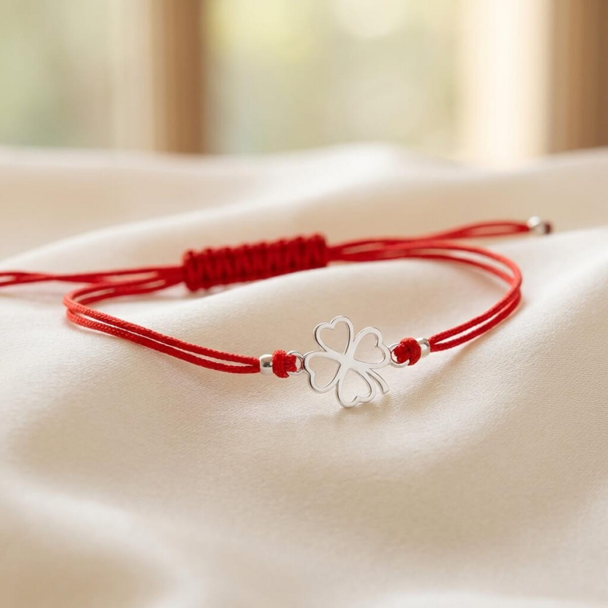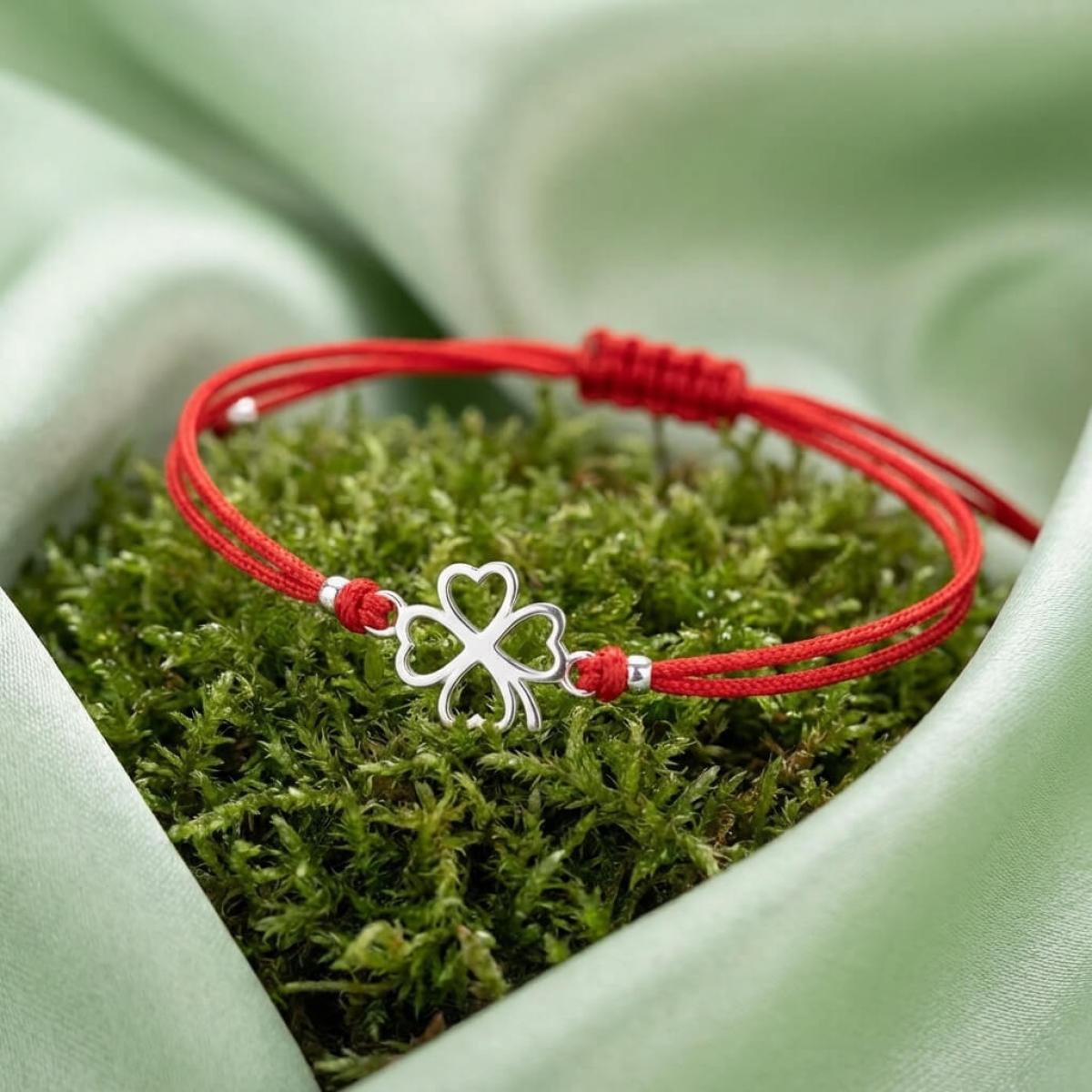 Гривна с червен конец и сребърен елемент детелинка