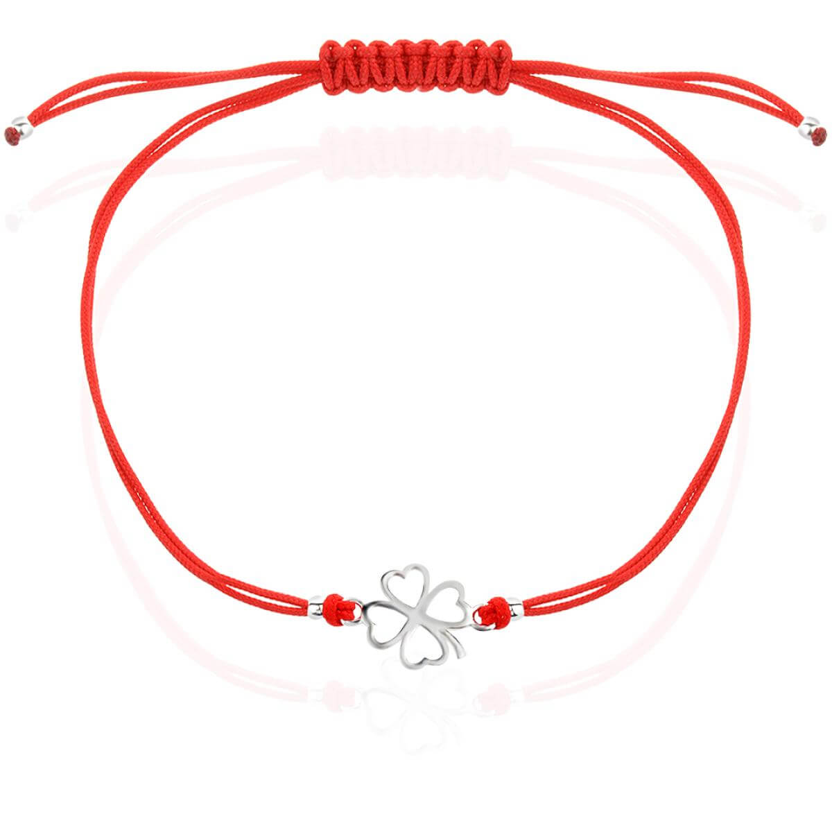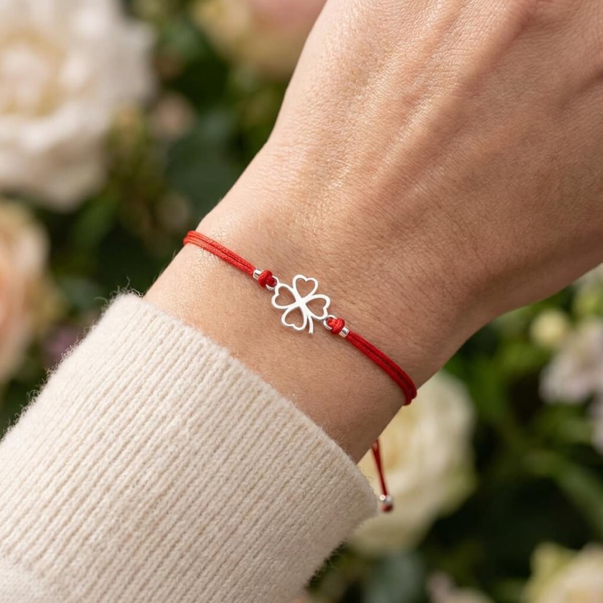 За декоративен елемент на гривната с червен конец избрахме една изящно оформена четирилистна детелинка. Поради факта, че детелините с четири листа се срещат твърде рядко, те са приети за символ на късмета. Късметът е онзи фактор, който определя нашия успех и щастие. Четирилистната детелина присъства неслучайно в голяма част от нашите бижута.