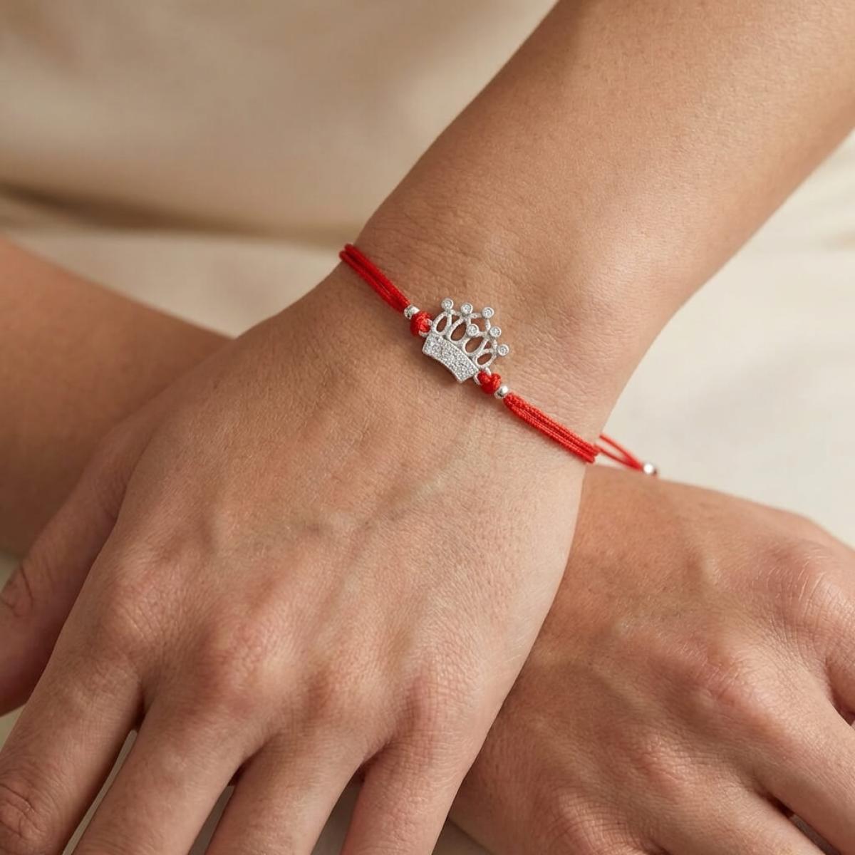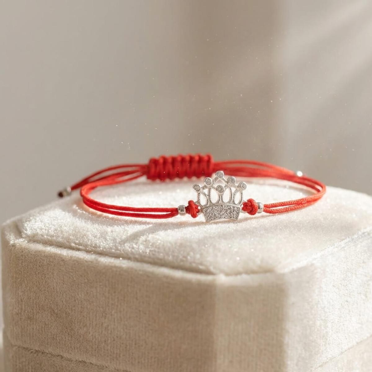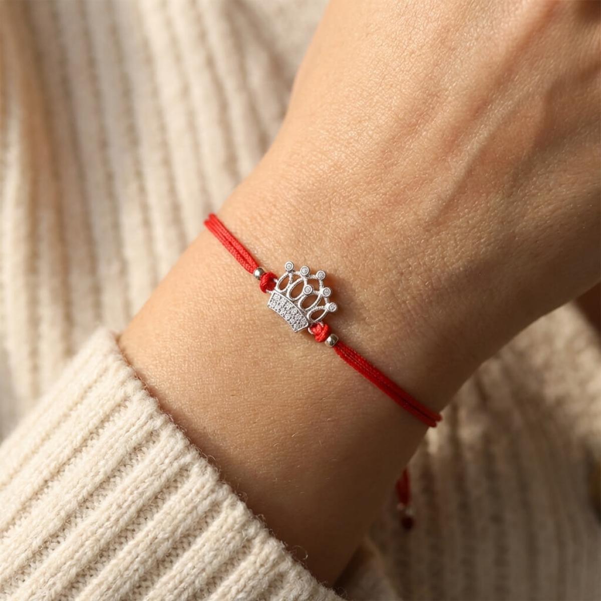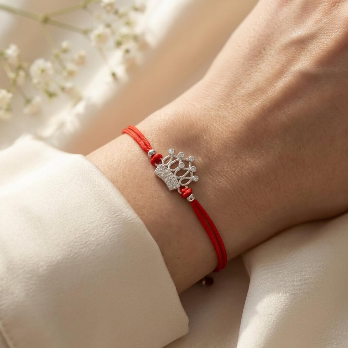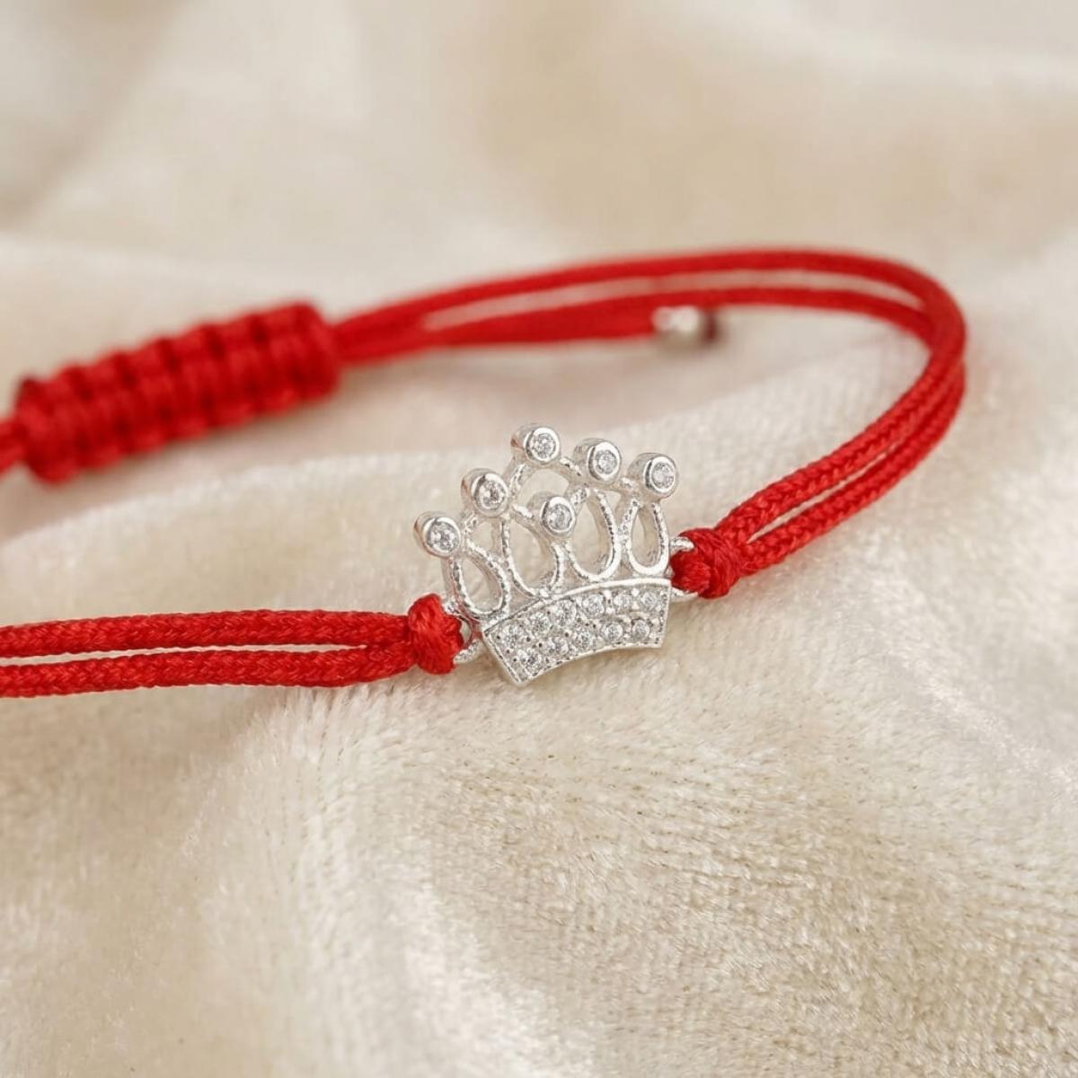 Гривна с червен конец и сребърен елемент корона с бели циркони