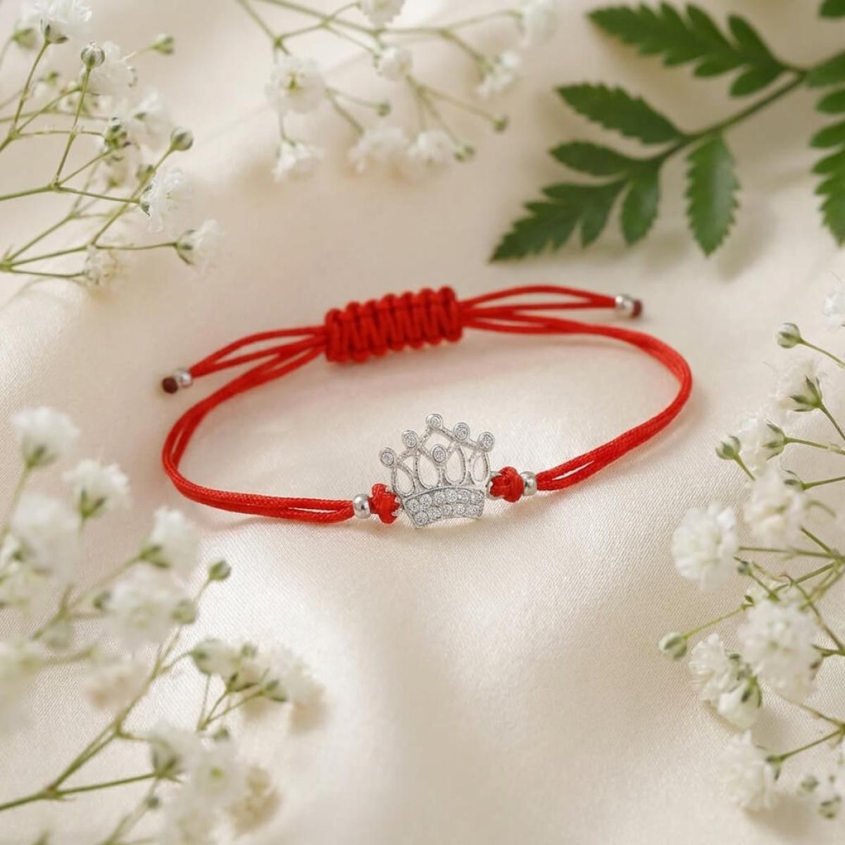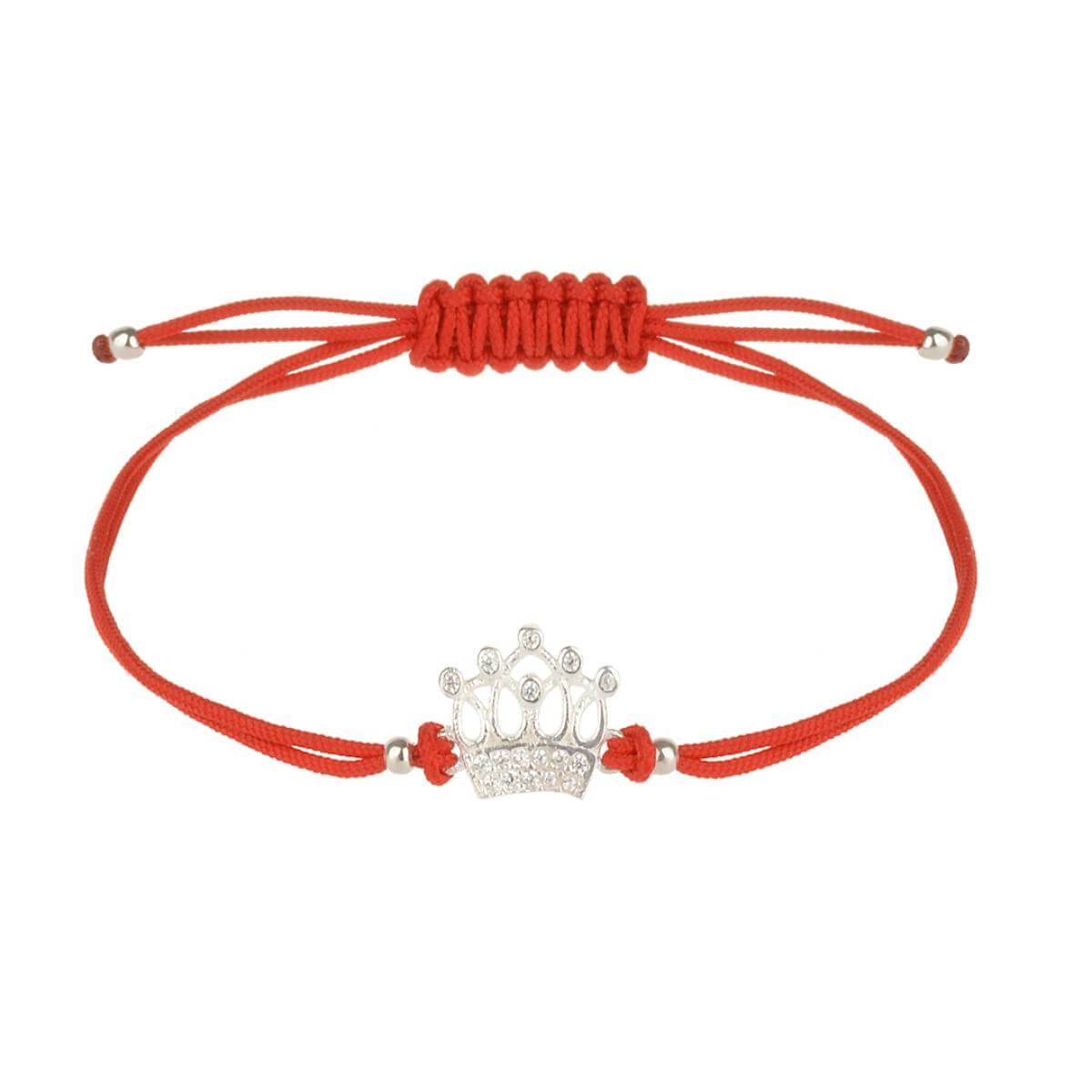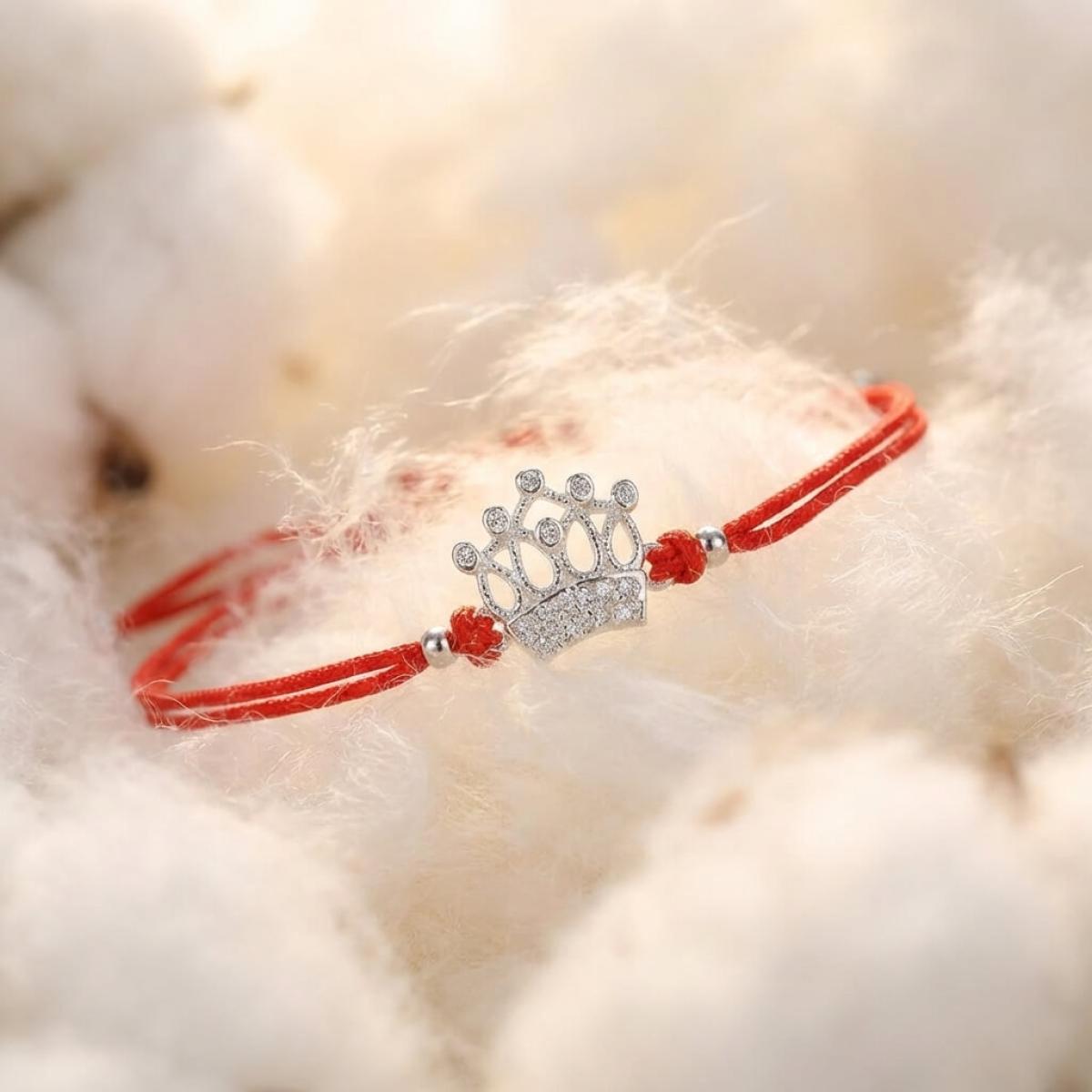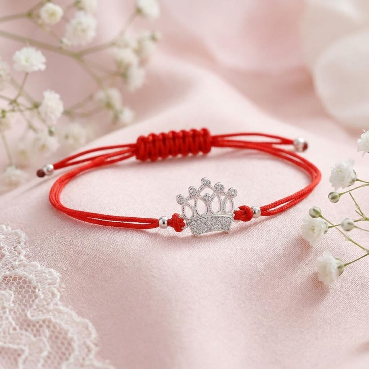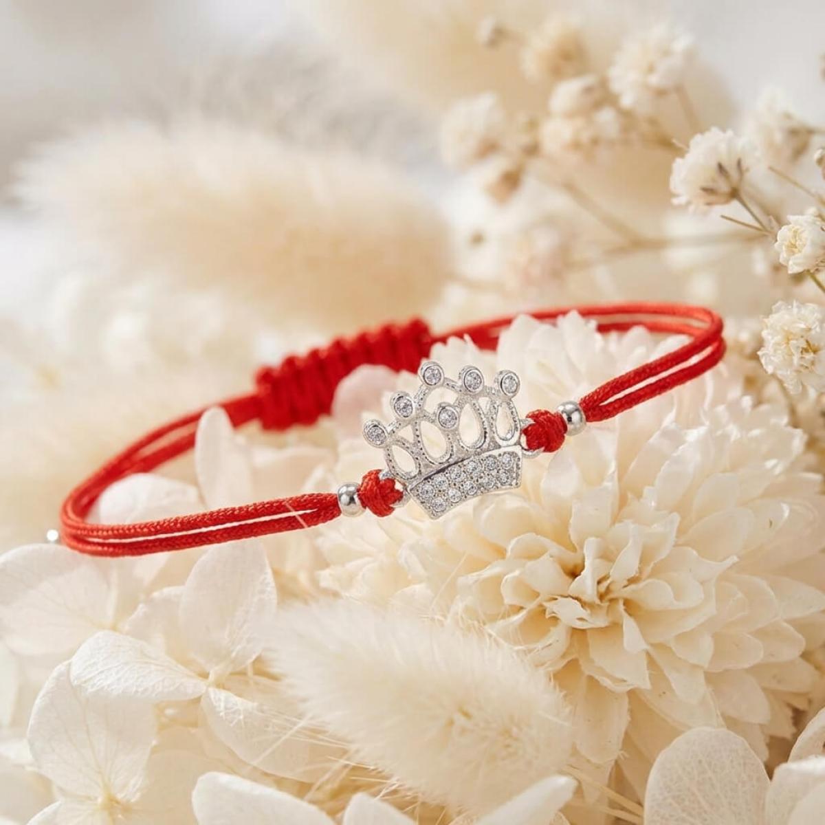 Гривна с червен конец и сребърен елемент корона с бели циркони
