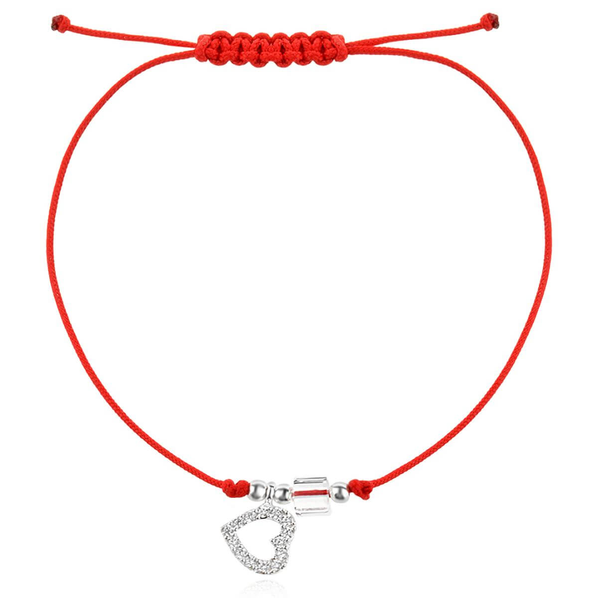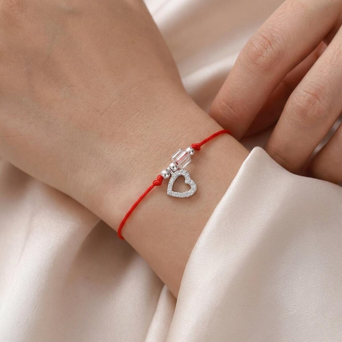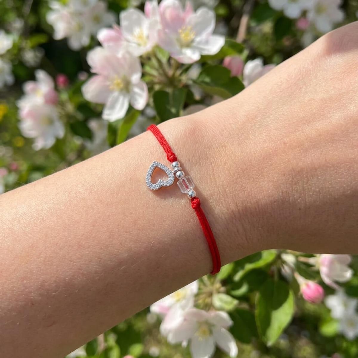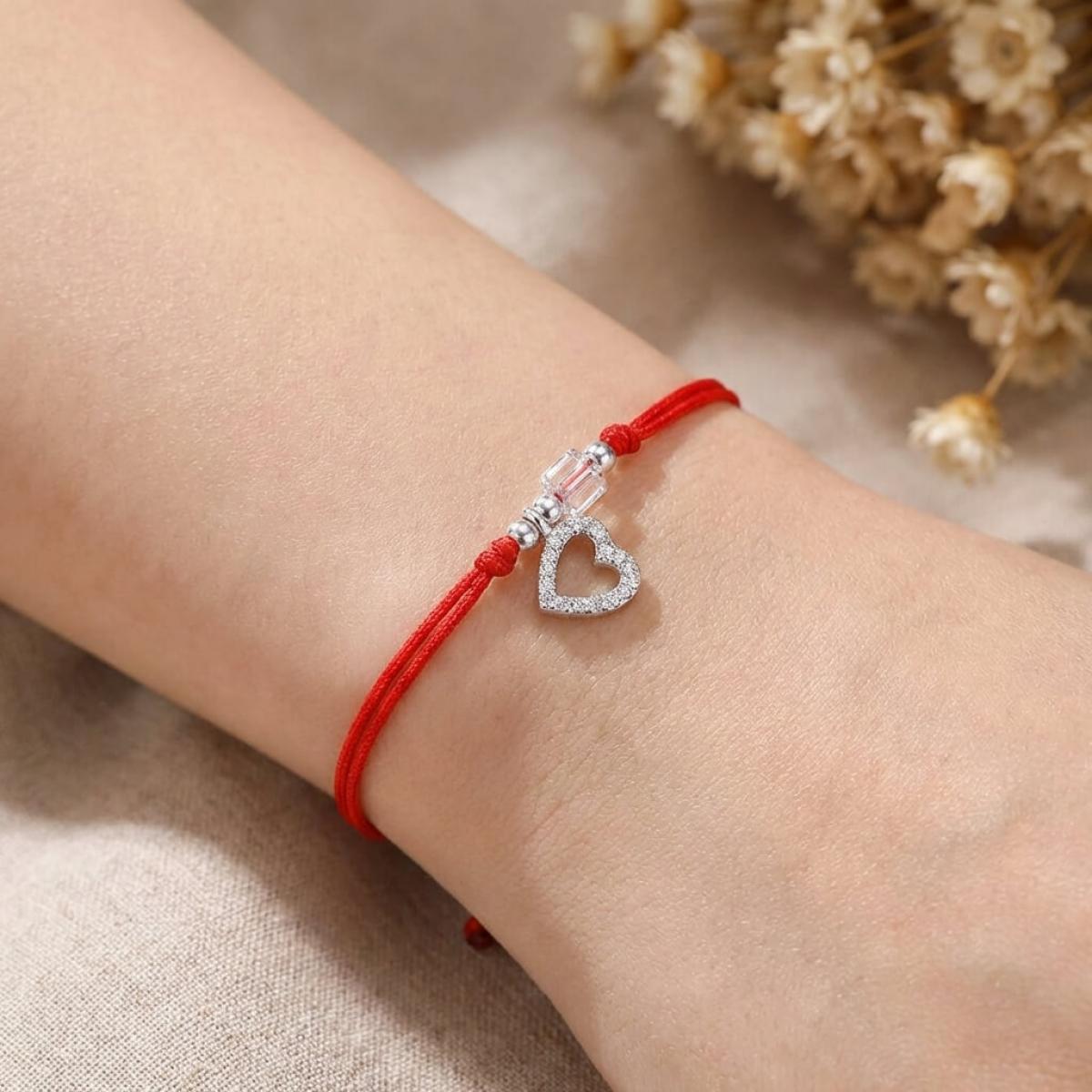 Гривна с червен конец сребърен елемент сърце и бели мъниста