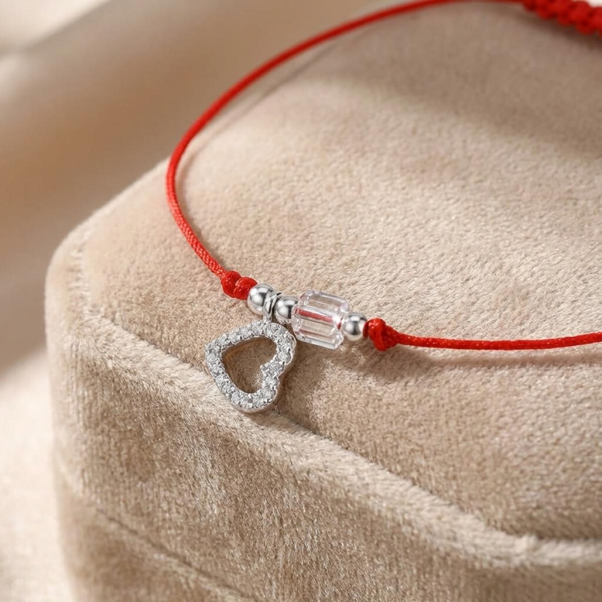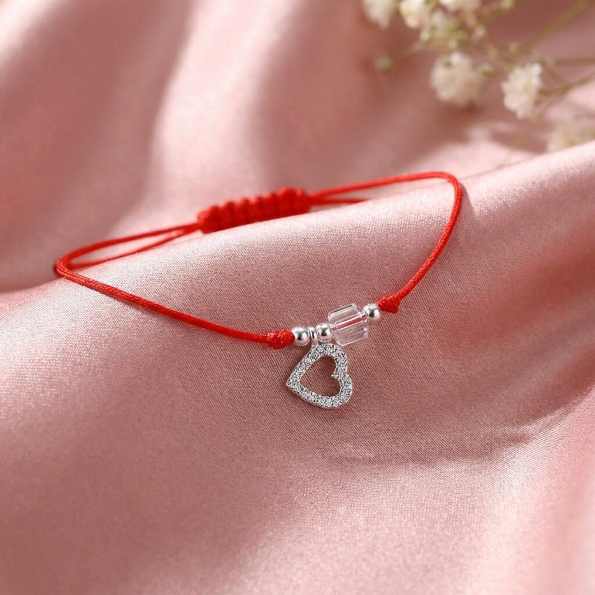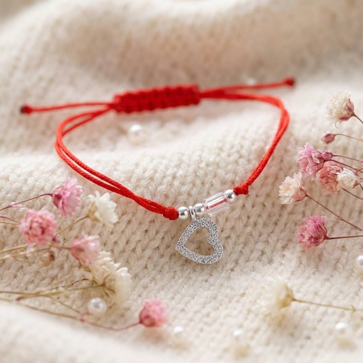 Гривна с червен конец сребърен елемент сърце и бели мъниста