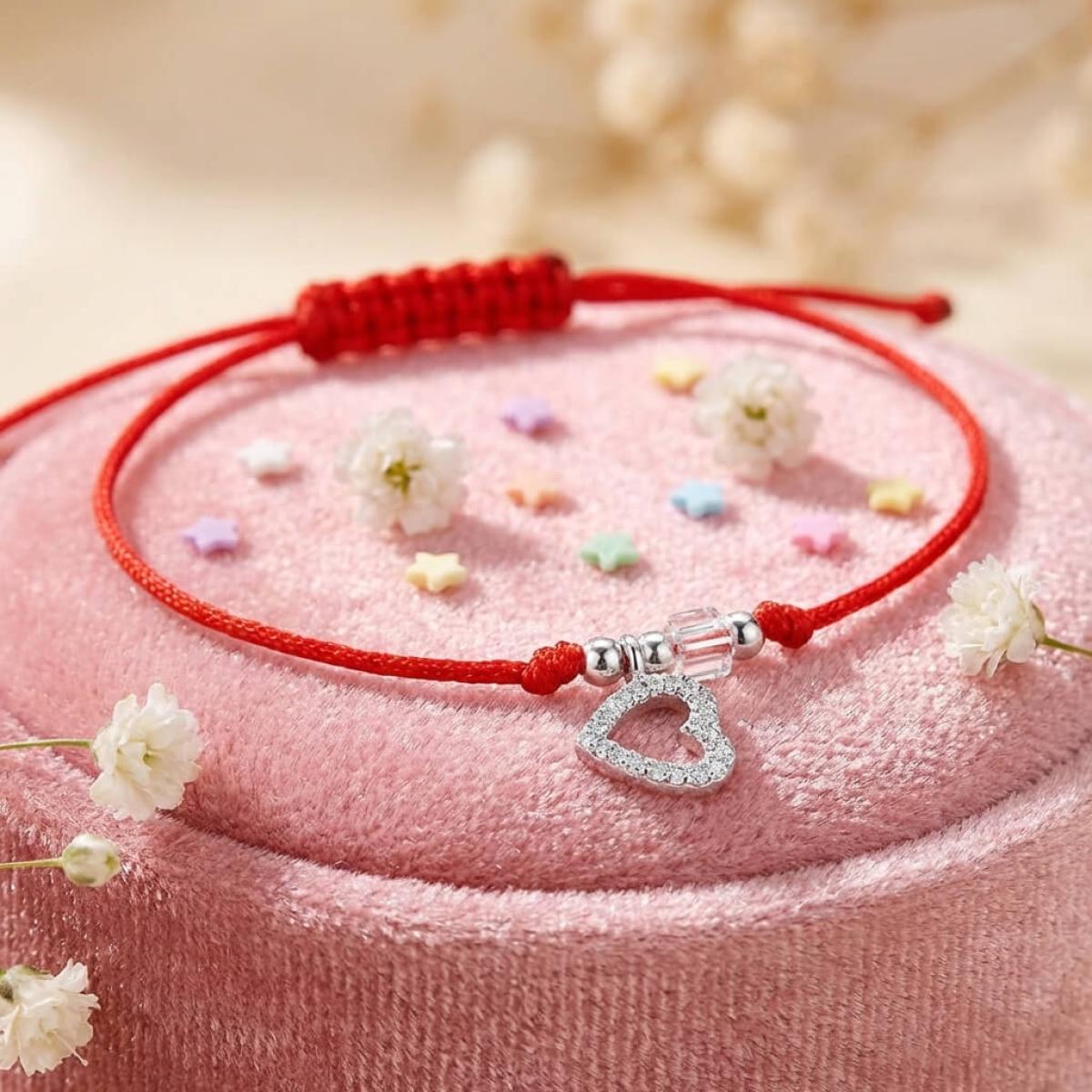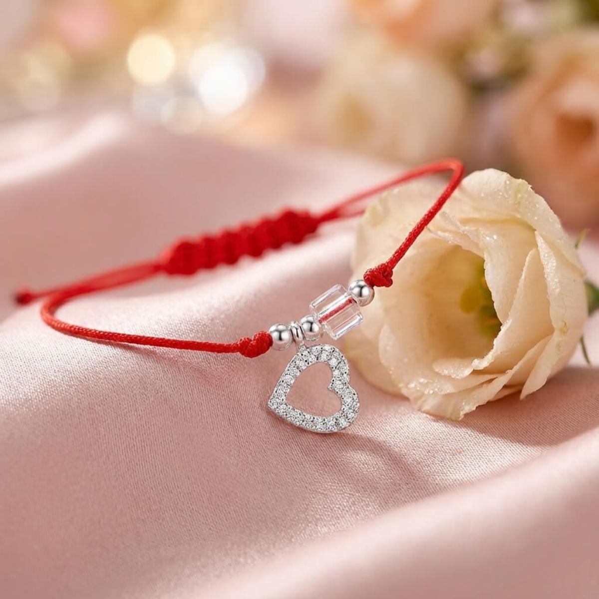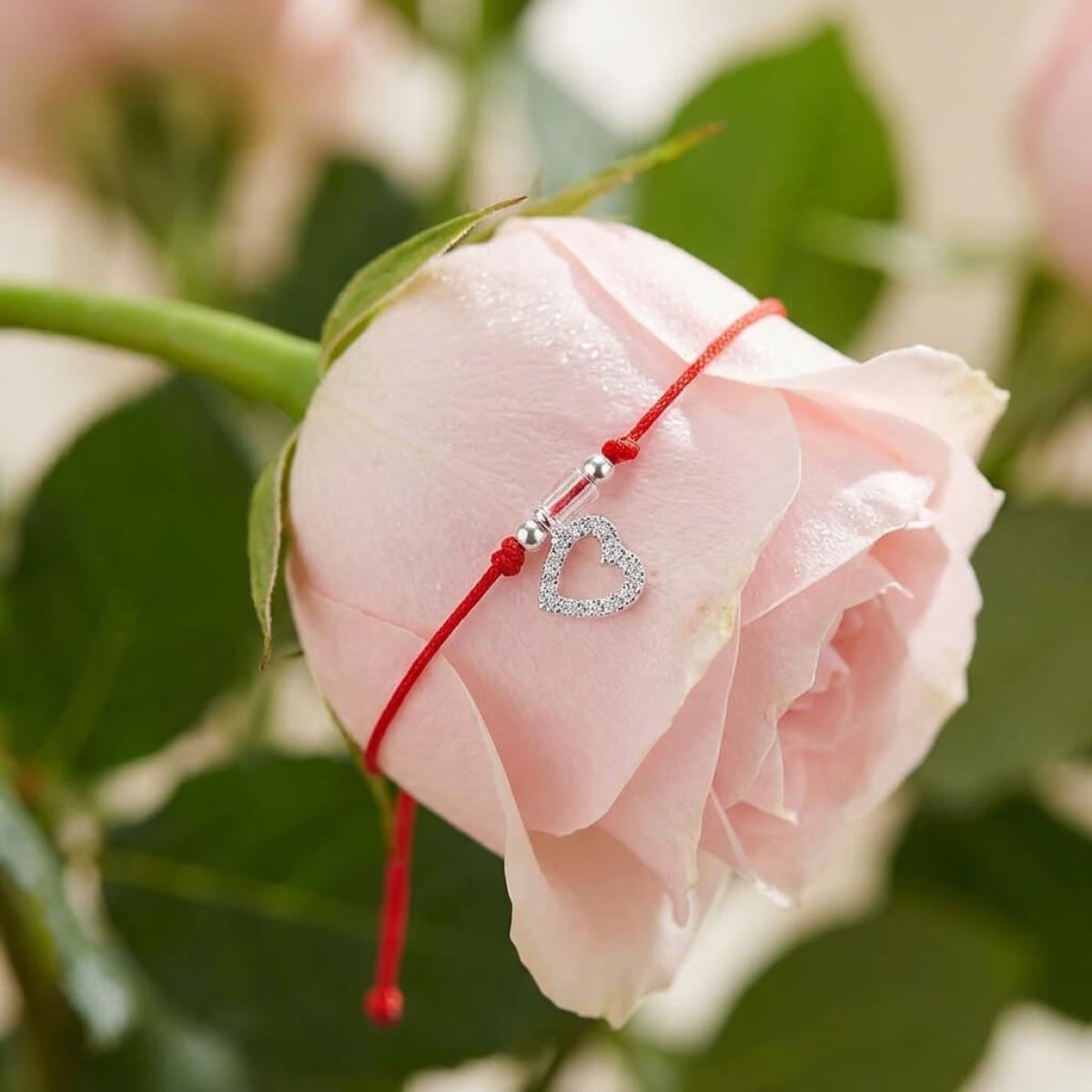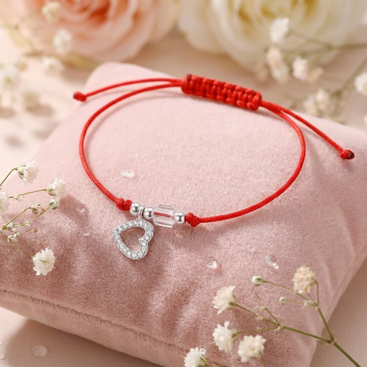 Гривна с червен конец сребърен елемент сърце и бели мъниста