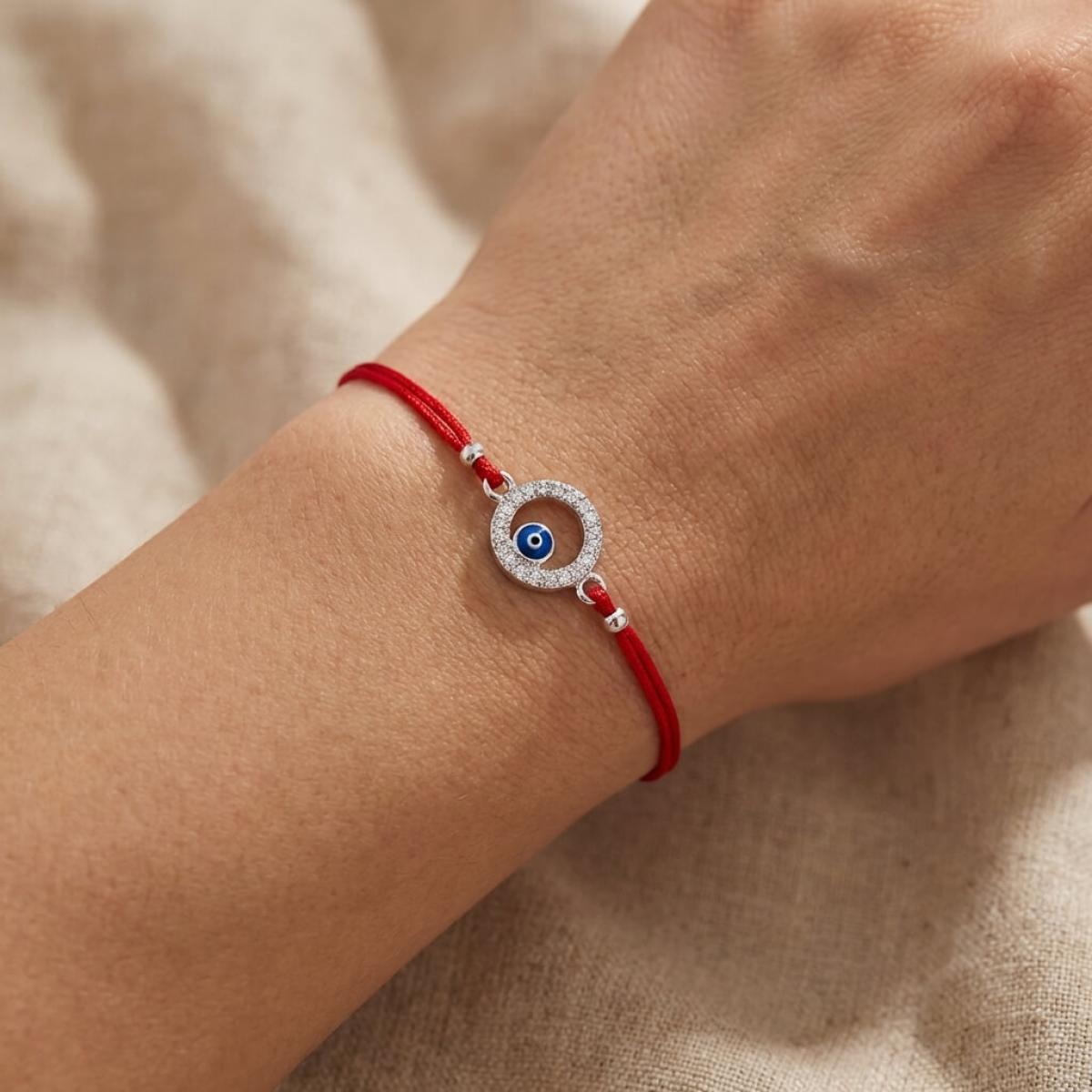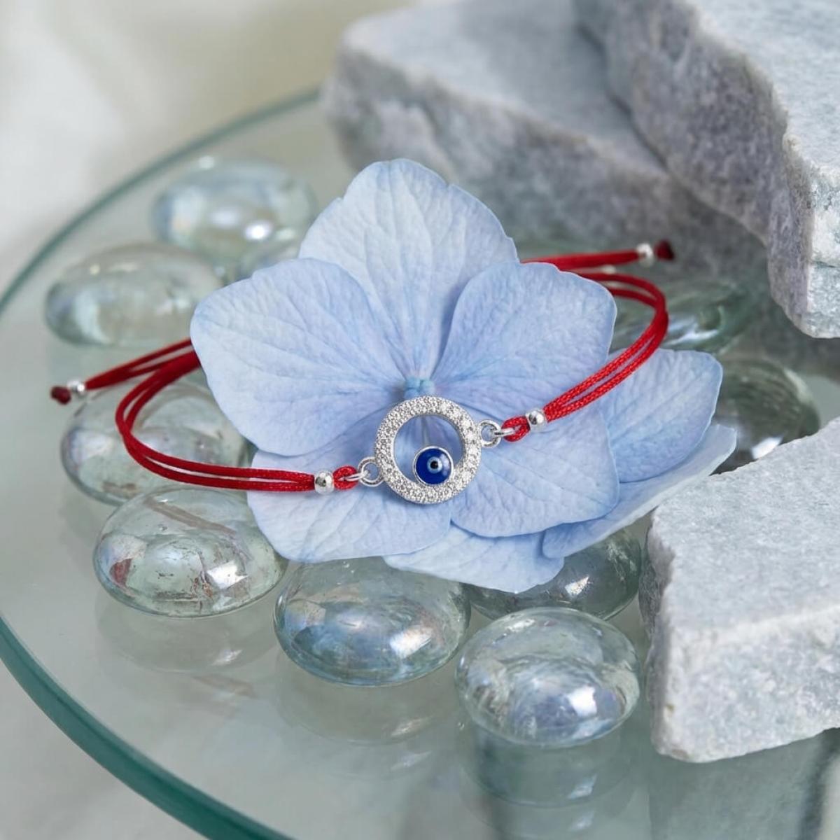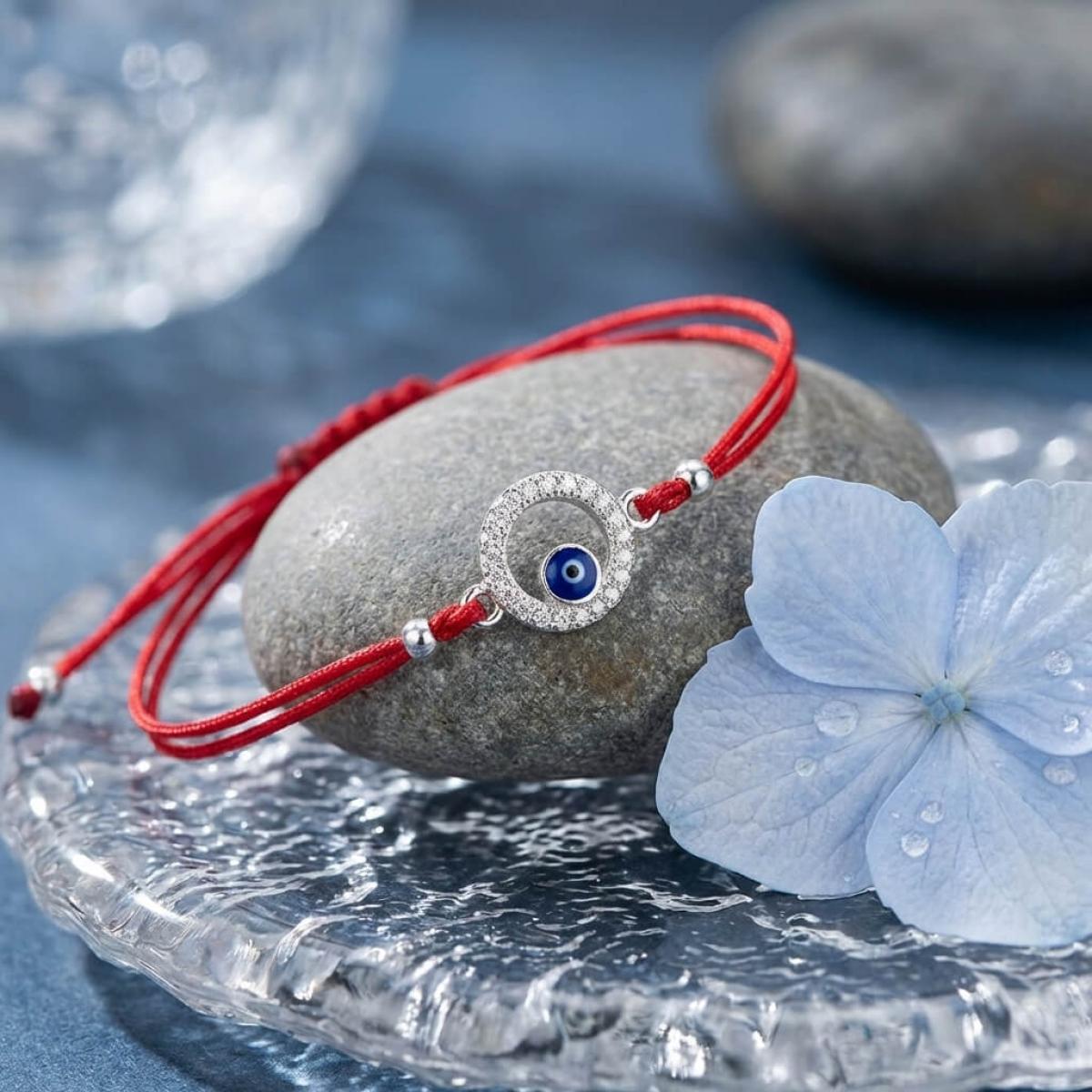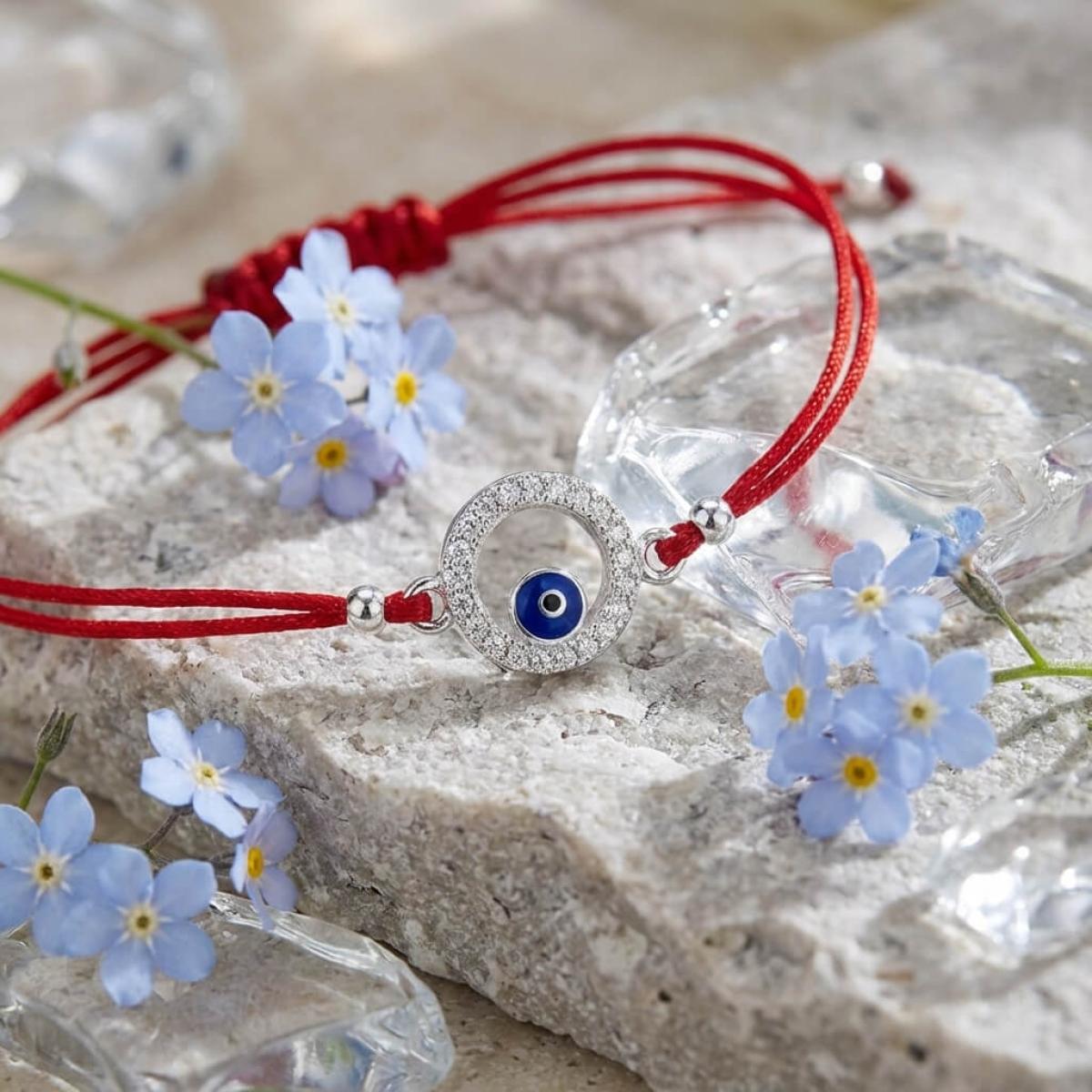 Комбинацията от сребърен кръг и синьо око е не просто красива. По-важното е, че чрез нея нашите дизайнери са пресъздали запазилата се до днес вяра в окултното. Конецът в червено е добре известен амулет, защитаващ човека, който го носи на ръката си от лоши очи и нежелани енергийни въздействия.