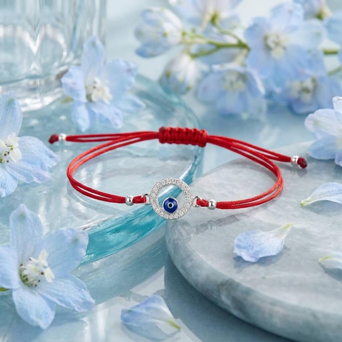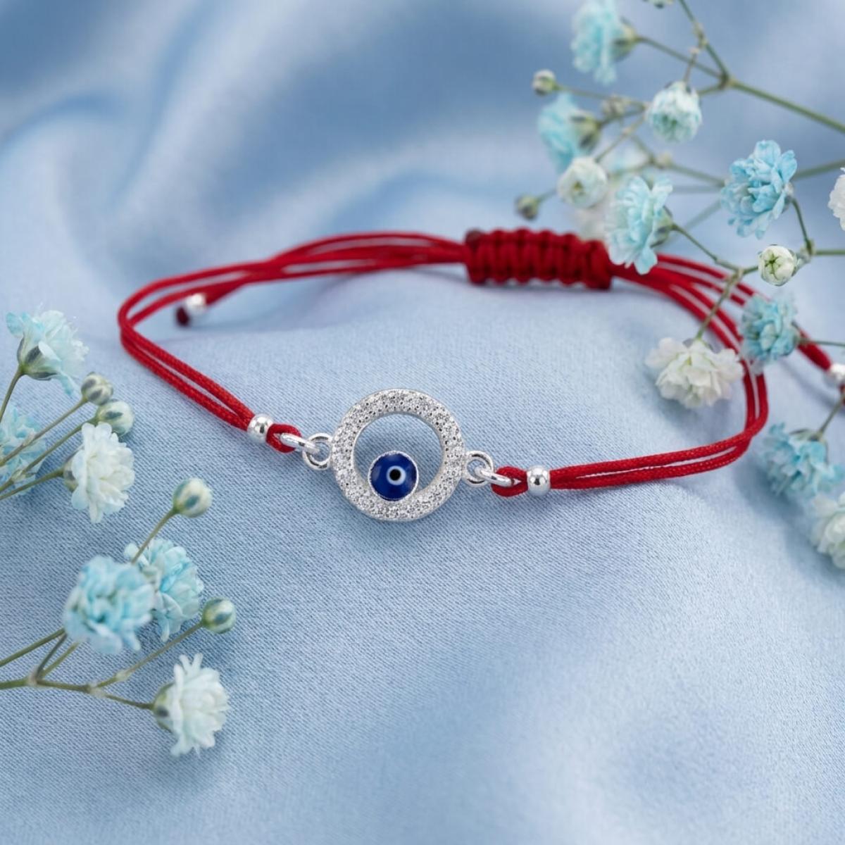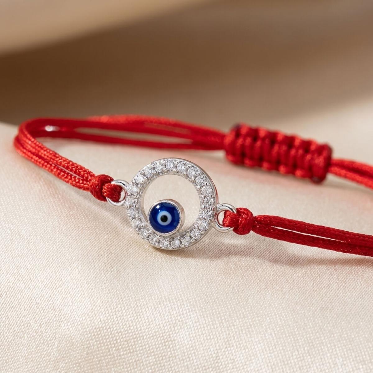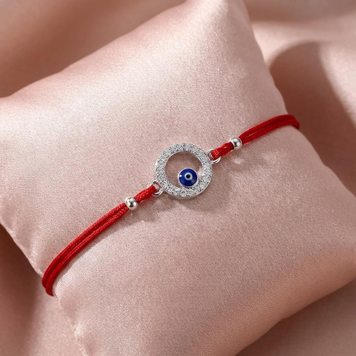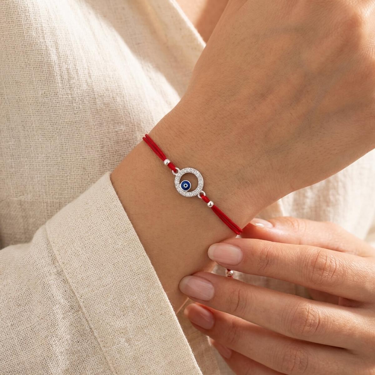 Комбинацията от сребърен кръг и синьо око е не просто красива. По-важното е, че чрез нея нашите дизайнери са пресъздали запазилата се до днес вяра в окултното. Конецът в червено е добре известен амулет, защитаващ човека, който го носи на ръката си от лоши очи и нежелани енергийни въздействия.
