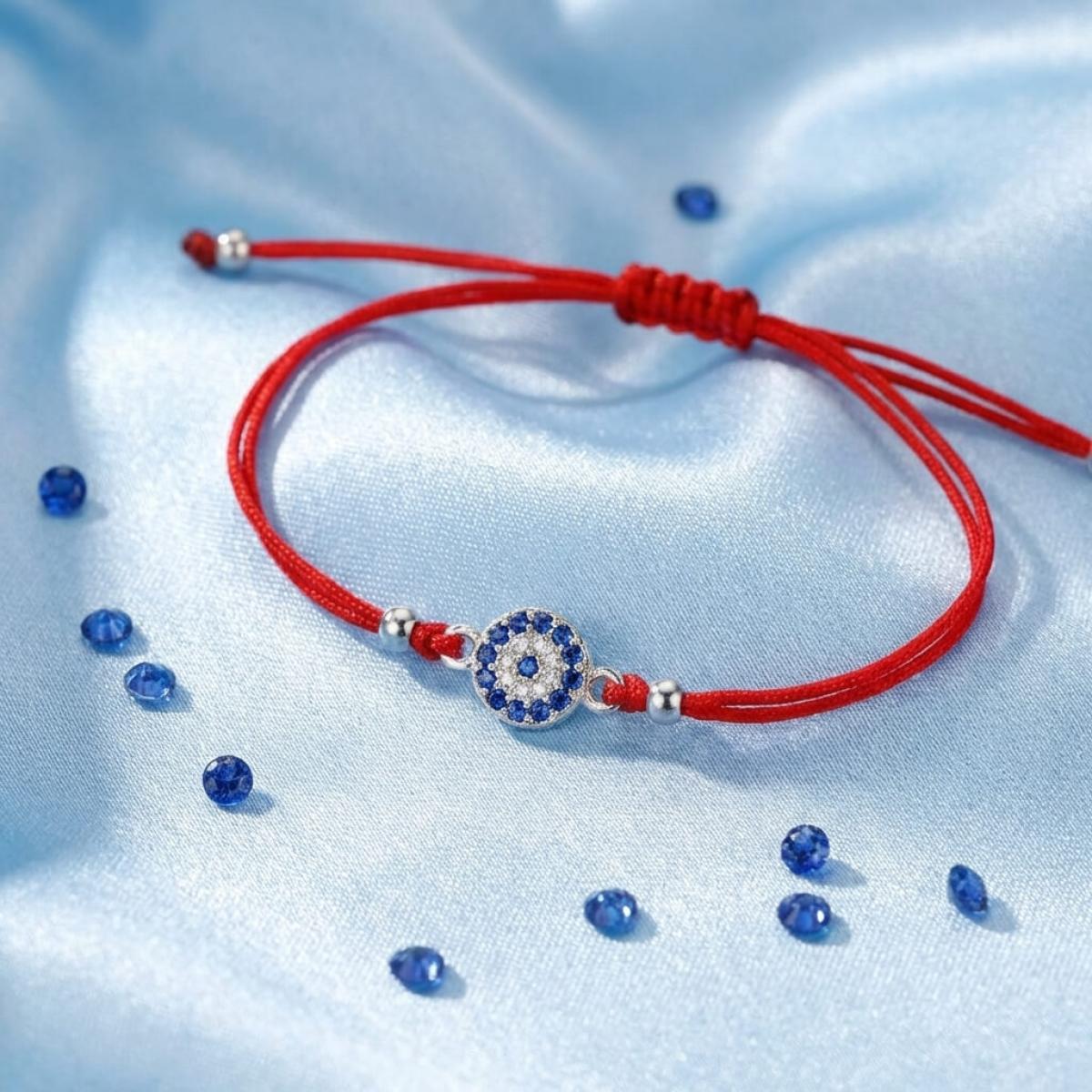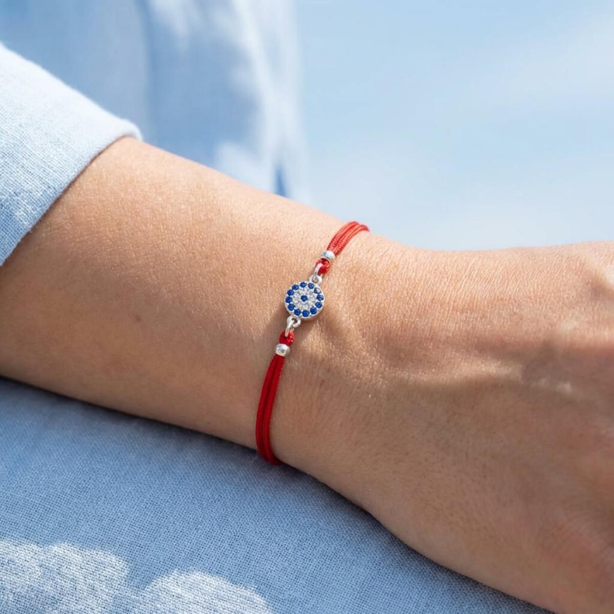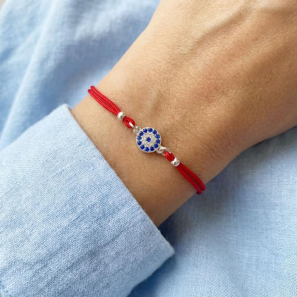 Комбинацията от сребърен кръг и синьо око е не просто красива. По-важното е, че чрез нея нашите дизайнери са пресъздали запазилата се до днес вяра в окултното. Конецът в червено е добре известен амулет, защитаващ човека, който го носи на ръката си от лоши очи и нежелани енергийни въздействия.