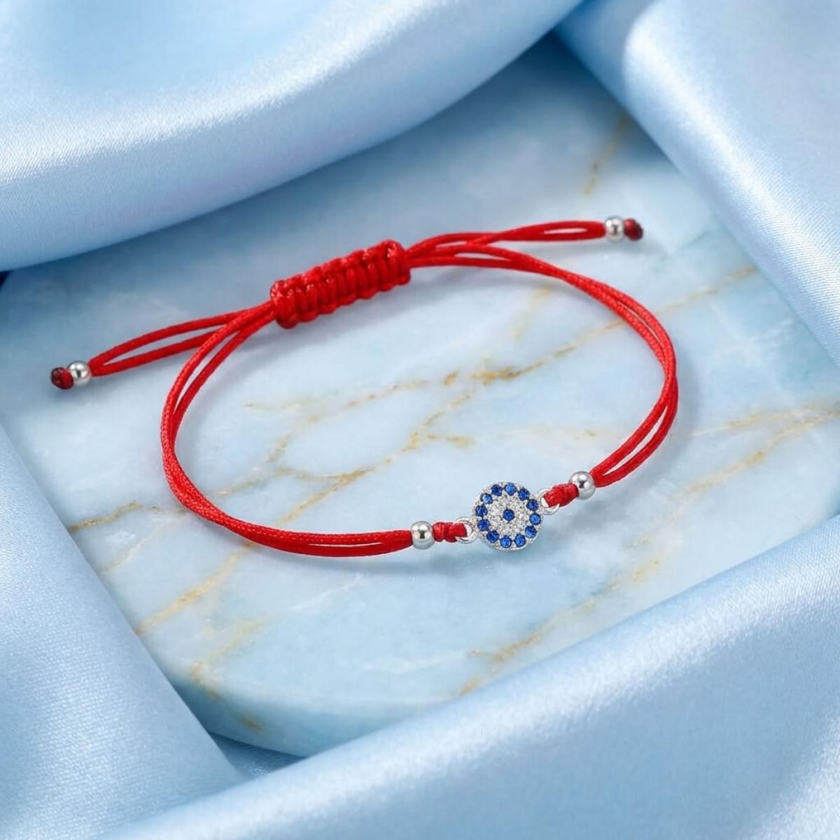 Конецът, който е физическата структура на тази гривна с червен конец и синьо око, всъщност представлява фин шнур, оплетен от висококачествени синтетични конци. Нишката е изключително здрава и с висока якост на опън. Гривната няма да се скъса и да бъде изгубена, ако неволно бъде закачена и издърпана твърде силно. Декоративният детайл е изработен от класическо сребро 925 и украсен с множество циркони.