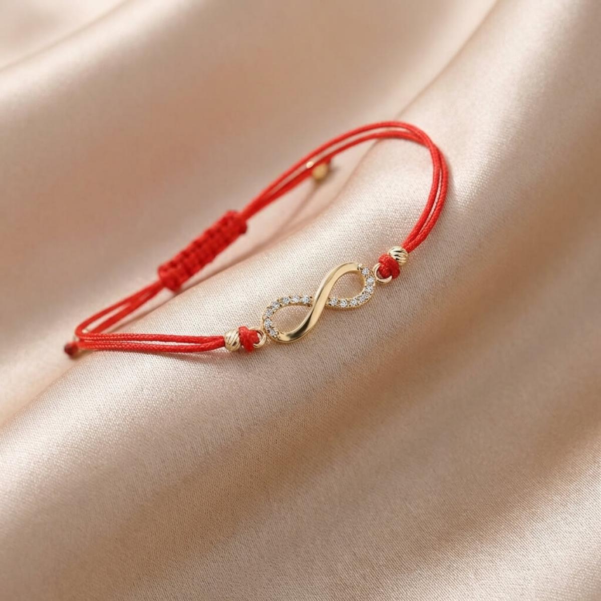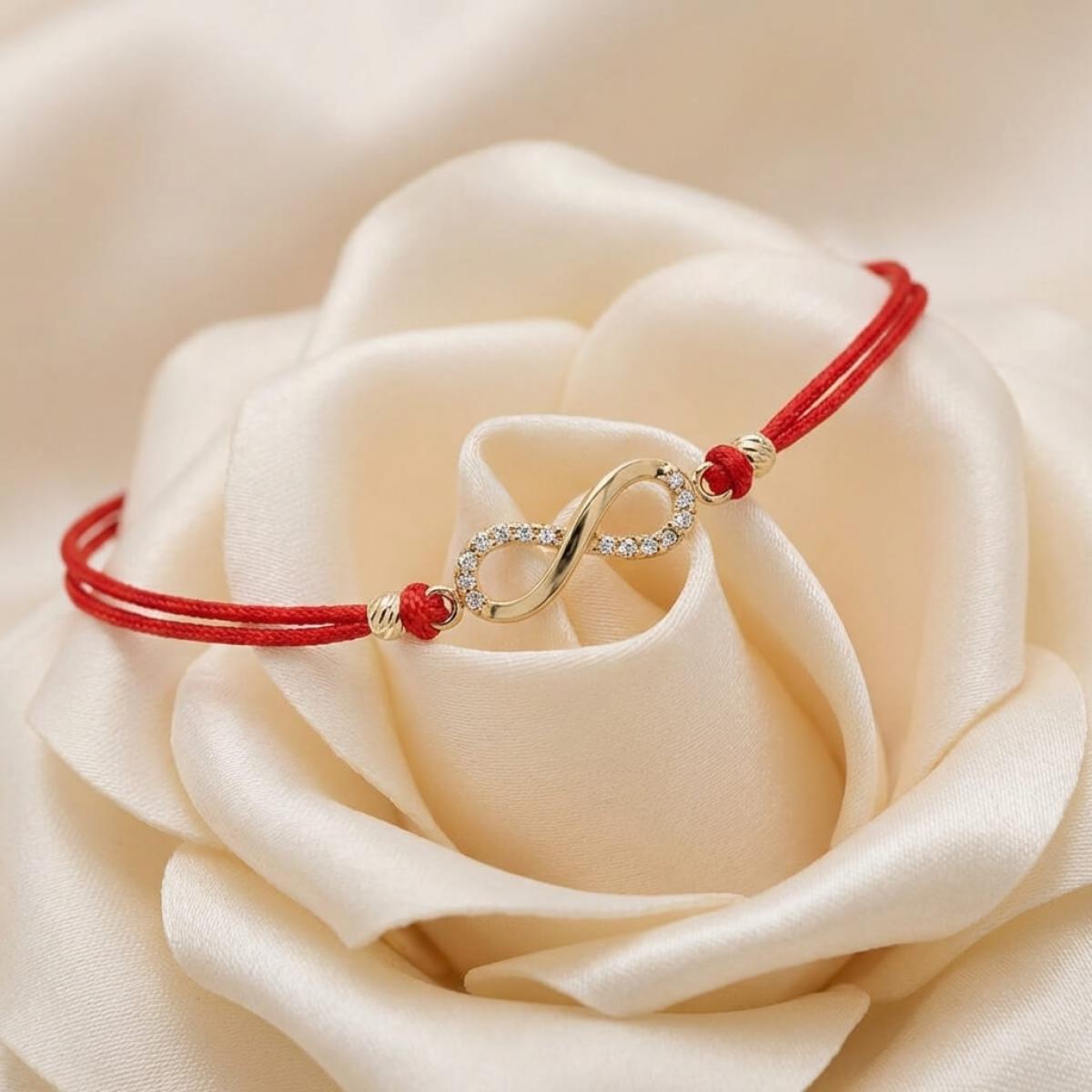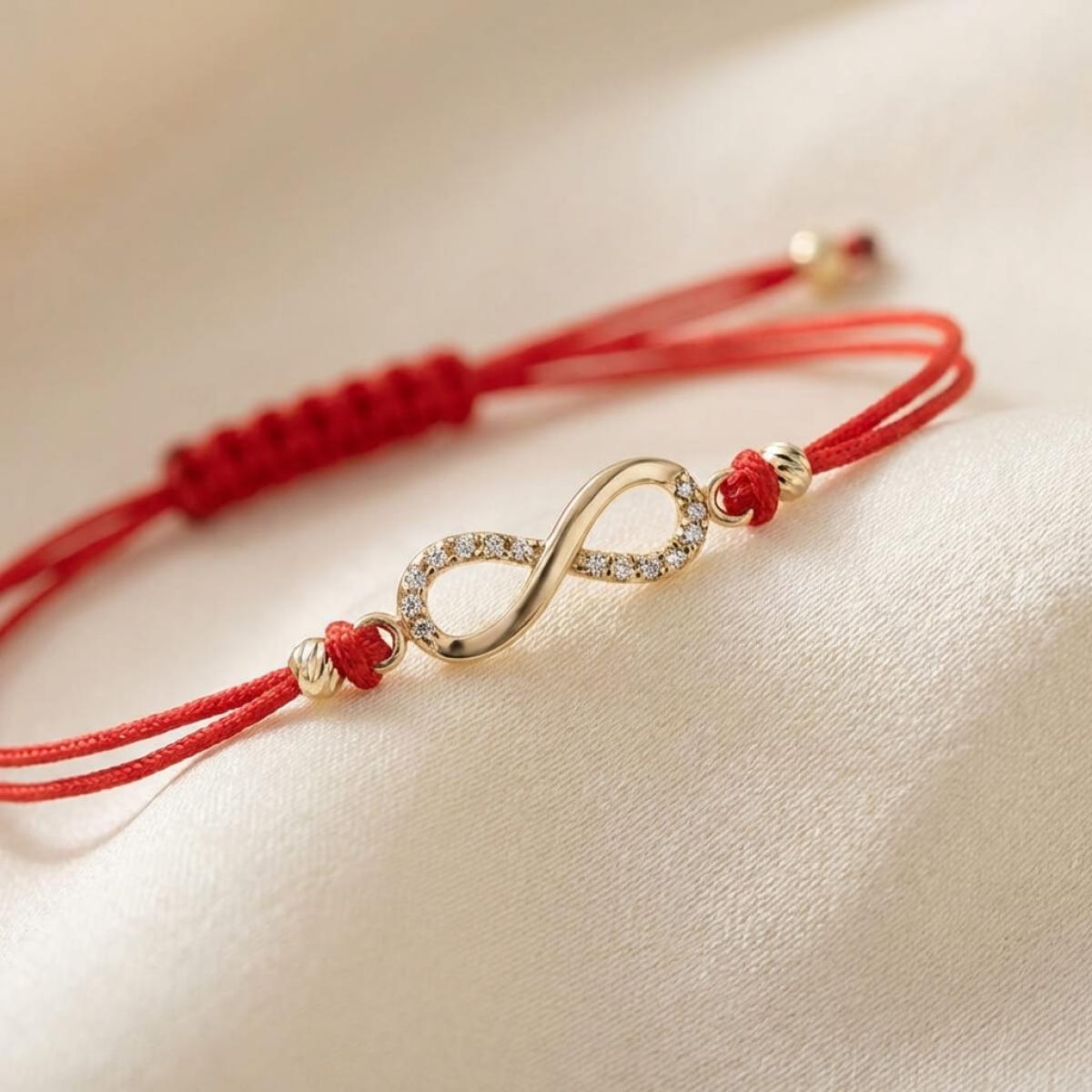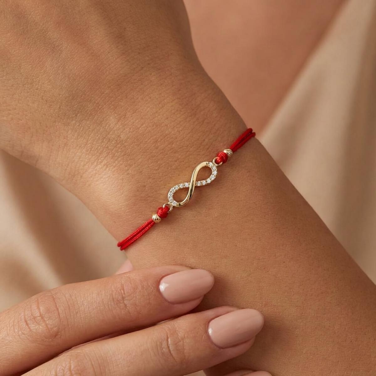 Днес мъже, жени и младежи носят на ръцете си такъв талисман, само че визията му е значително стилизирана. В каталога ни ще откриете огромен асортимент от гривни с червени конци, декорирани със златен или сребърен елемент. В конкретният случай имаме златно украшение, оформено като знака за безкрайност.