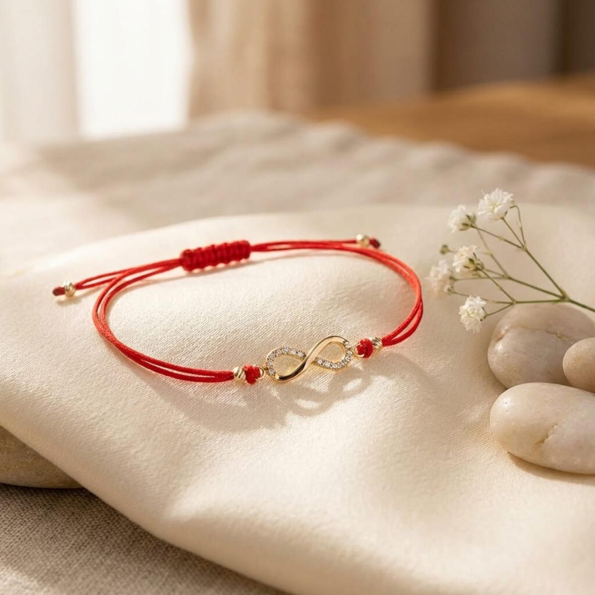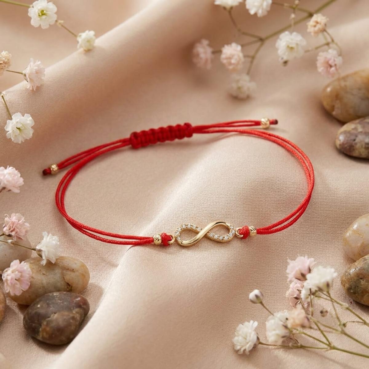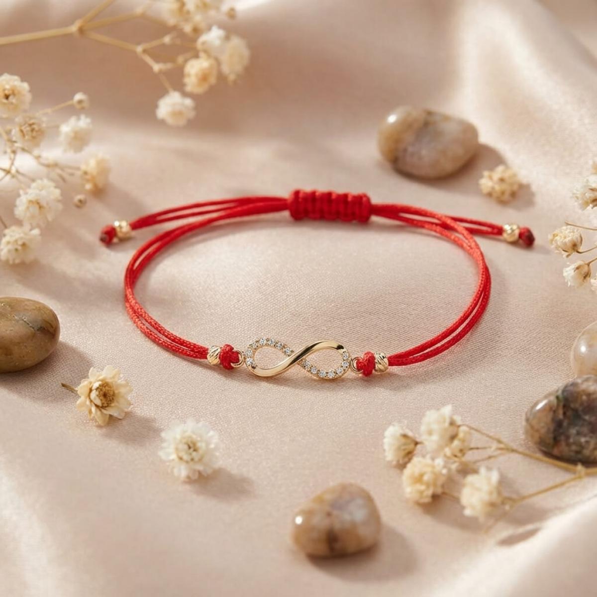 Днес мъже, жени и младежи носят на ръцете си такъв талисман, само че визията му е значително стилизирана. В каталога ни ще откриете огромен асортимент от гривни с червени конци, декорирани със златен или сребърен елемент. В конкретният случай имаме златно украшение, оформено като знака за безкрайност.