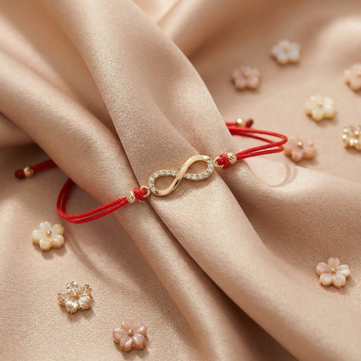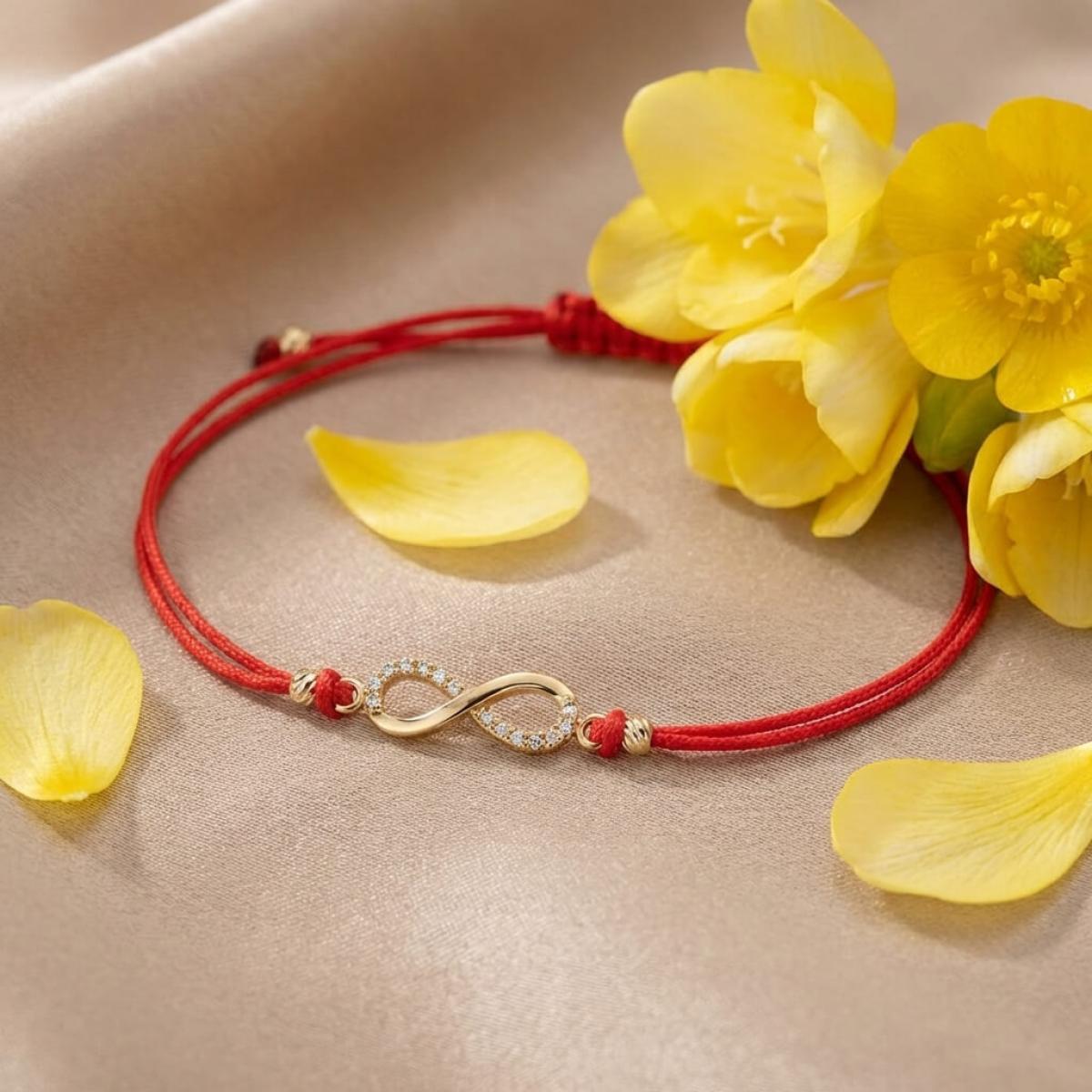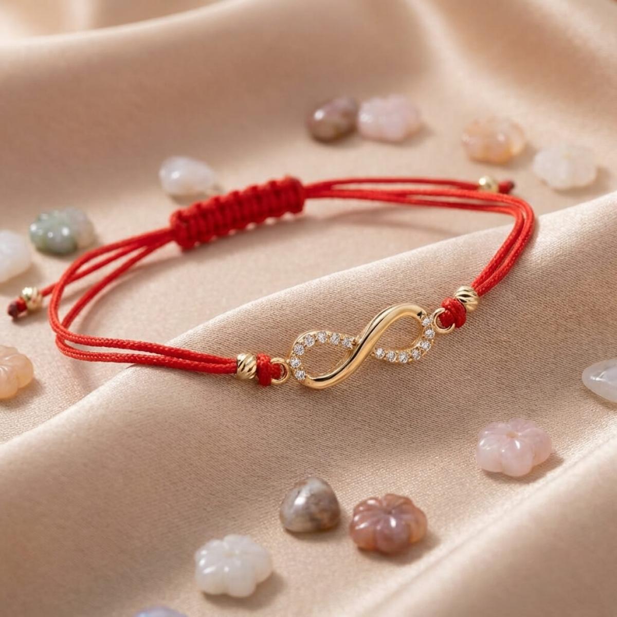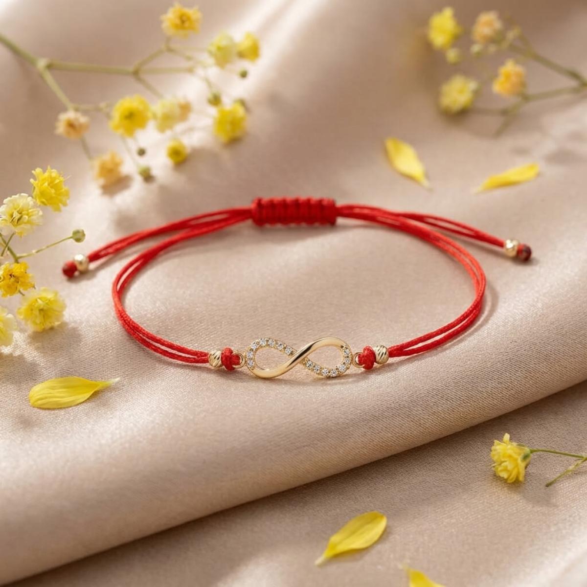 Днес мъже, жени и младежи носят на ръцете си такъв талисман, само че визията му е значително стилизирана. В каталога ни ще откриете огромен асортимент от гривни с червени конци, декорирани със златен или сребърен елемент. В конкретният случай имаме златно украшение, оформено като знака за безкрайност.
