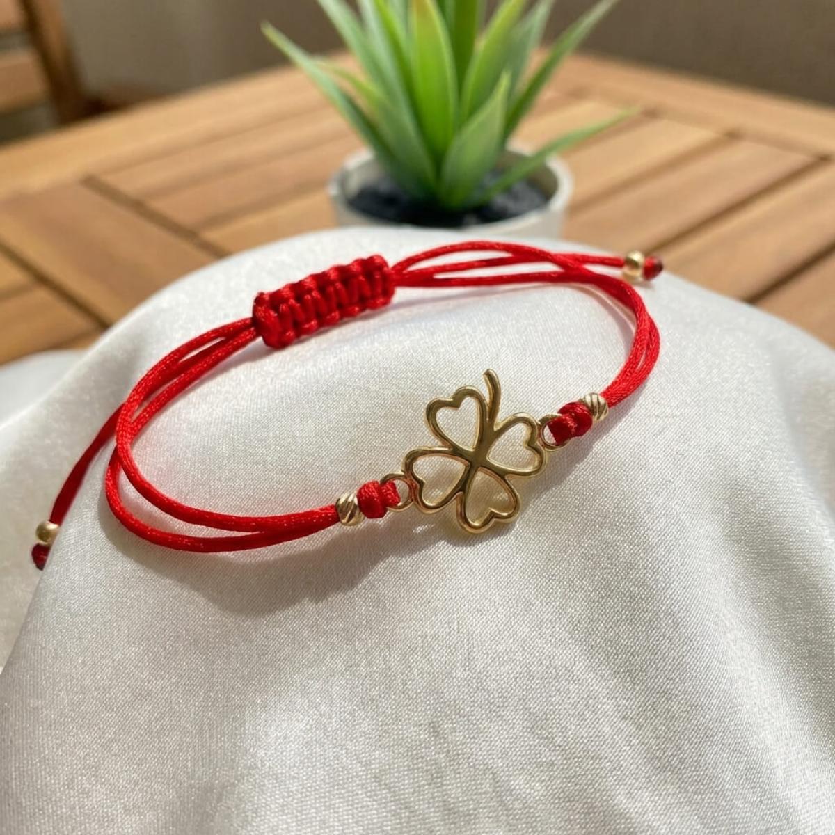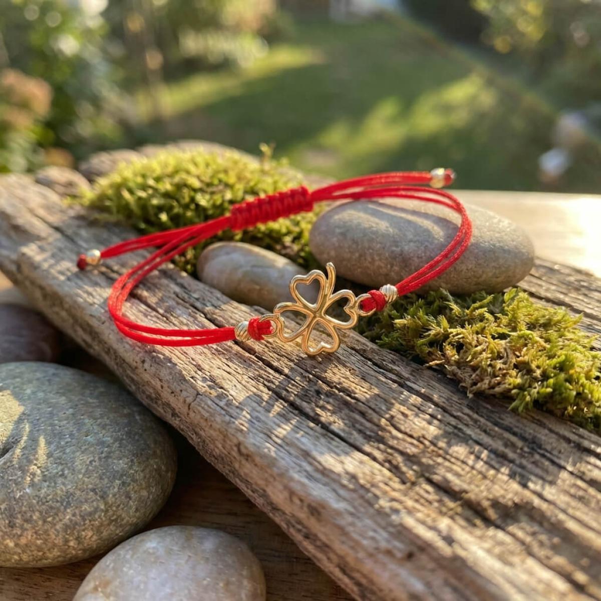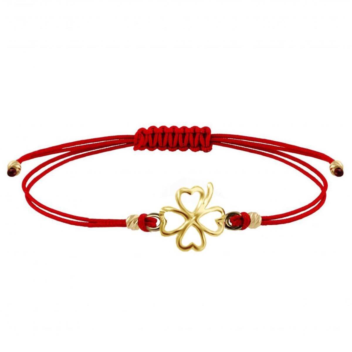 Гривна с червен конец и 14 карата златен елемент детелинка