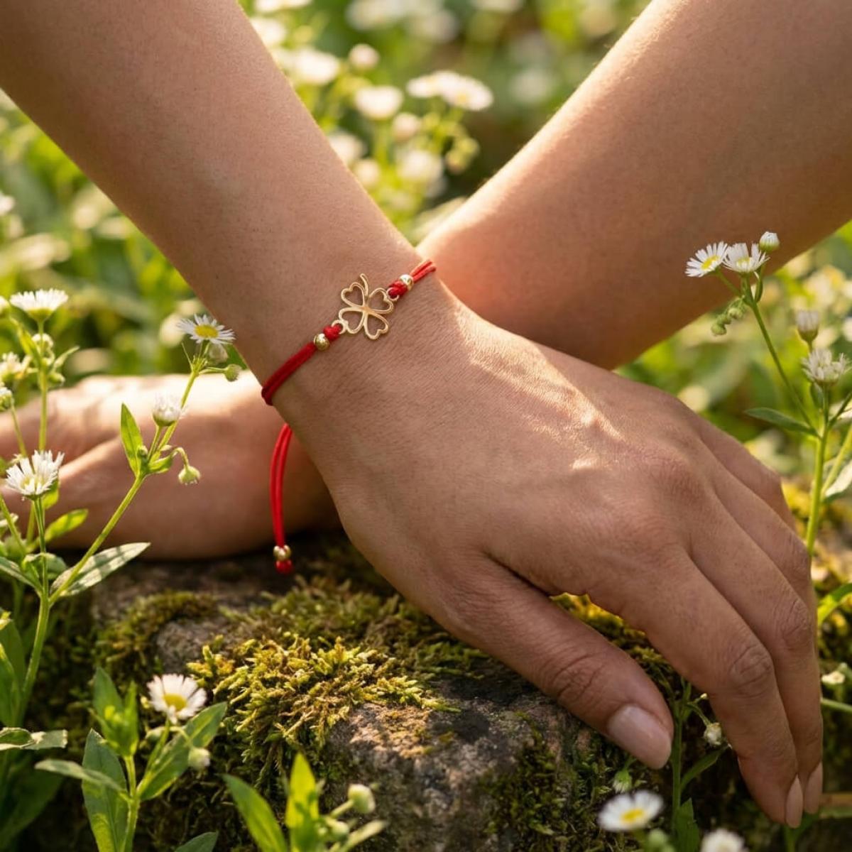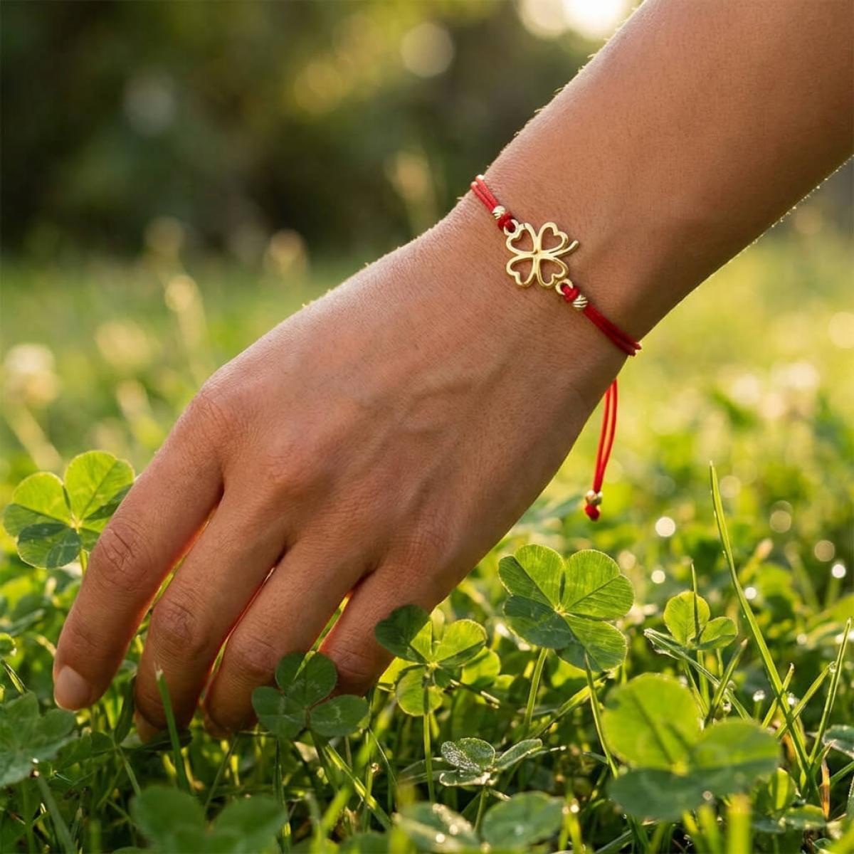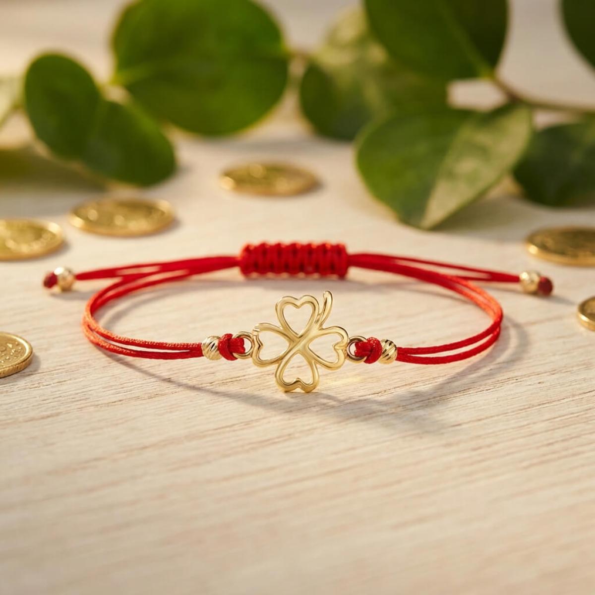 Гривна с червен конец и 14 карата златен елемент детелинка