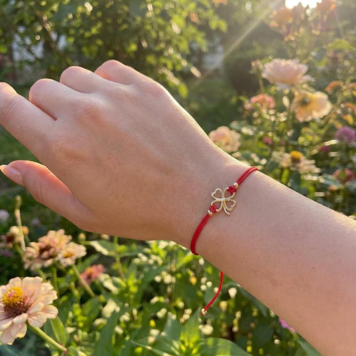 За декоративен елемент на гривната с червен конец избрахме една изящно оформена четирилистна детелинка. Поради факта, че детелините с четири листа се срещат твърде рядко, те са приети за символ на късмета. Късметът е онзи фактор, който определя нашия успех и щастие. Четирилистната детелина присъства неслучайно в голяма част от нашите бижута.