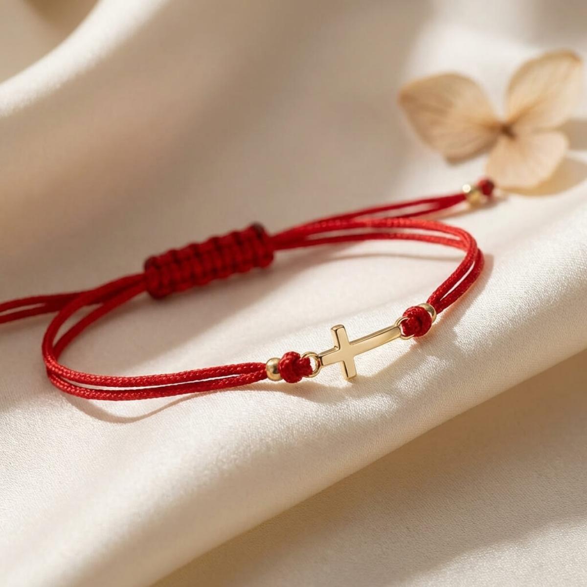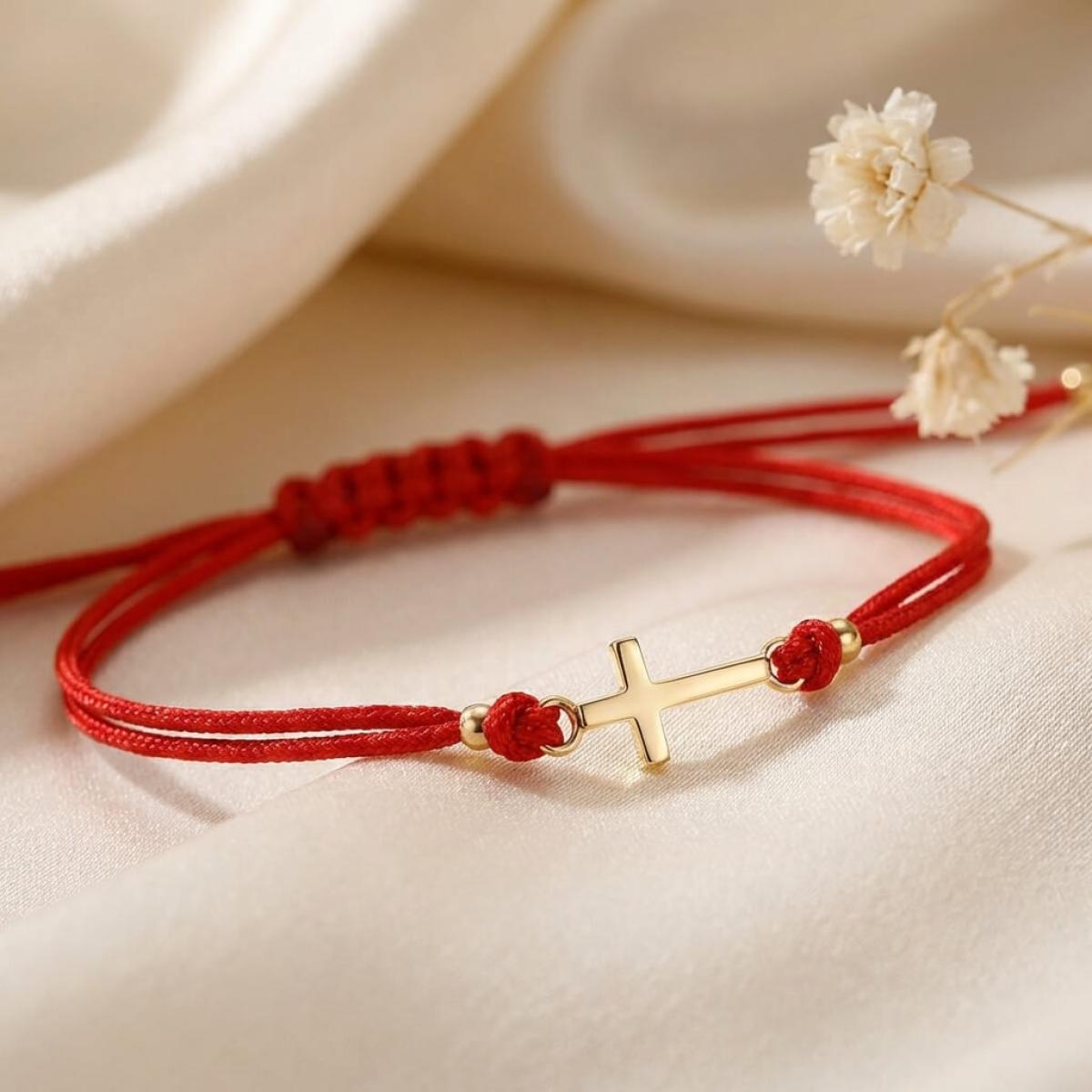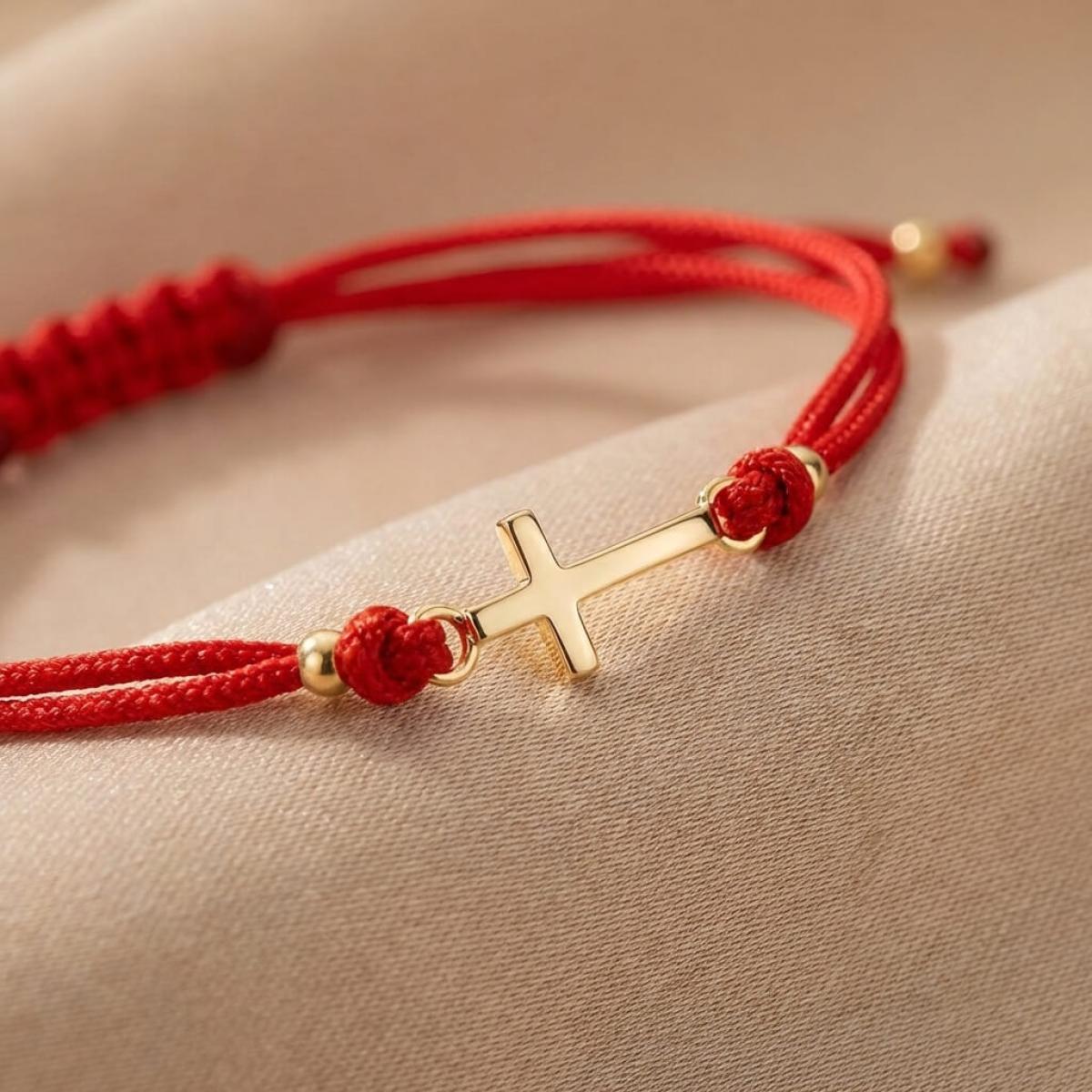 Едва ли има по-уместно решение от това кръстът да бъде декорация на един мощен амулет, какъвто е конецът в червено. Всеки от двата елемента сам по себе си е символ на закрила, като кръстчето показва упование в закрилата на самия Бог. Изделието е един чудесен начин да осигурите защита на любим човек – дете или възрастен.