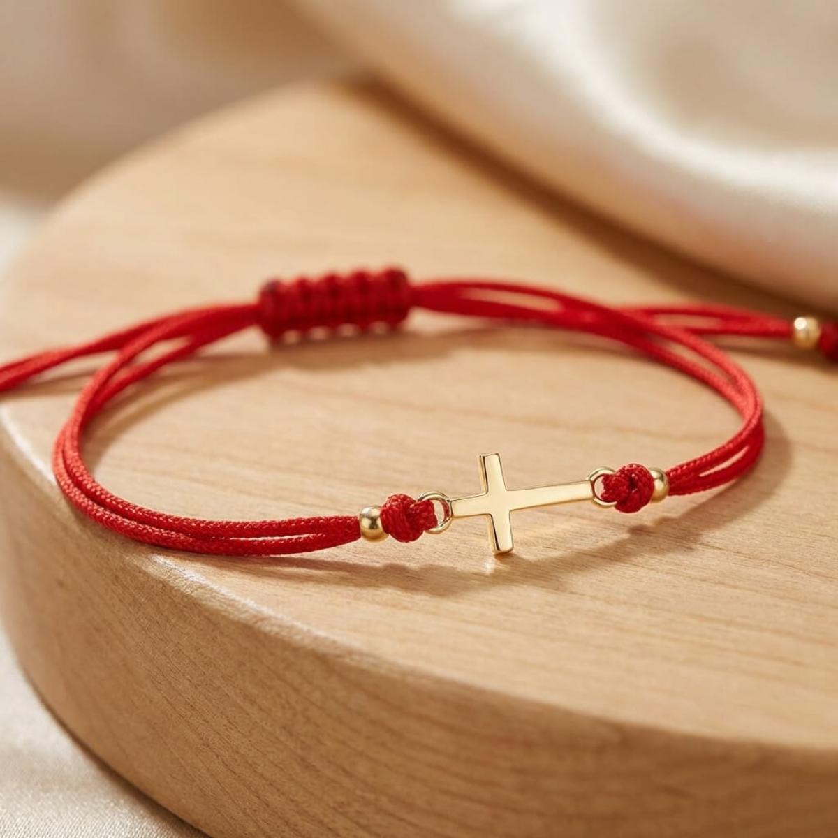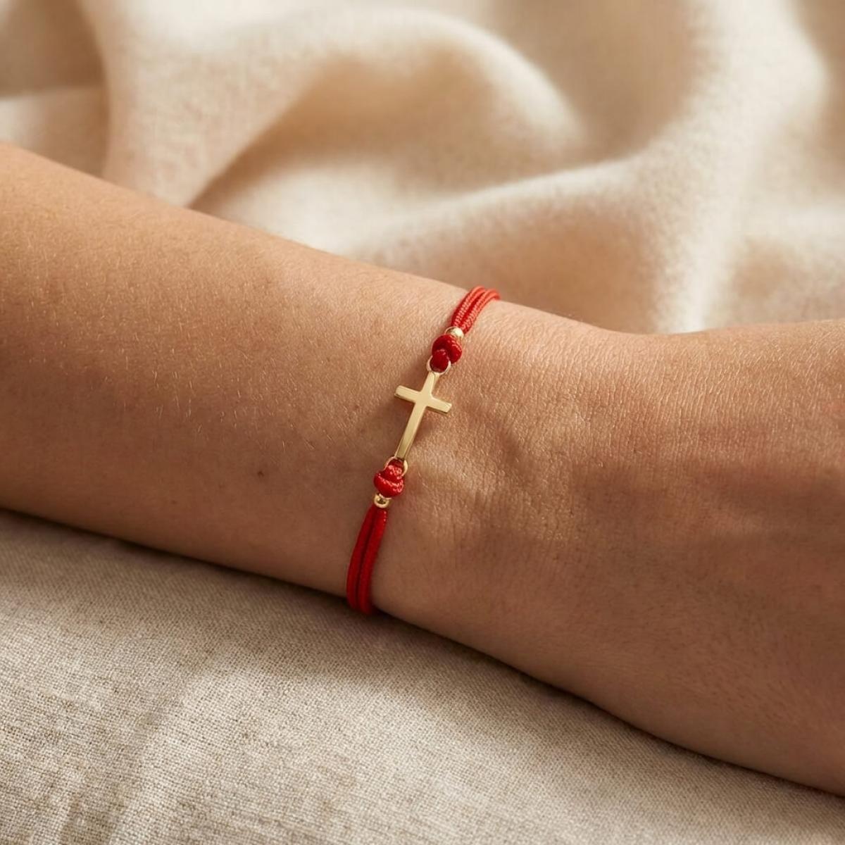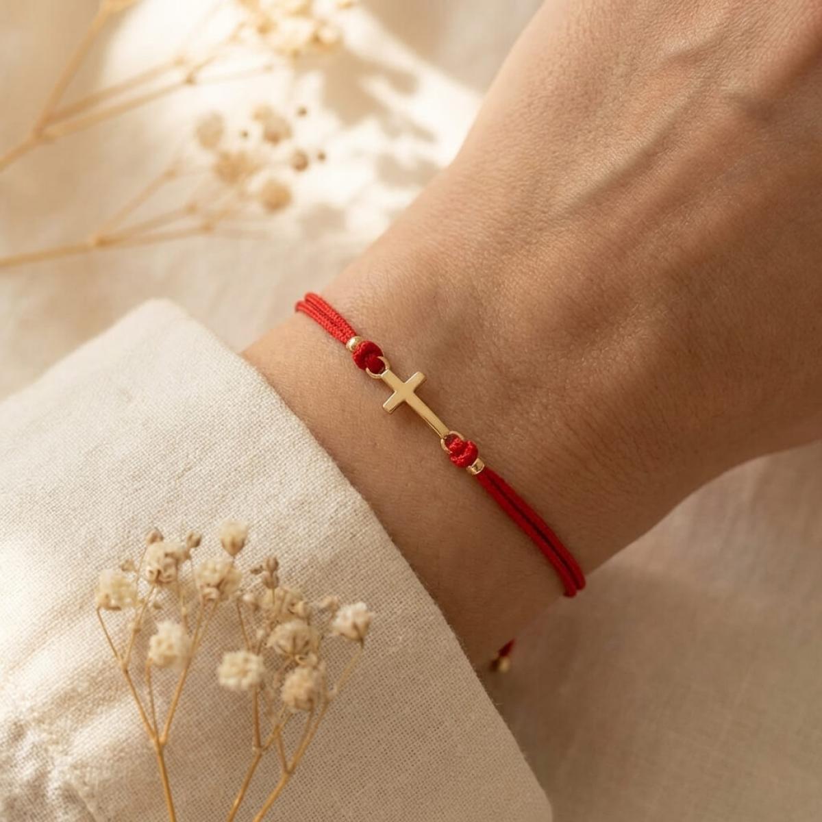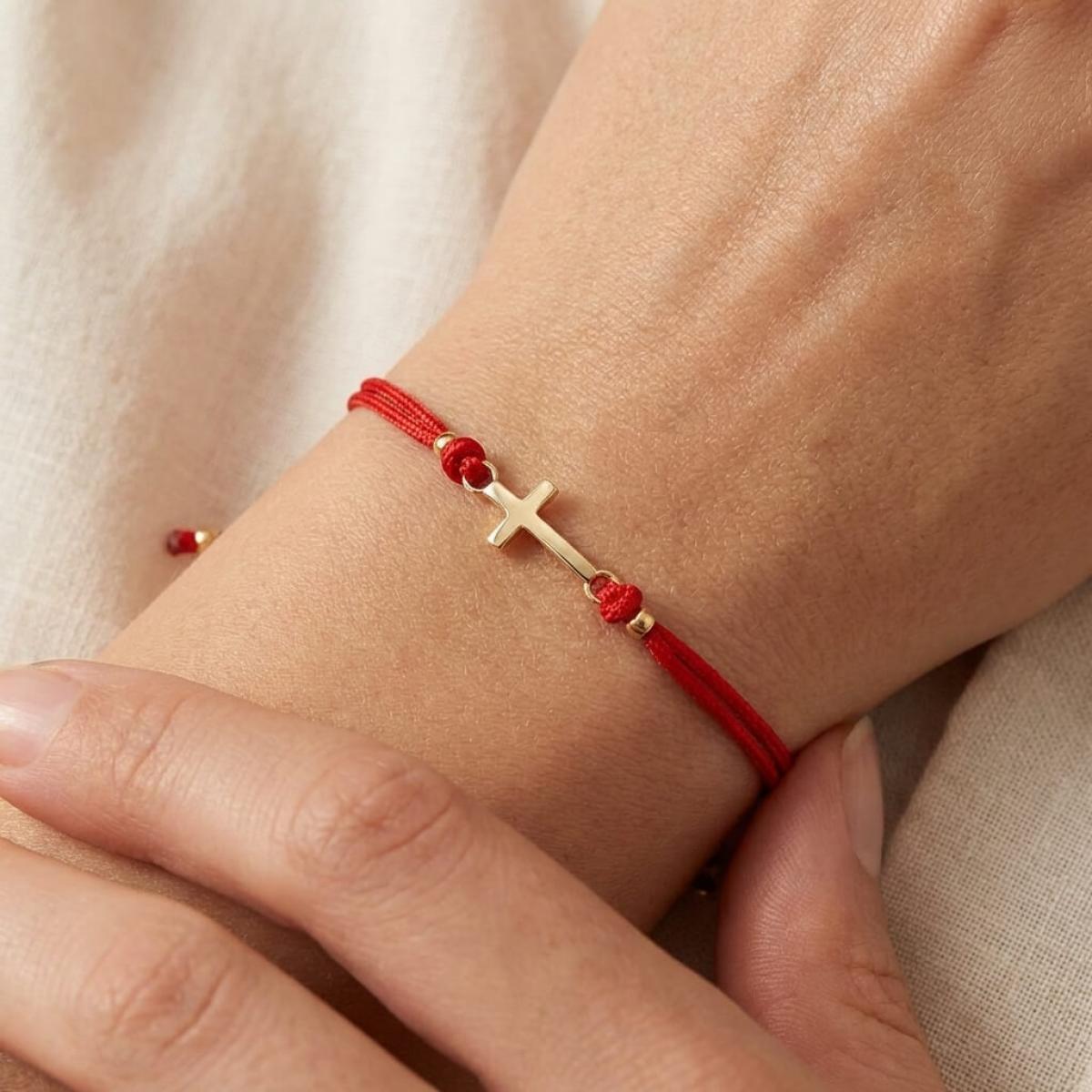 Едва ли има по-уместно решение от това кръстът да бъде декорация на един мощен амулет, какъвто е конецът в червено. Всеки от двата елемента сам по себе си е символ на закрила, като кръстчето показва упование в закрилата на самия Бог. Изделието е един чудесен начин да осигурите защита на любим човек – дете или възрастен.