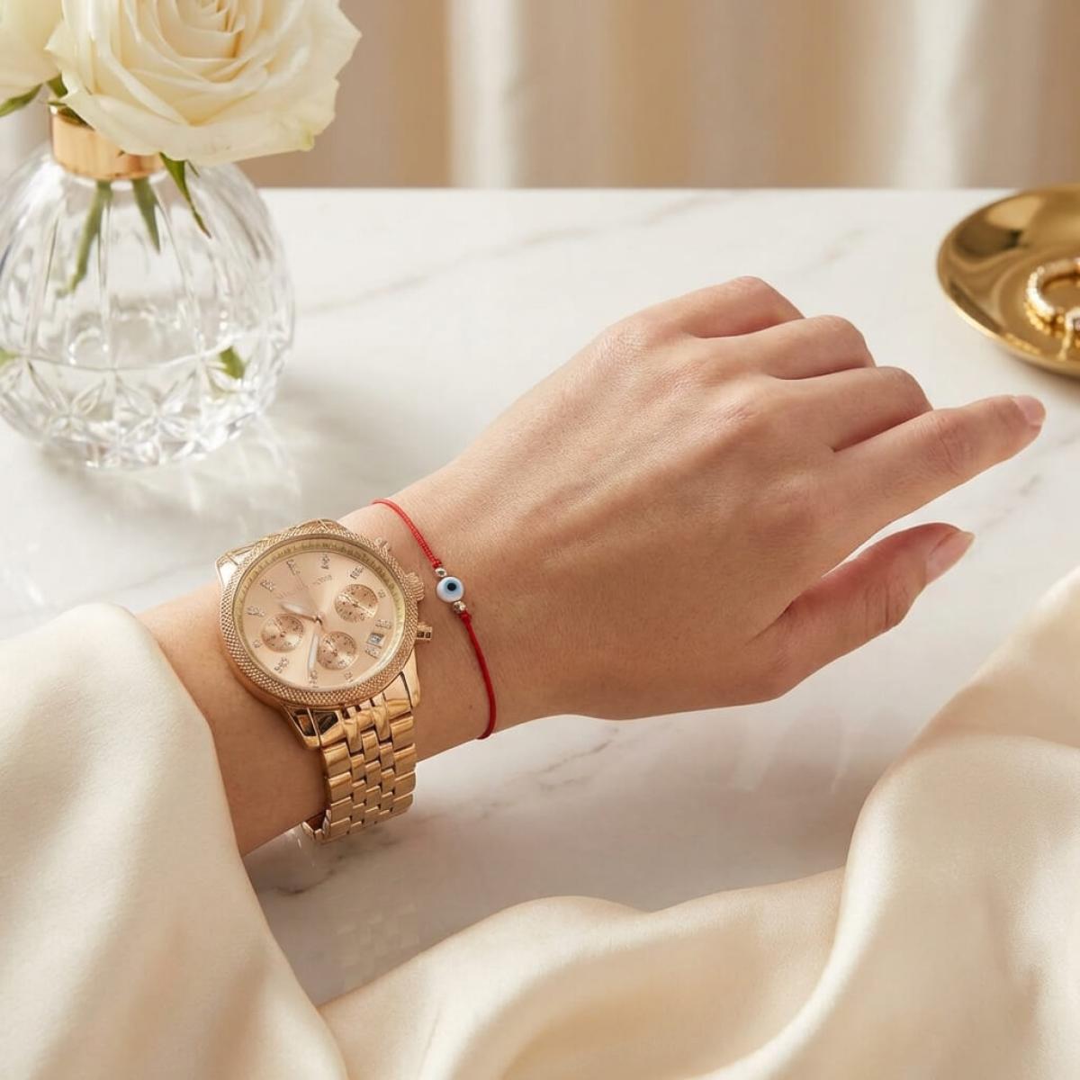 Тази стилна гривна на червен конец съчетава в себе си силата на традицията и модерната елегантност. Синият елемент "око" е древен символ за защита от зли очи и негативна енергия, а фините златни топчета (14 карата злато) придават лукс и изящество.