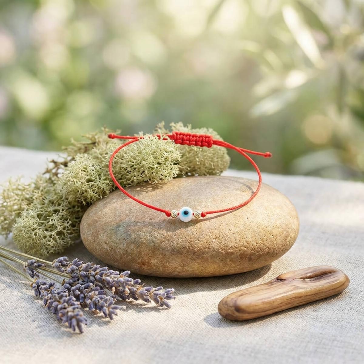 Гривна с червен конец, златни топчета и синьо око