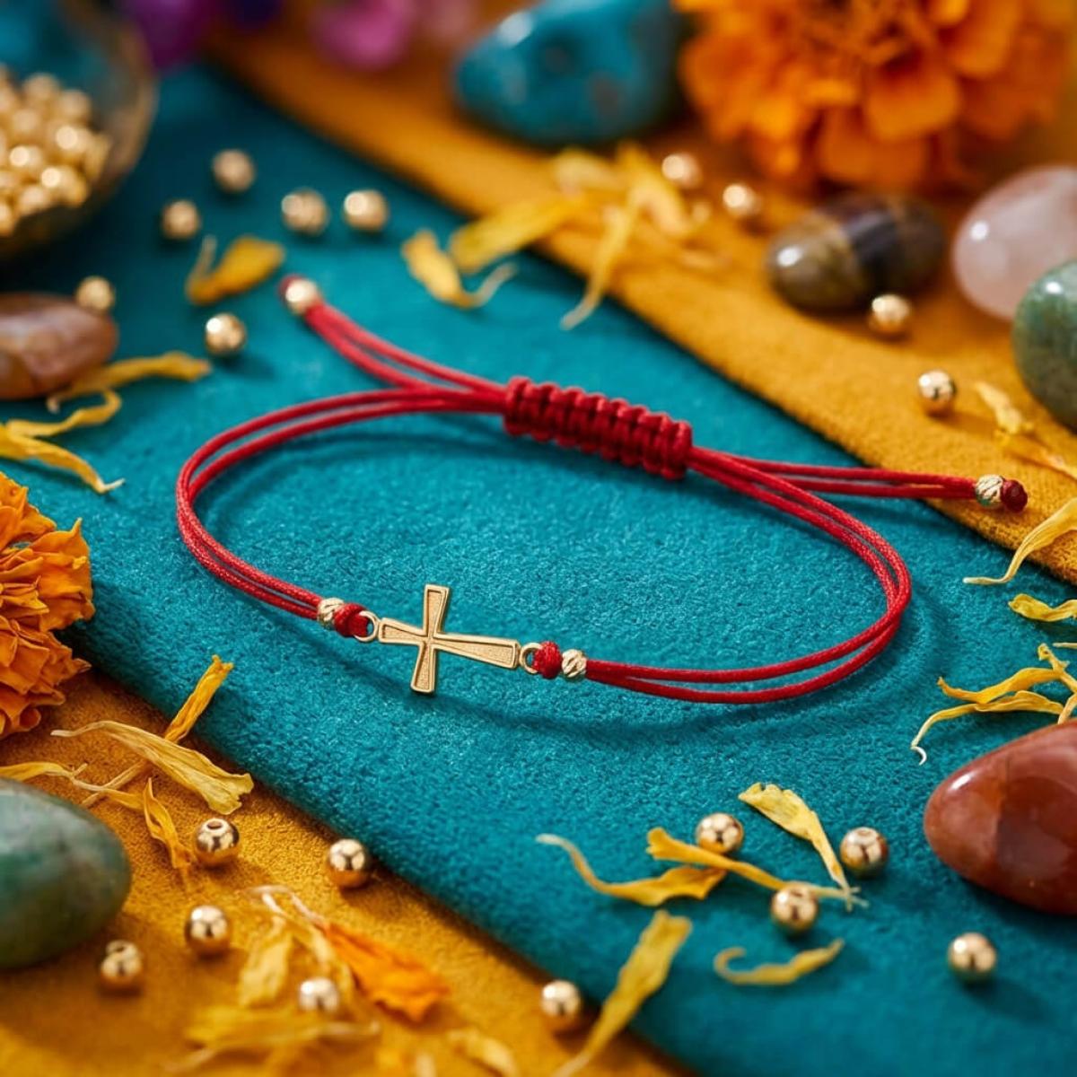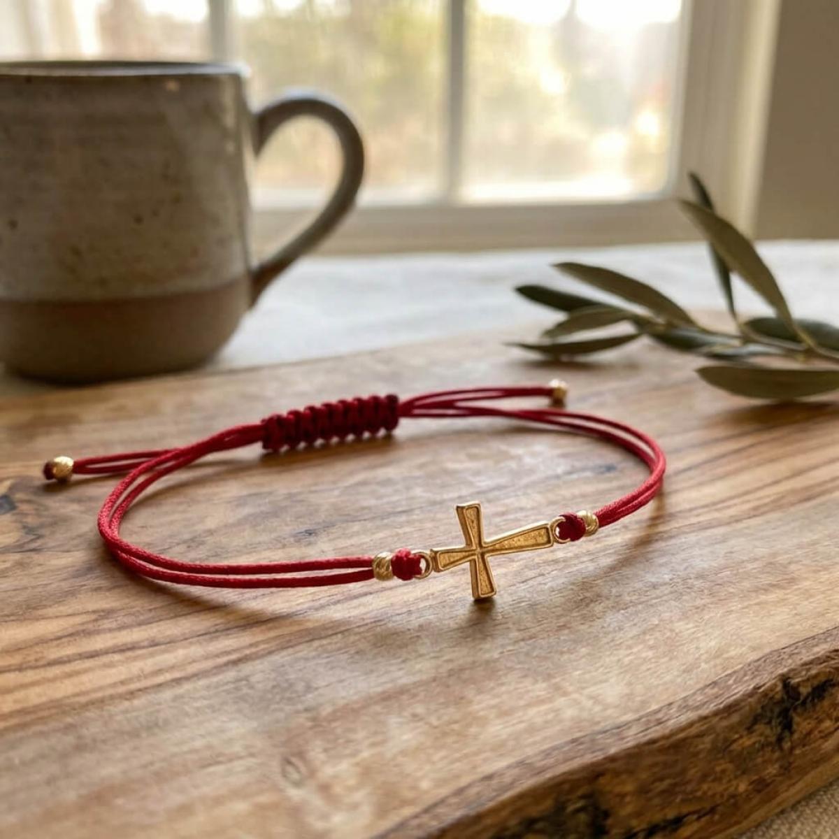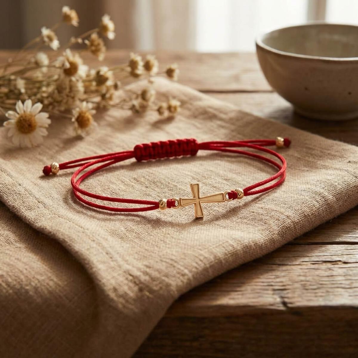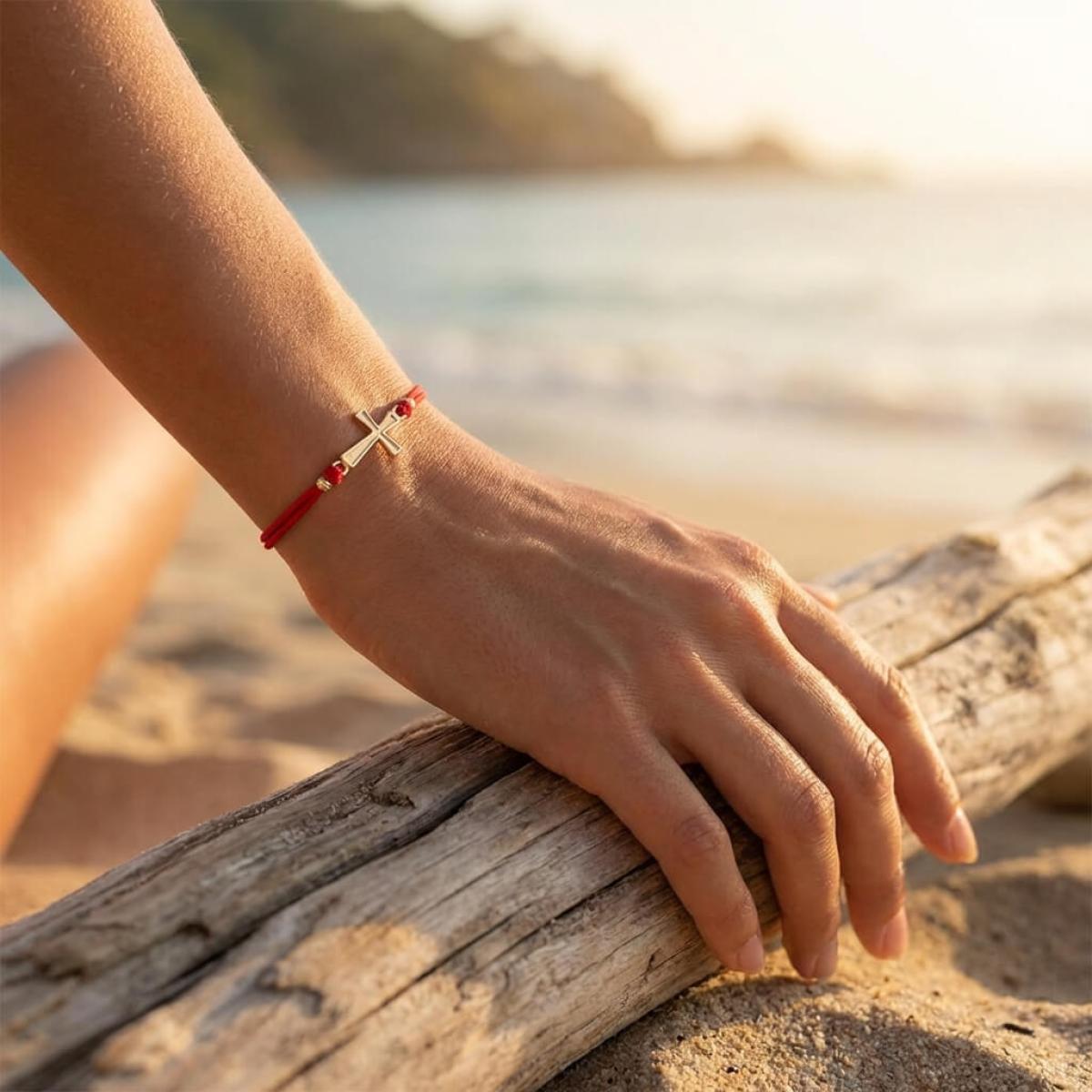Гривна с червен конец и 14 карата златен елемент кръст B6