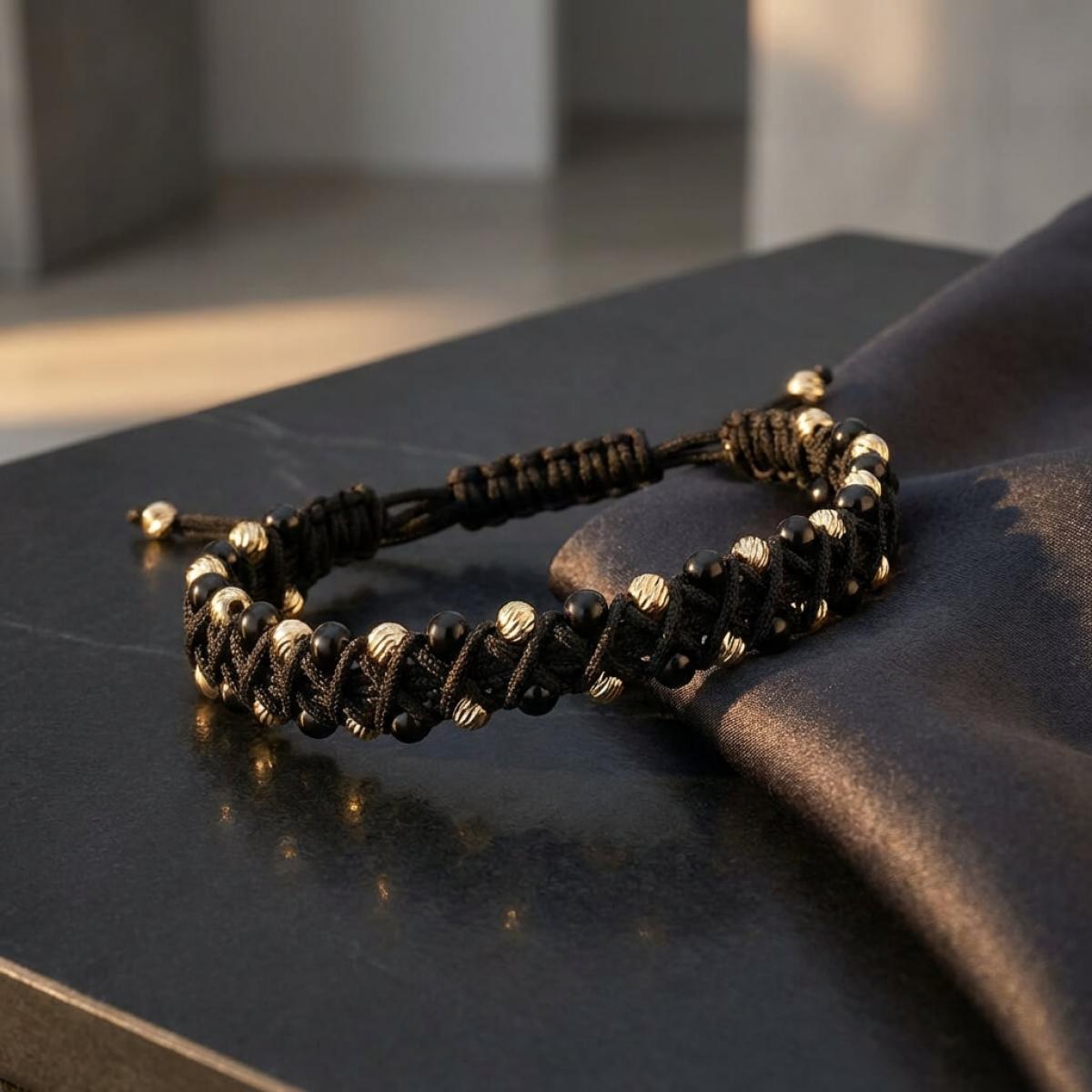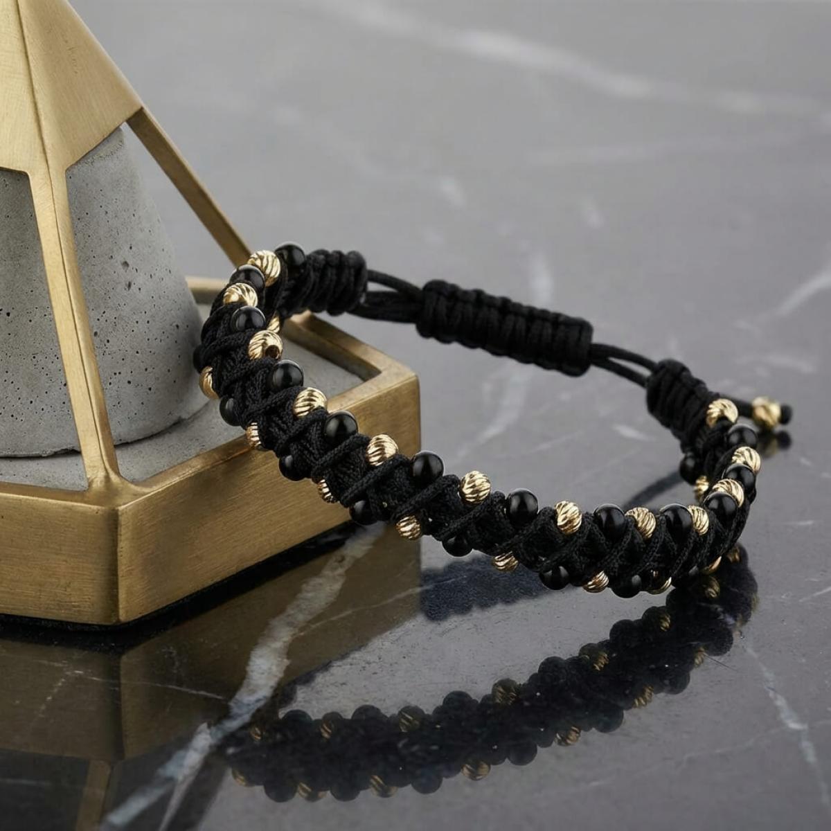 Основата е изработена от машинно оплетени синтетични нишки, в чиято структура умело са вмъкнати и мъниста от 14-каратово злато и черен оникс. По никакъв начин не смятаме, че мънистата са неуместна декорация за мъжко бижу. В конкретния случай малките топчета акцентират върху интересната оплетка на изделието. Без тях не бихте забелязали какви интересни форми образува плетеницата.