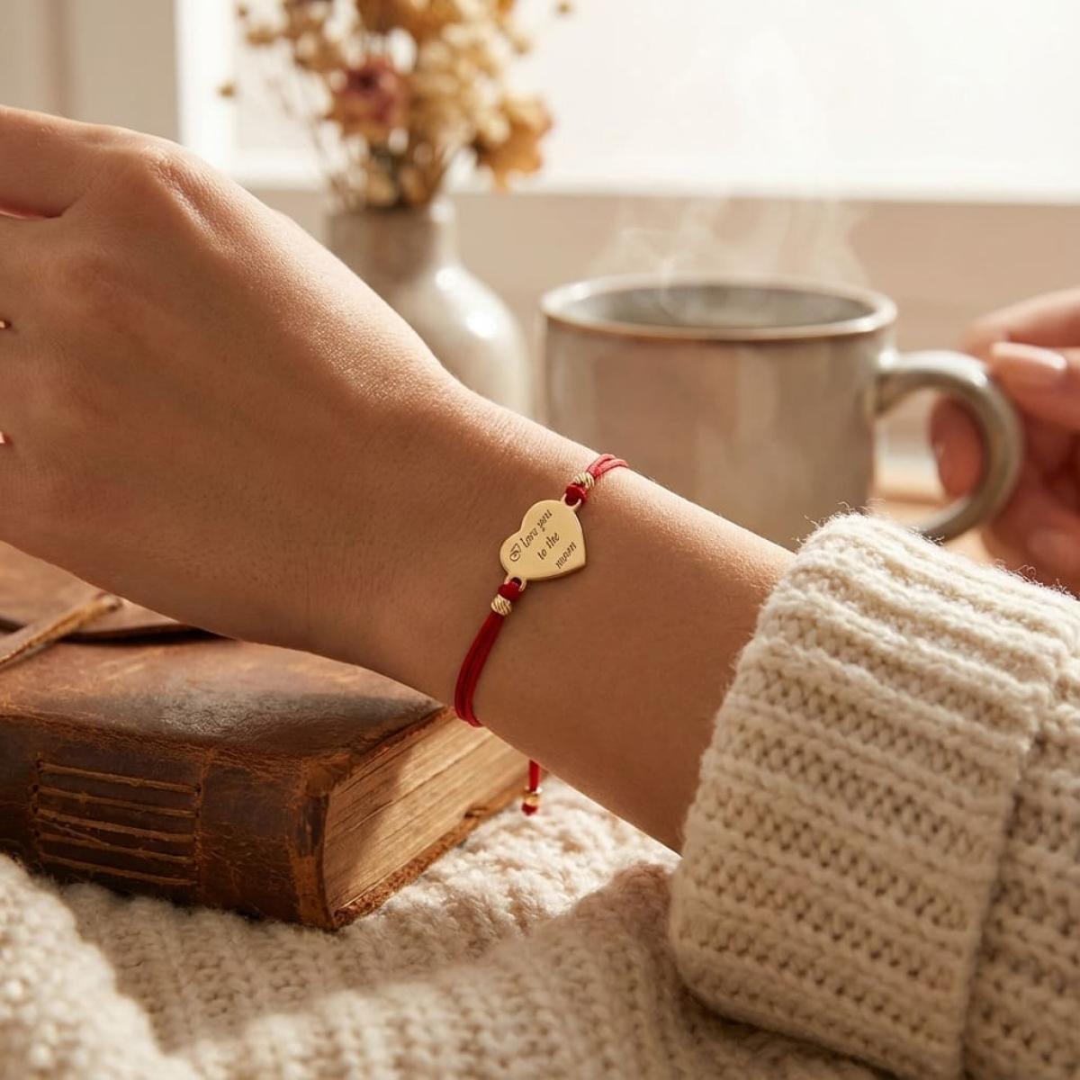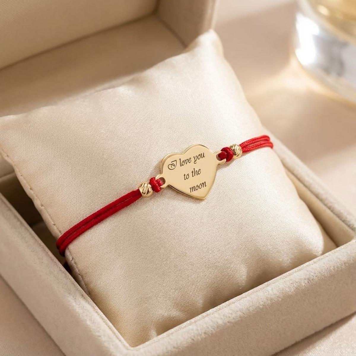 Гривна с червен конец и 14 карата златен елемент сърце с гравирано послание по избор