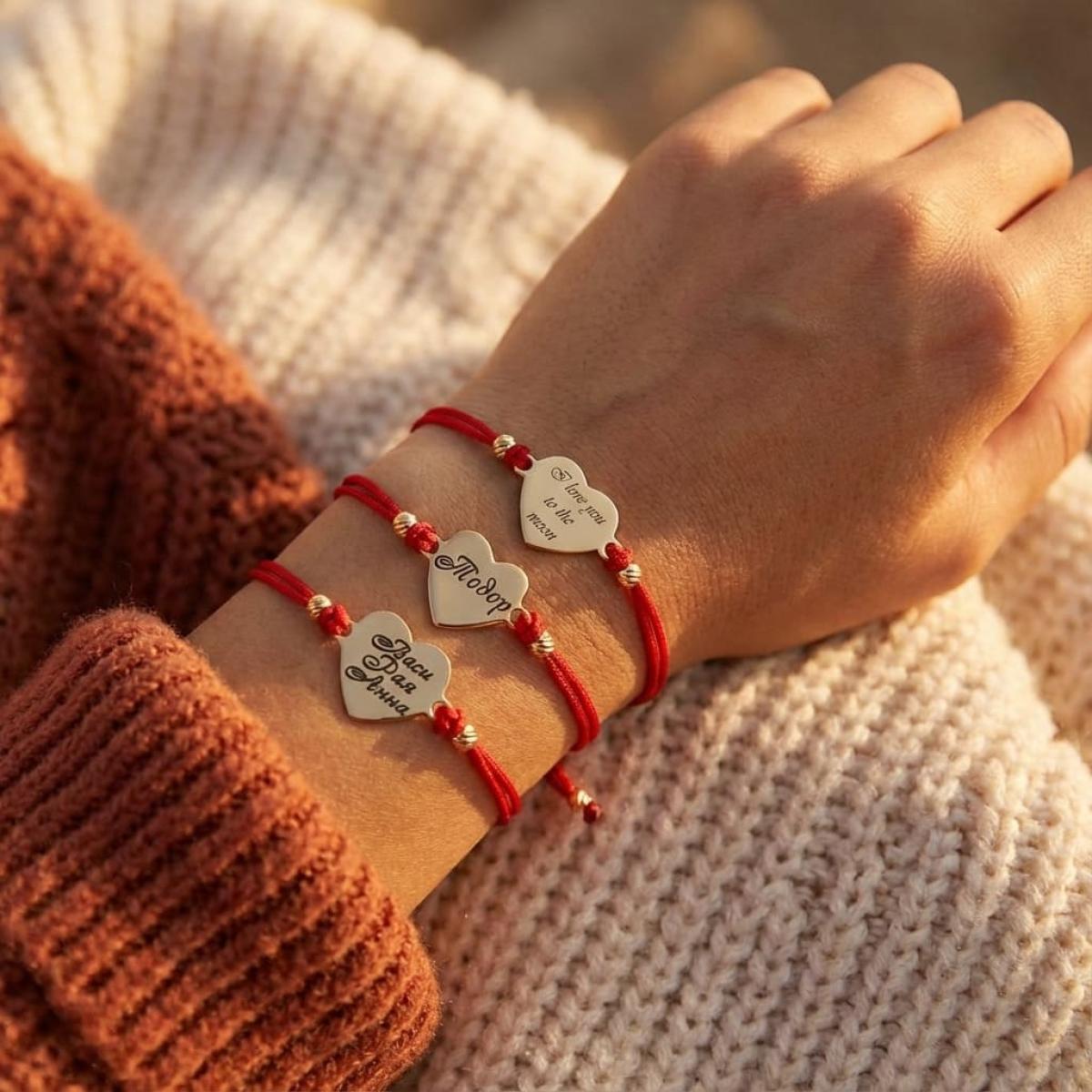 Гривната с червен конец е един елегантен, но преди всичко оригинален начин да кажеш „обичам те”. Не е задължително точно това да гласи надписът, който ще гравираме, защото самата форма на централния елемент – сърце, го подсказва. И все пак, ние ви даваме възможност да отправите мило послание, чиято основна идея е любов.