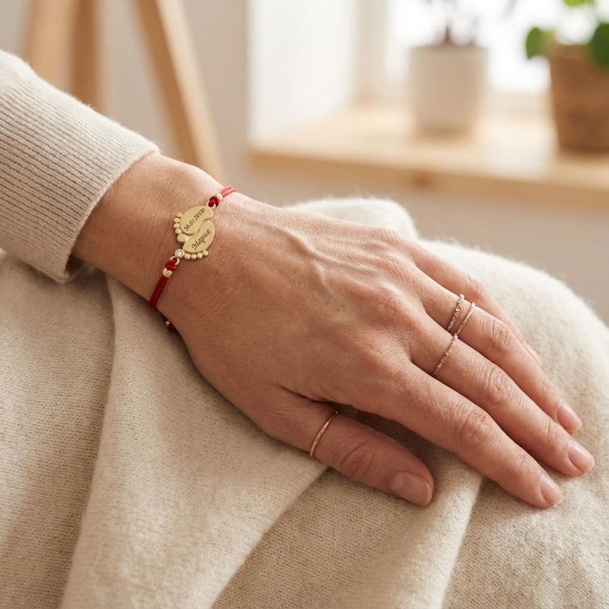 Гривна с червен конец и 14 карата златен елемент 2 бебешки стъпки