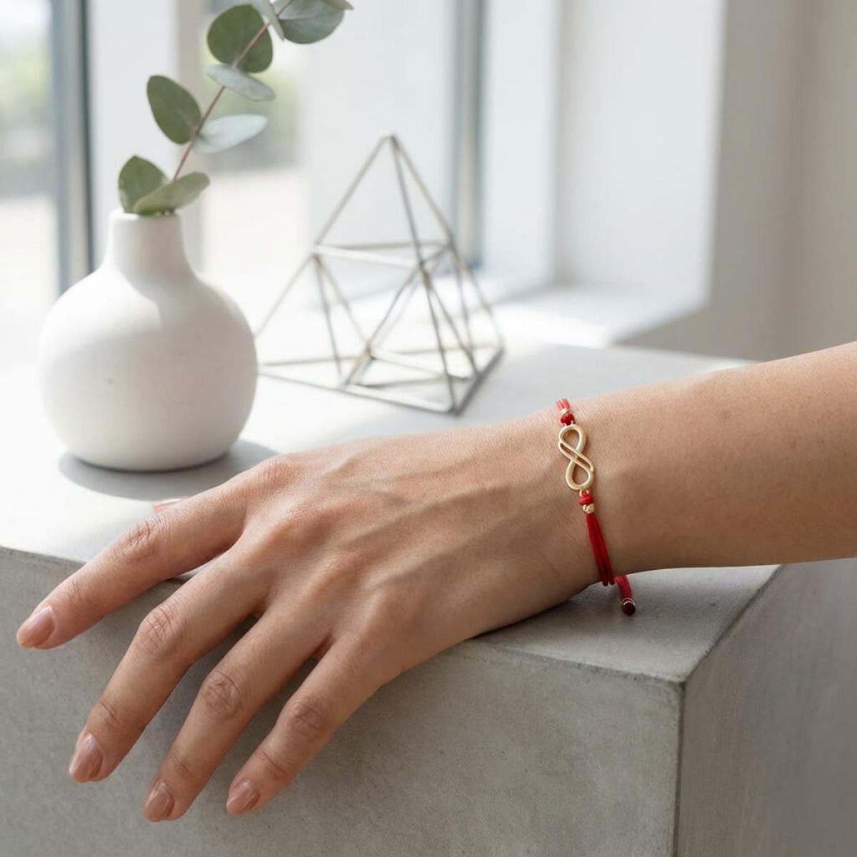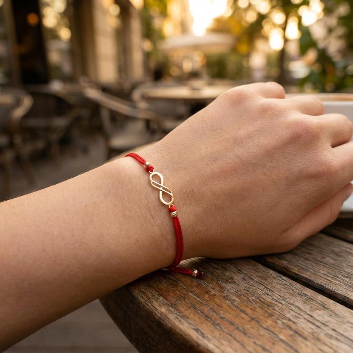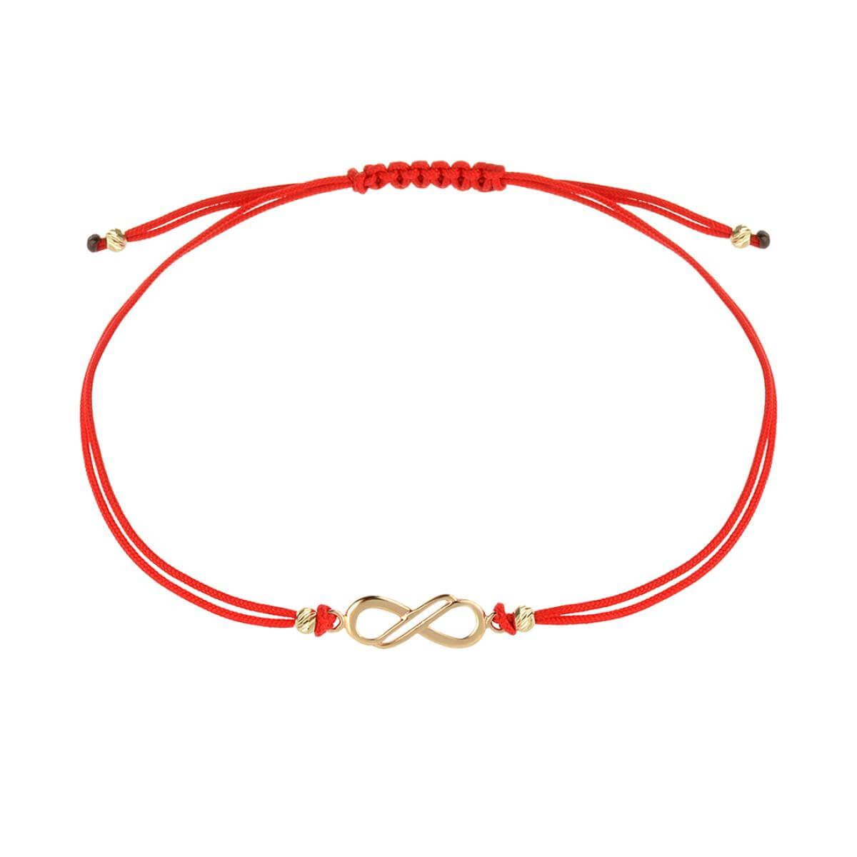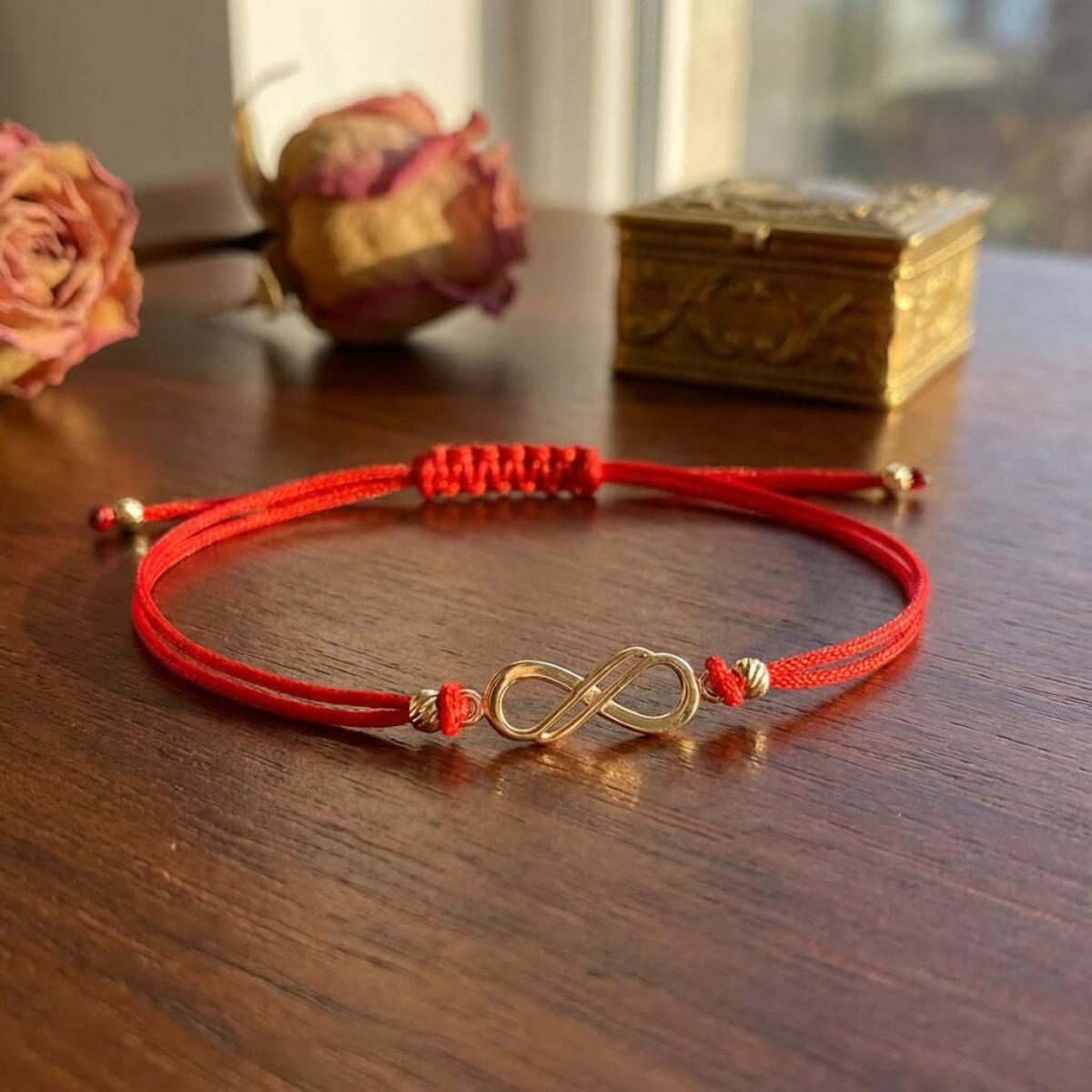 Гривна с червен конец и 14 карата златен елемент безкрайност