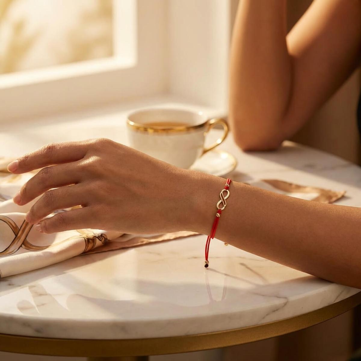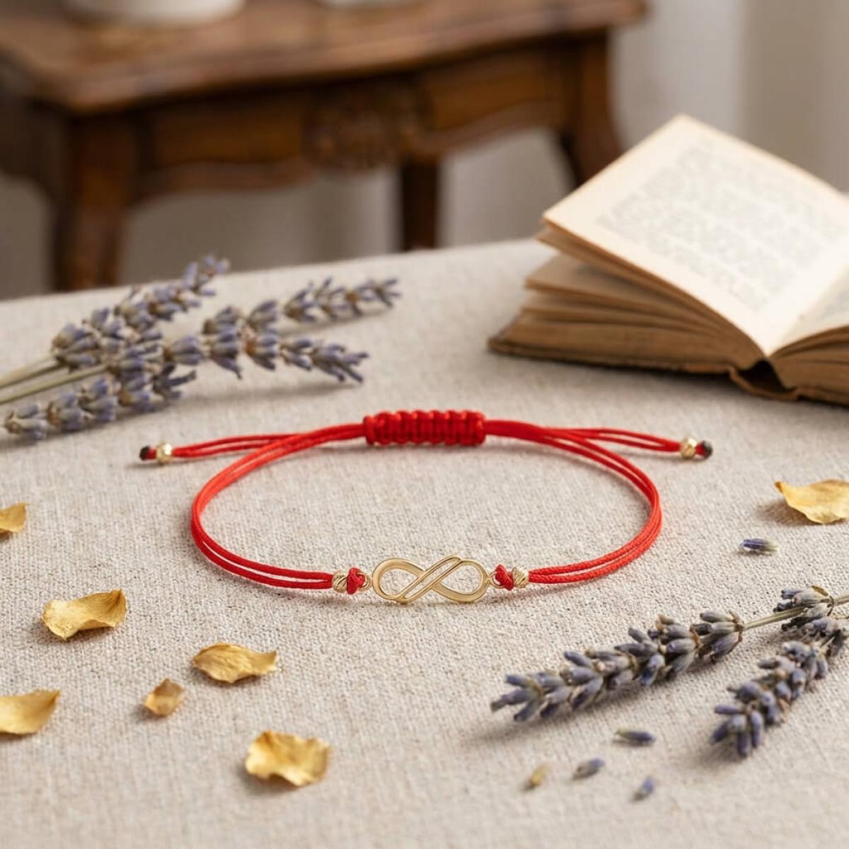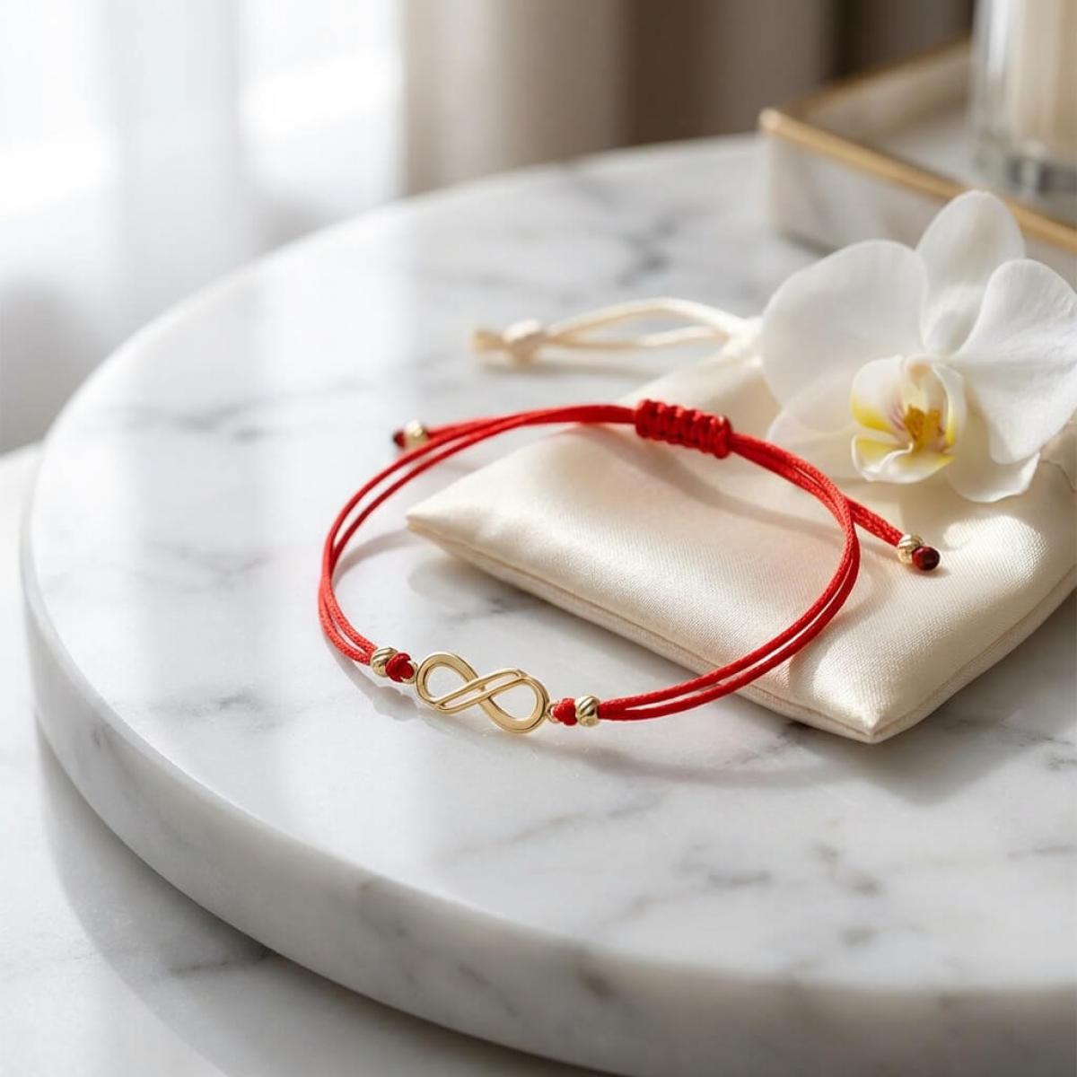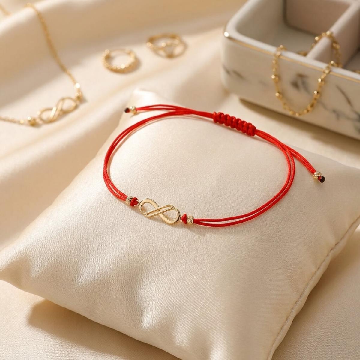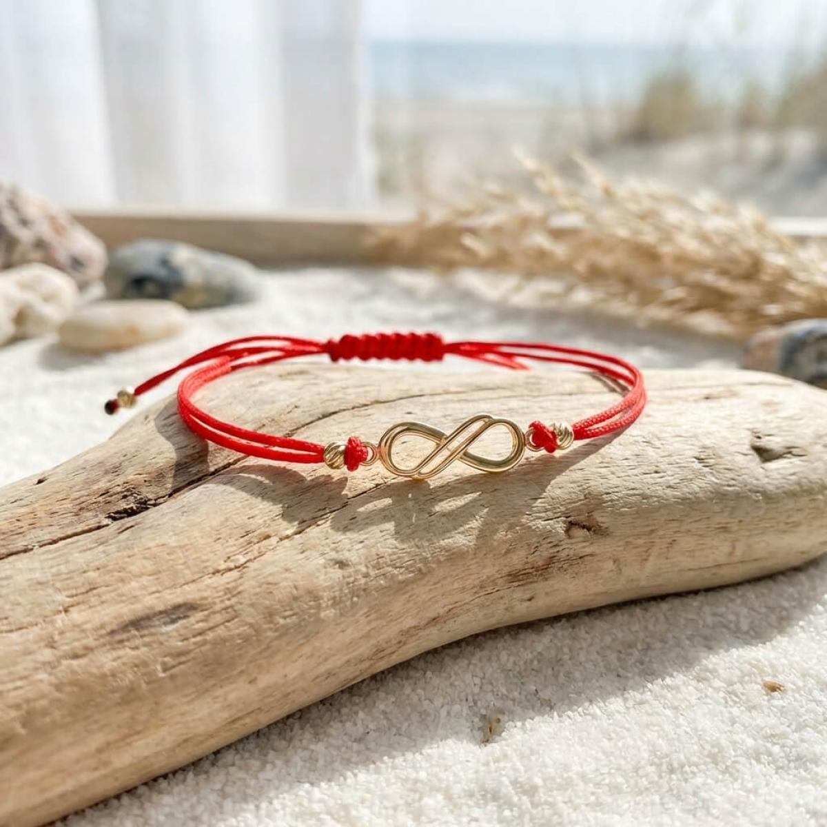 Гривна с червен конец и 14 карата златен елемент безкрайност