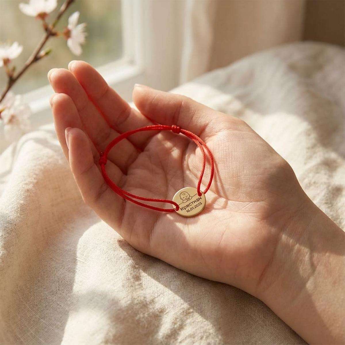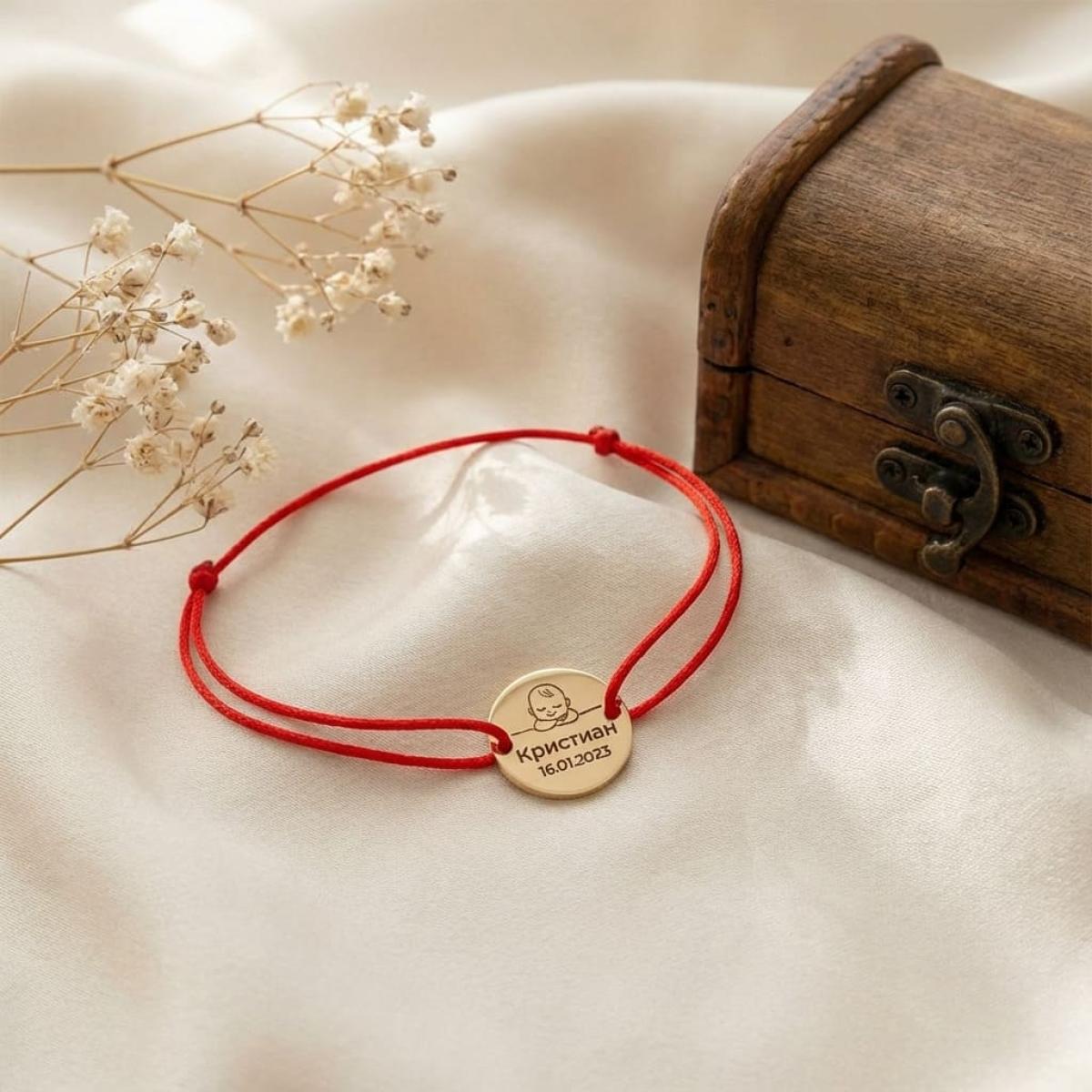 Гривна с червен конец и златен елемент с рождените данни на вашето бебе