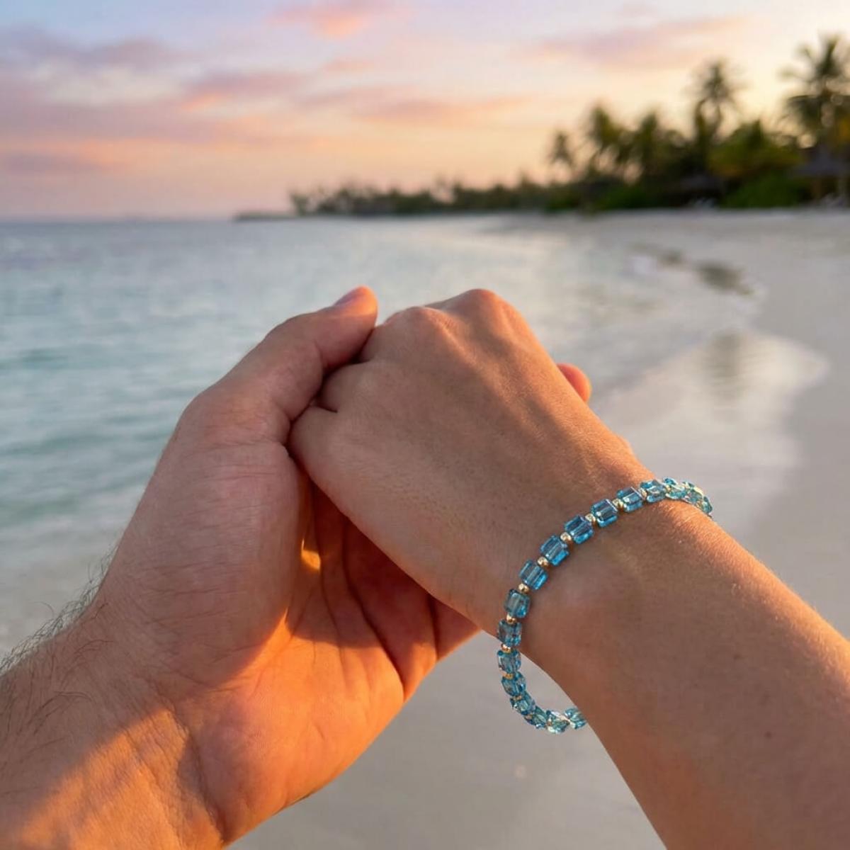 На пръв поглед това превъзходно украшение се различава от класическите гривни с топчета. Първоначално е дори доста трудно гривната да се определи като златна, защото златото тук е представено под формата на съвсем дребен, но всъщност съществен детайл. В изделието присъстват 18 броя мъниста, изработени от 14-каратово злато.