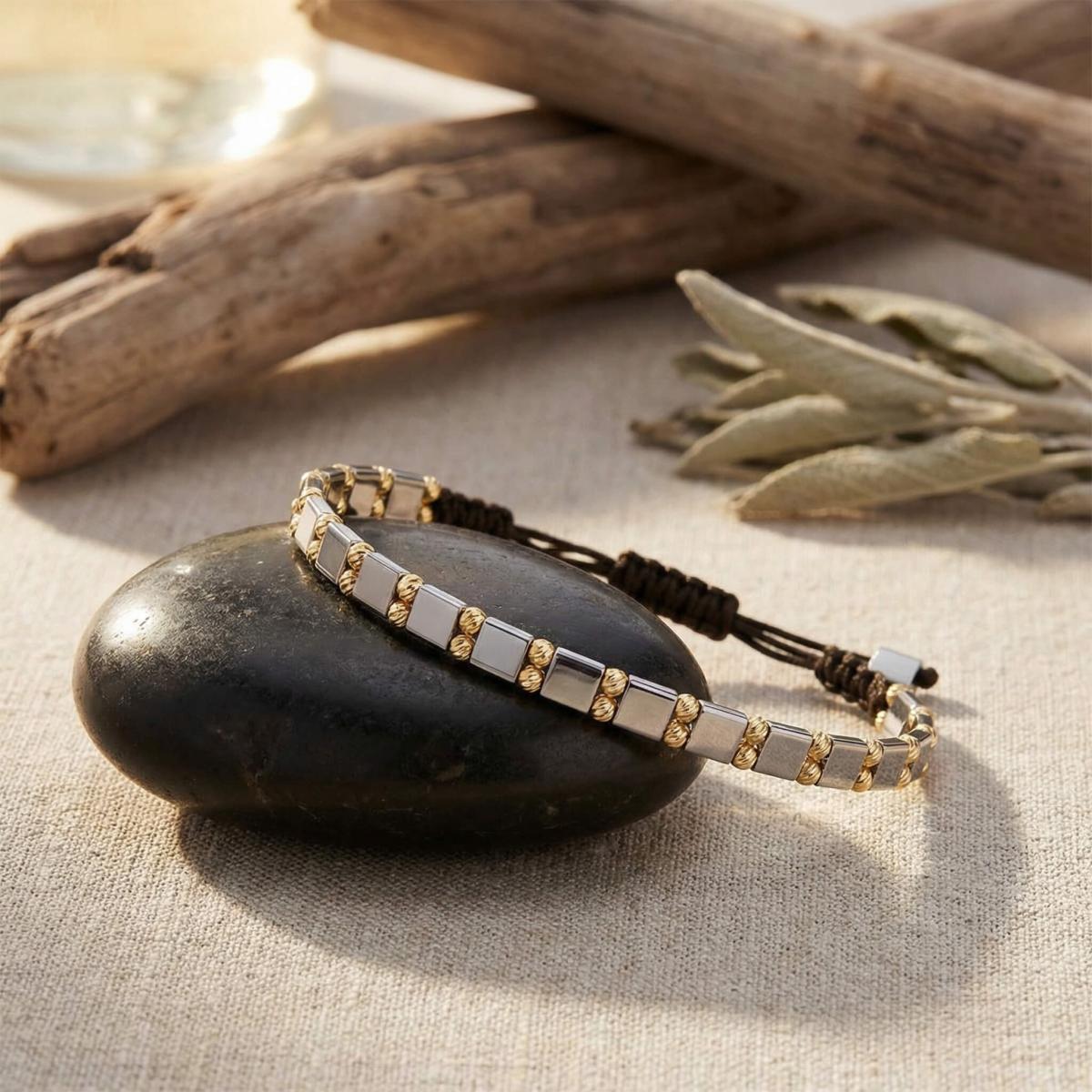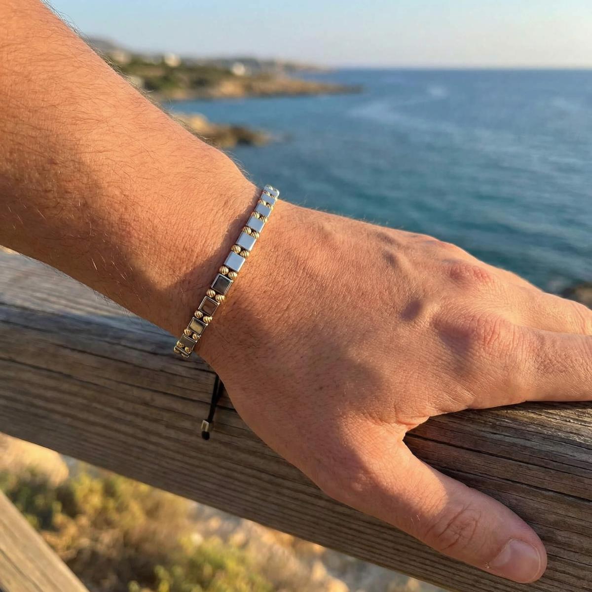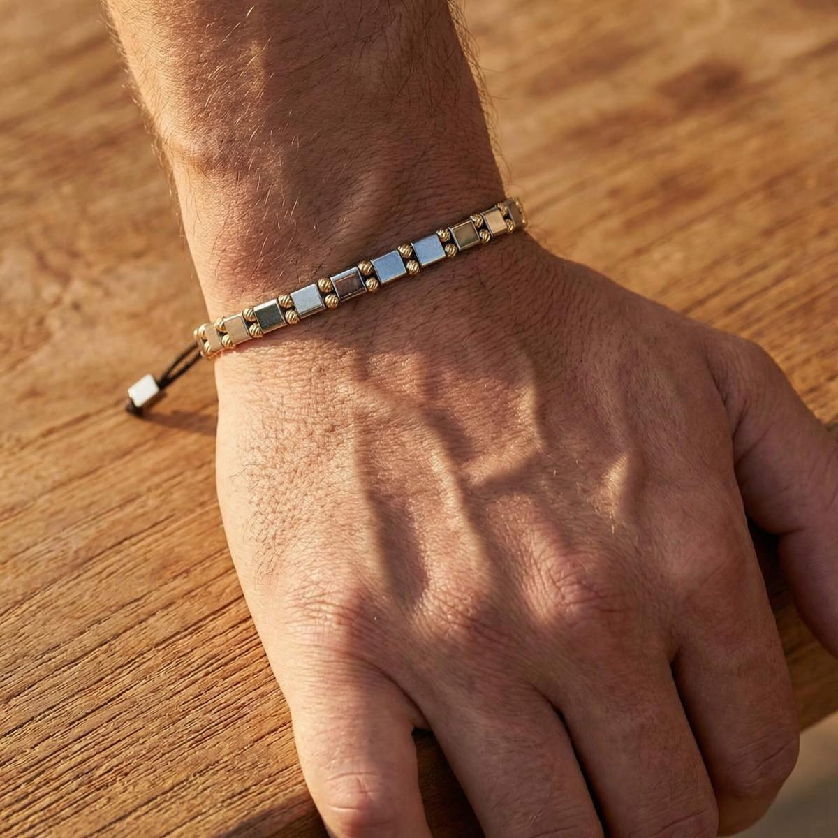 Елегантна мъжка гривна със златни топчета и хематит
