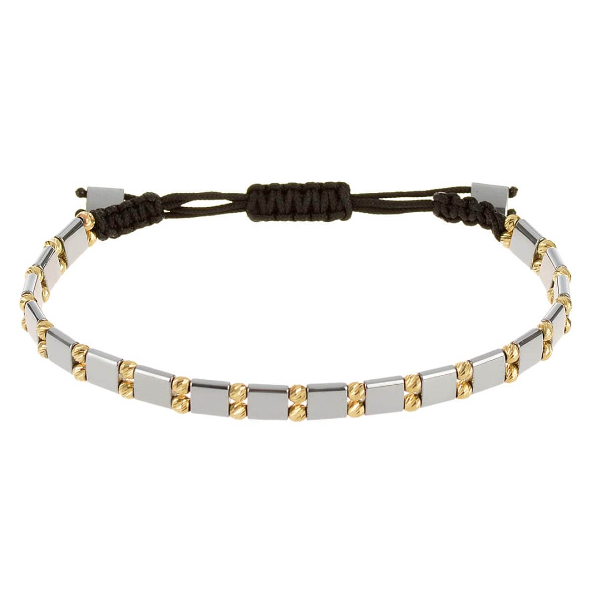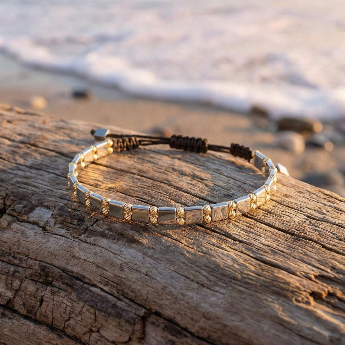 Както при болшинството наши плетени гривни за мъже, и тук златото присъства под някаква форма. В случая присъствието му не се ограничава до ролята му на декорация, а се използва и като функционален детайл. Закопчалката е изработена от 14-каратово злато проба 585, както и декоративните мъниста.