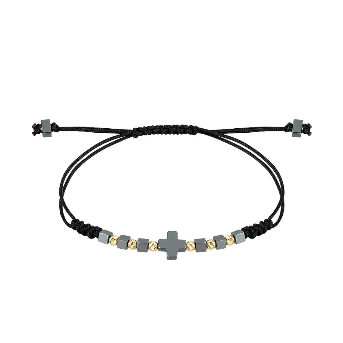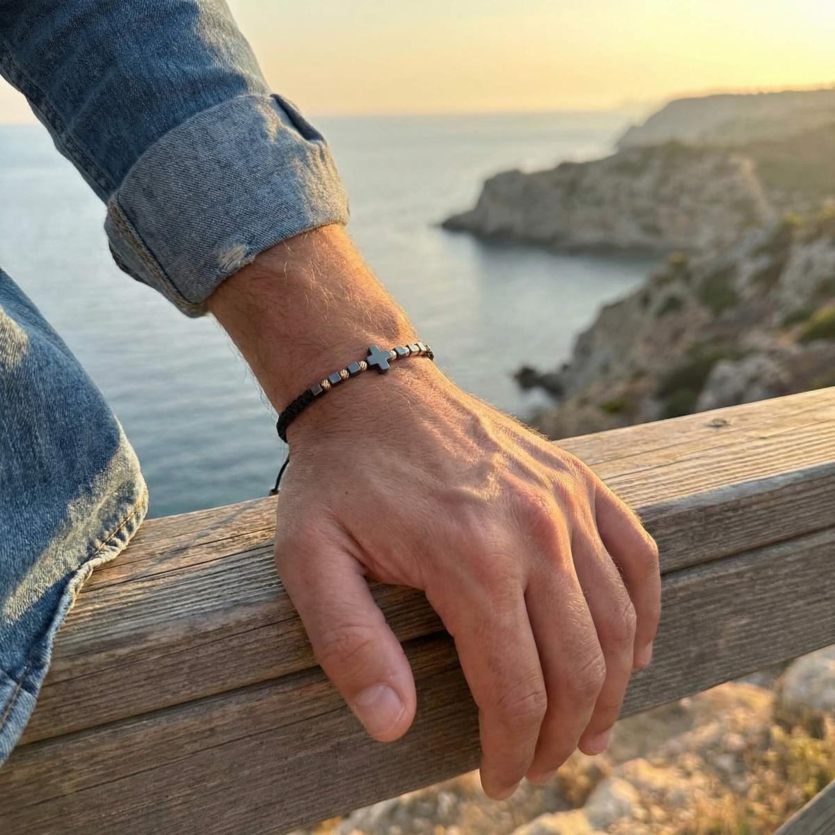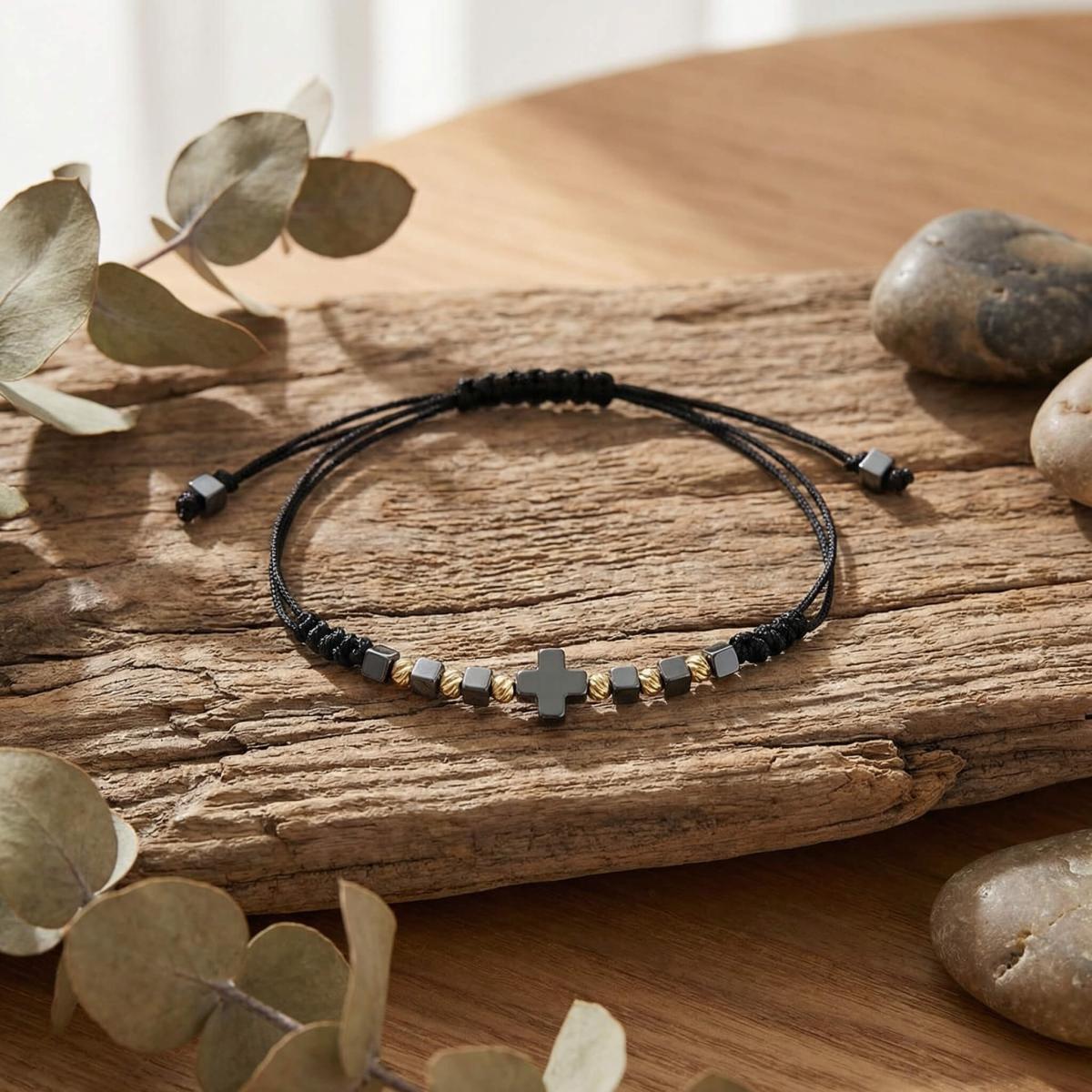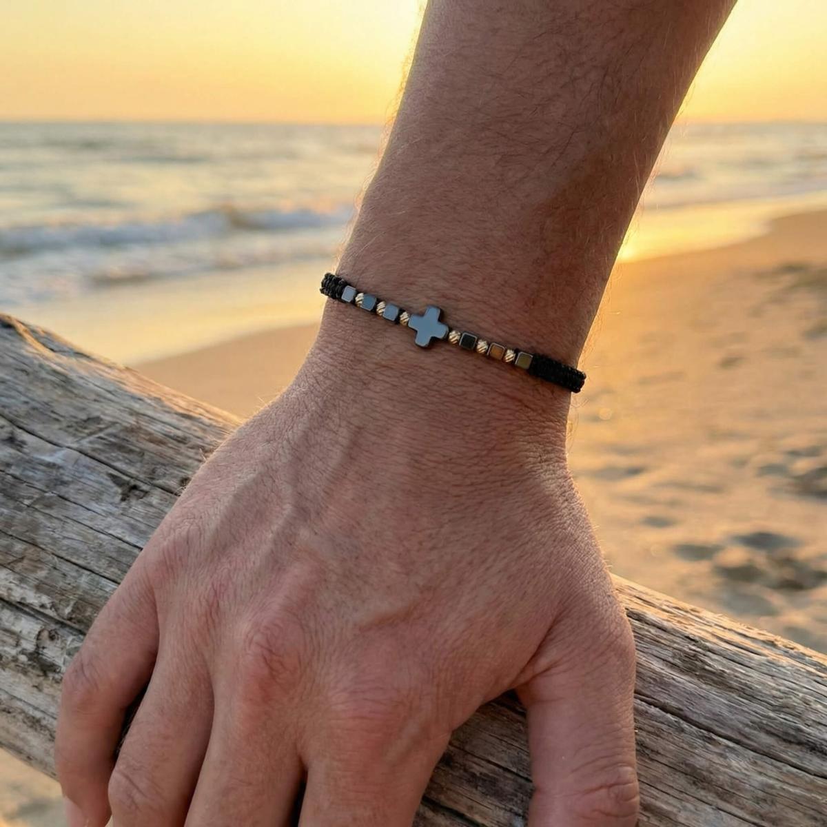 В центъра стои кръстът от хематит – древен символ на баланс между посоките, между материята и духа. Той е знак за вътрешен ред, самоконтрол и осъзната сила.