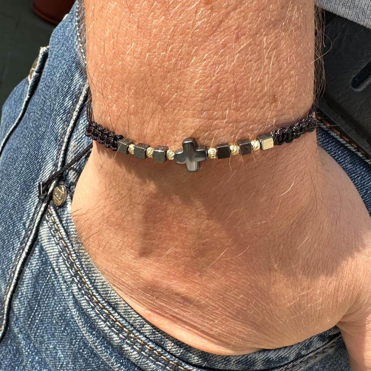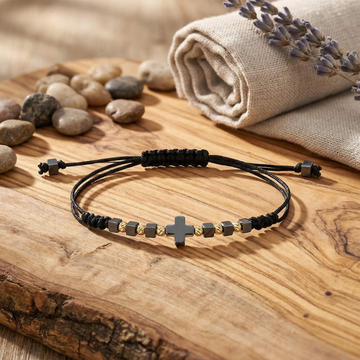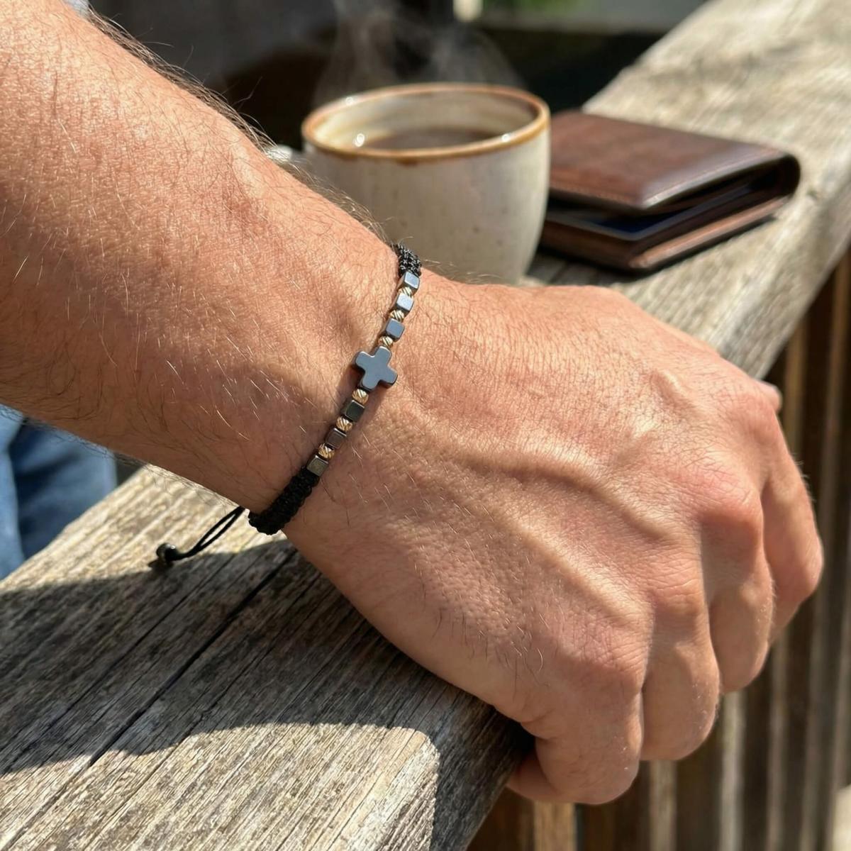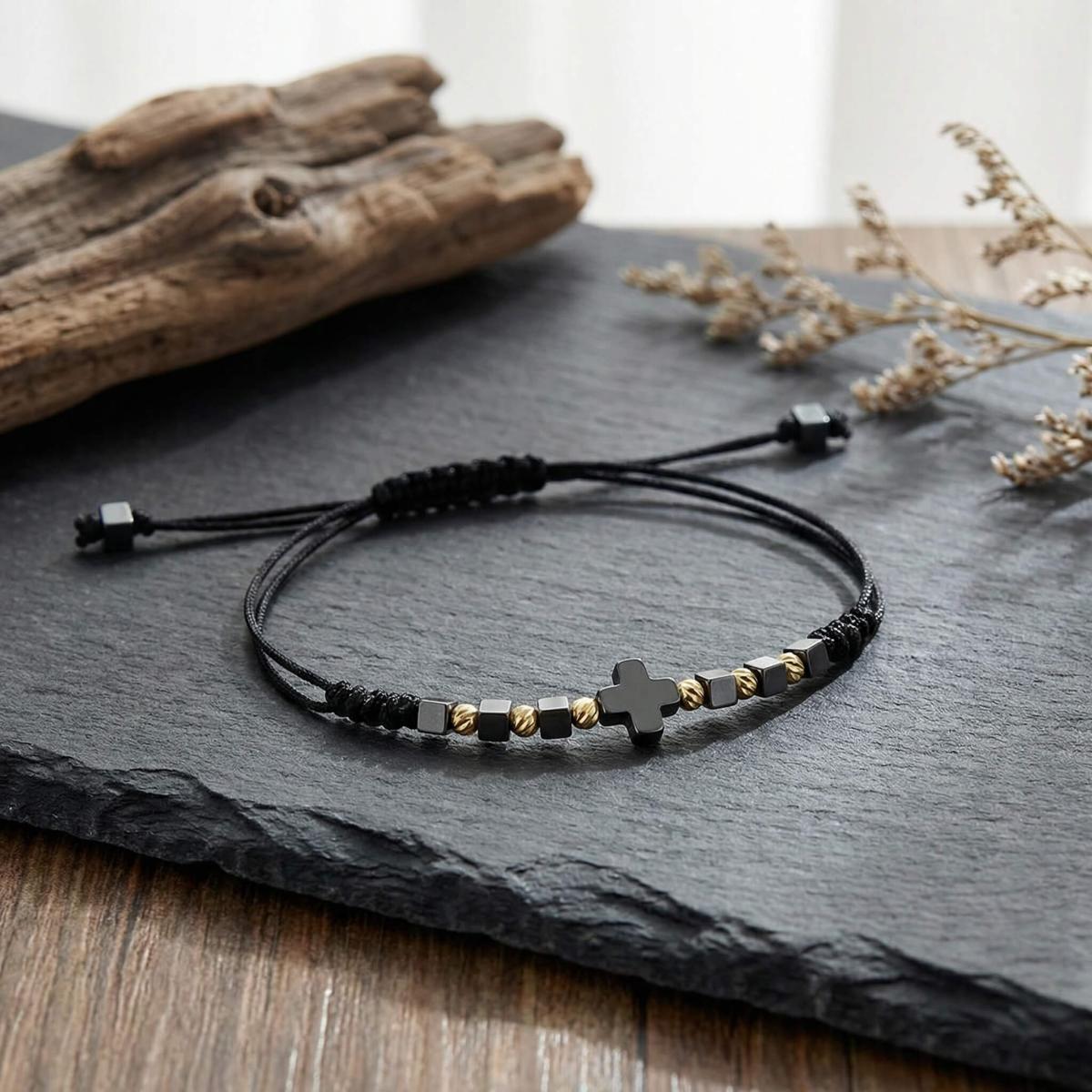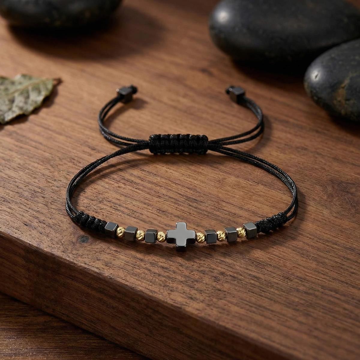 В центъра стои кръстът от хематит – древен символ на баланс между посоките, между материята и духа. Той е знак за вътрешен ред, самоконтрол и осъзната сила.