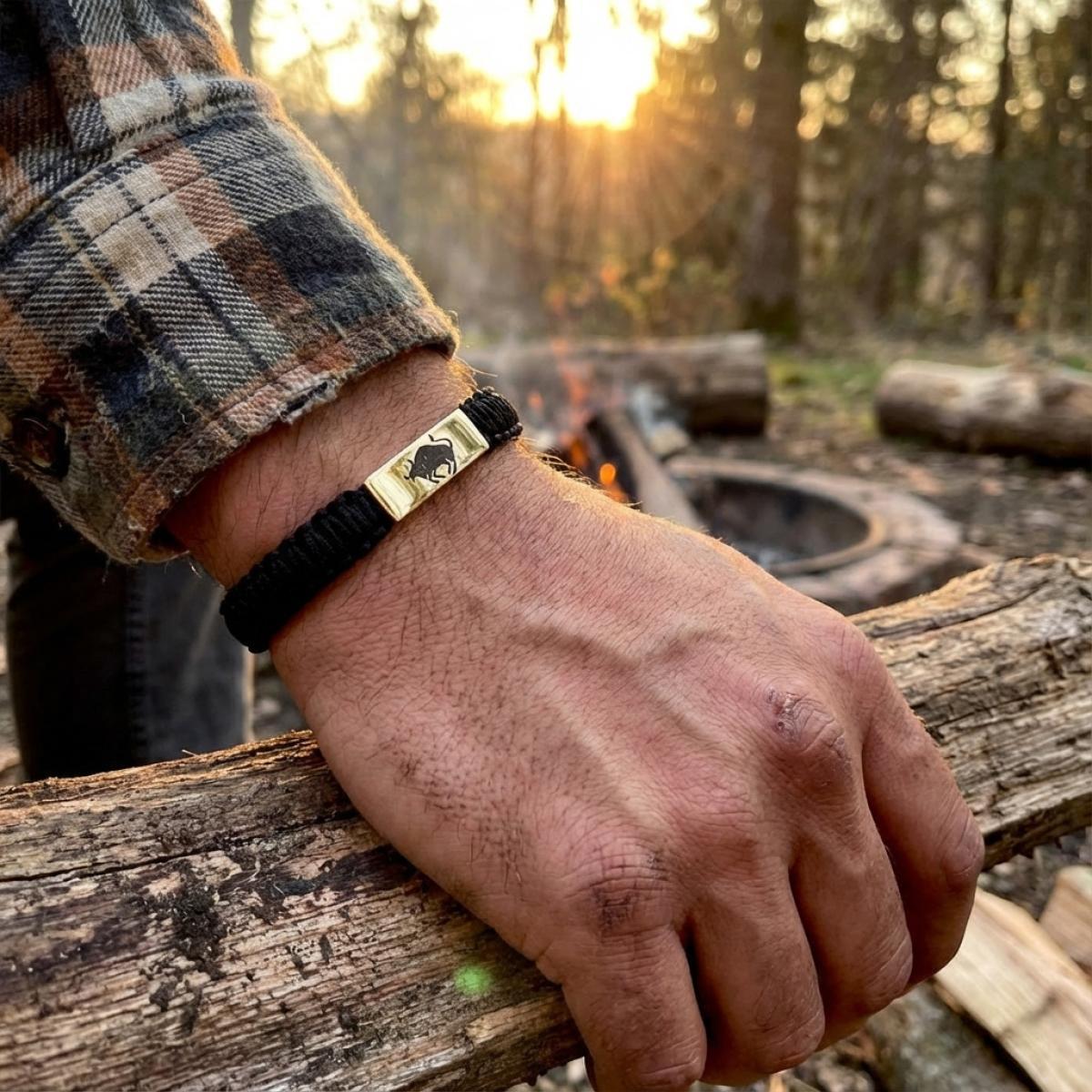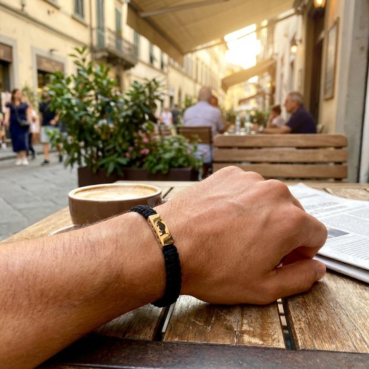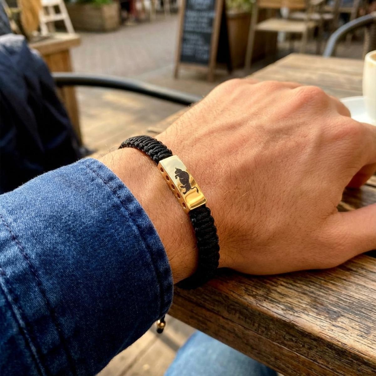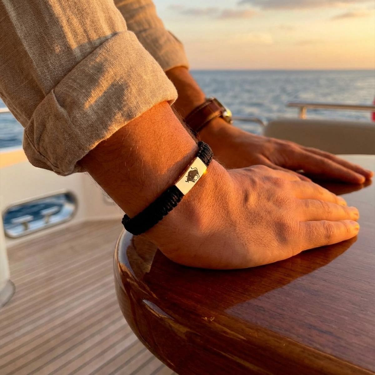 Елегантна златна мъжка гривна с масивна плочка и стабилна златна закопчалка. Комбинацията между здравата черна плетка и златните акценти придава изискан, но същевременно мъжествен характер на бижуто. Плочката е подходяща за лазерно гравиране и е изцяло по избор на клиента - символ инициали, знак, лого или друг персонализиран мотив, което превръща гривната в уникално и лично бижу.