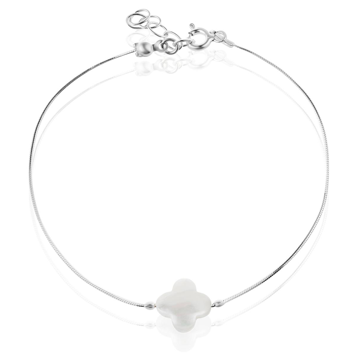 Фина сребърна гривна, изработена от сребро 925, с централен акцент – седефена детелина, която придава мек блясък и усещане за лекота и елегантност. Деликатната верижка подчертава естествената красота на седефа и прави гривната изключително подходяща за ежедневно носене.