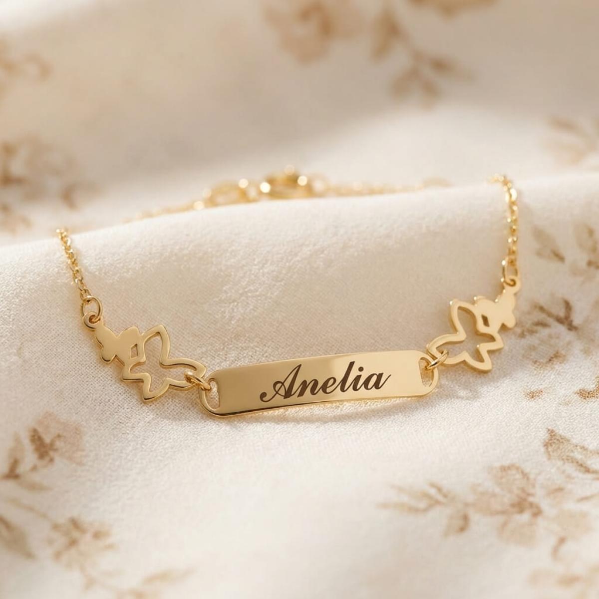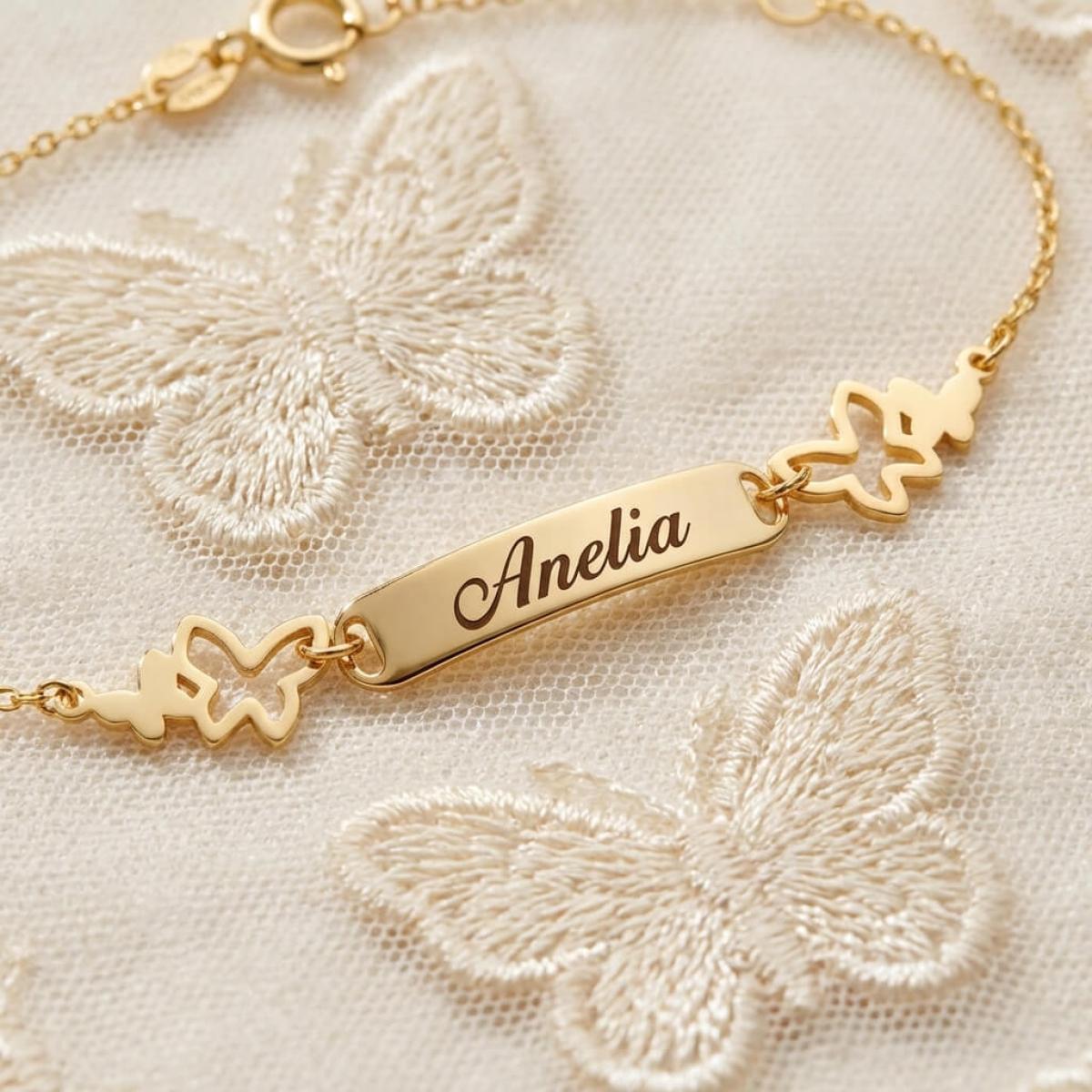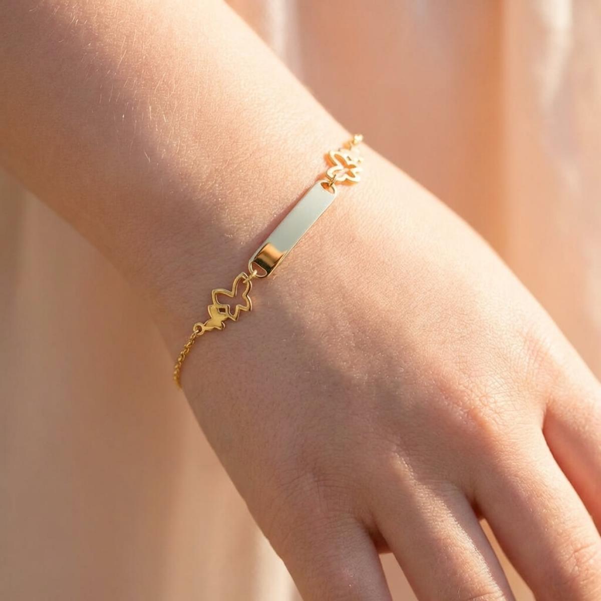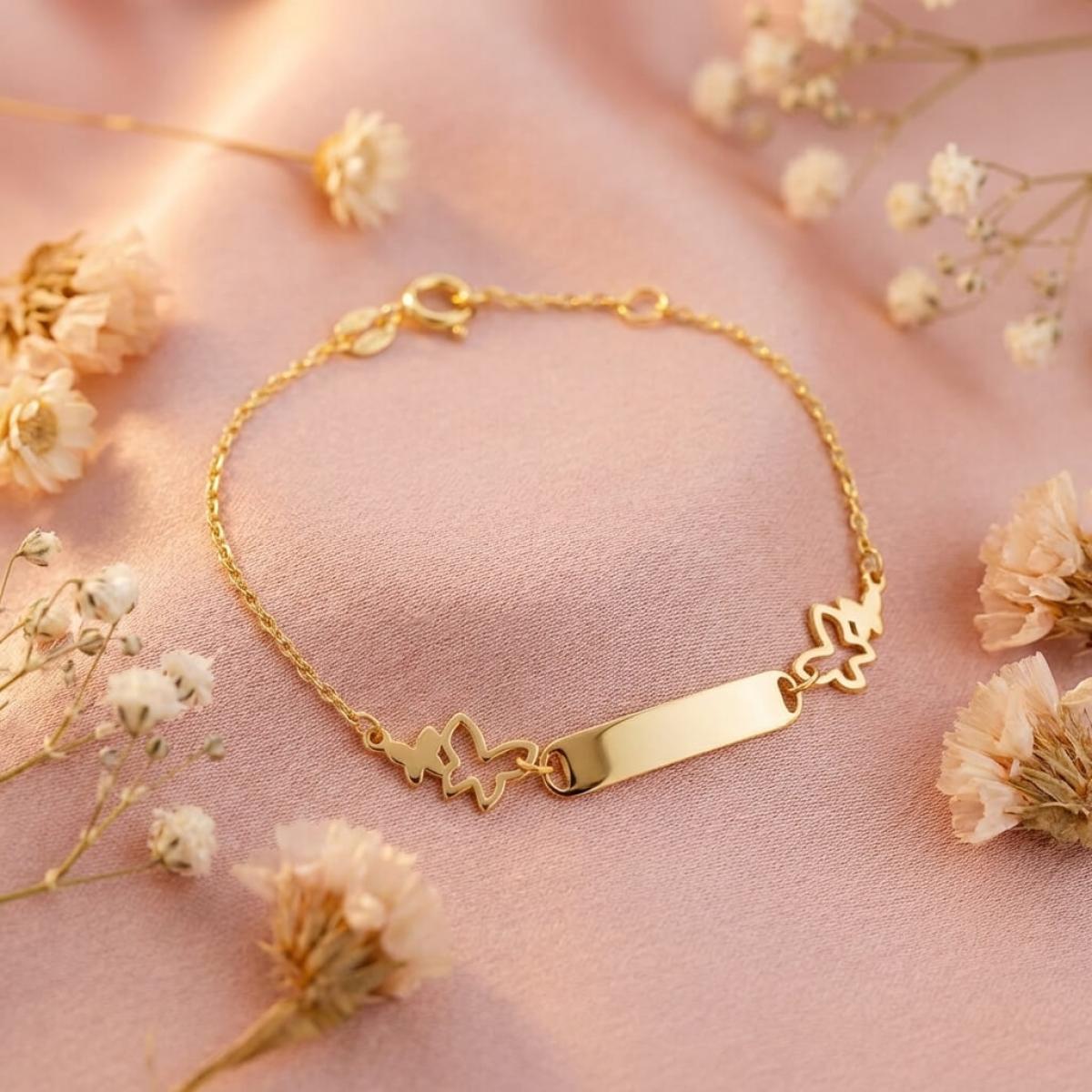 Детската златна гривна Пеперуди с малка плочка е нежно и изискано бижу, предназначено да украси малките ръчички с изящество и стил.