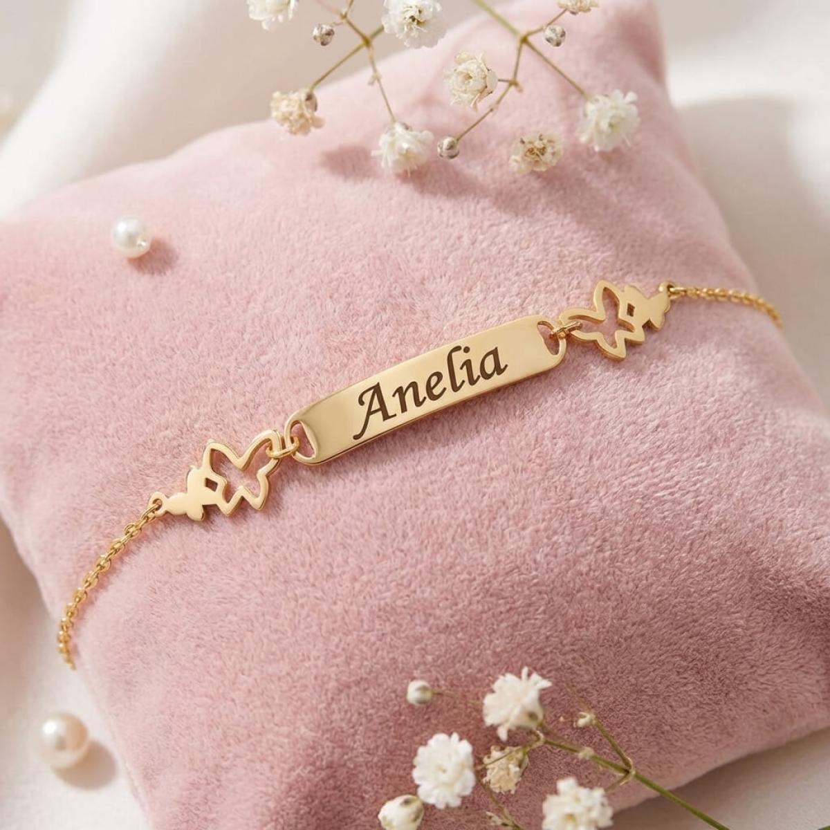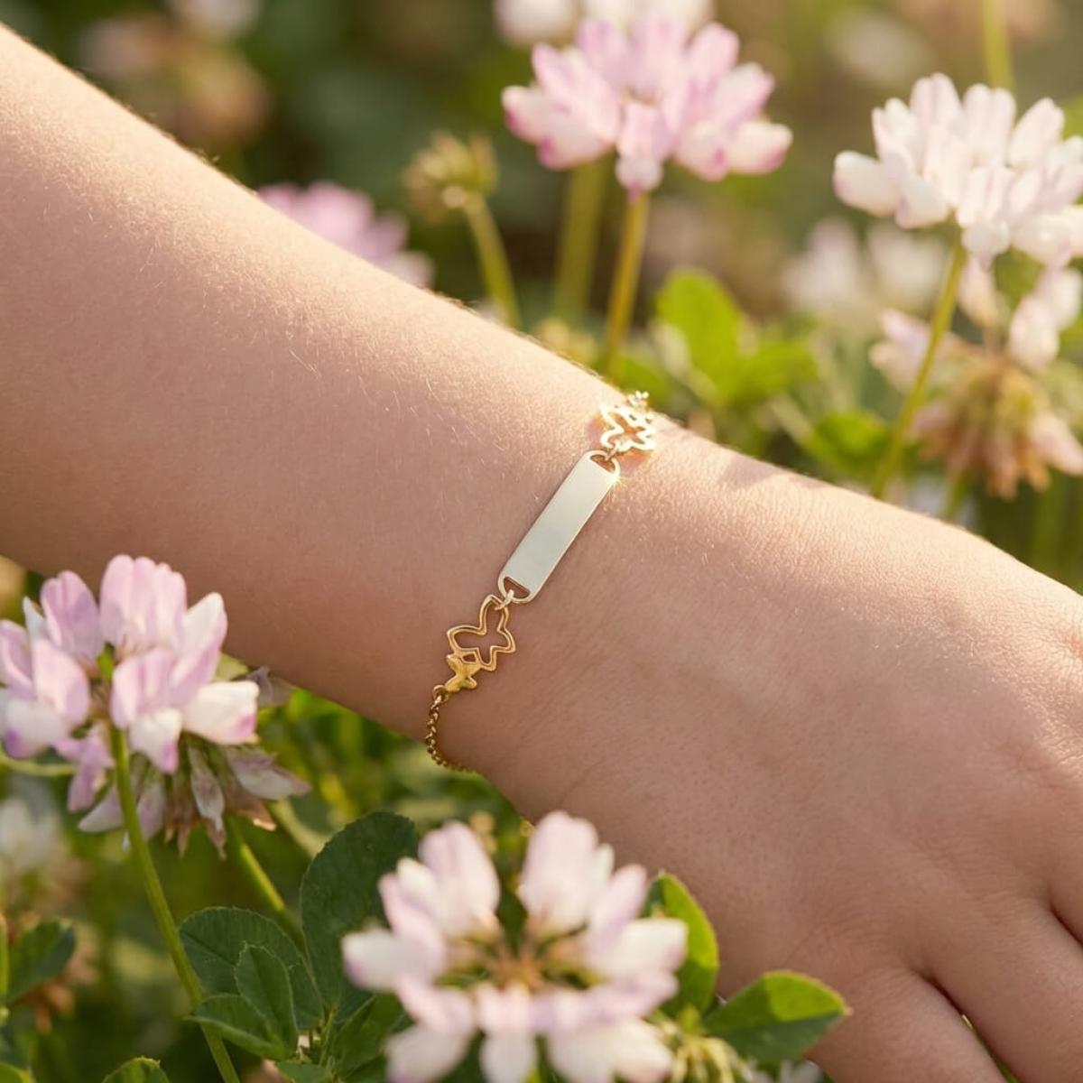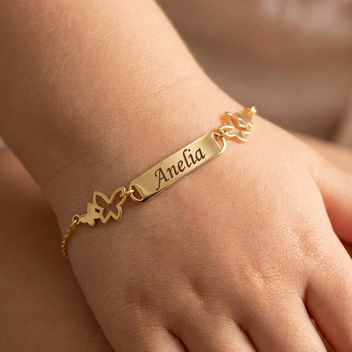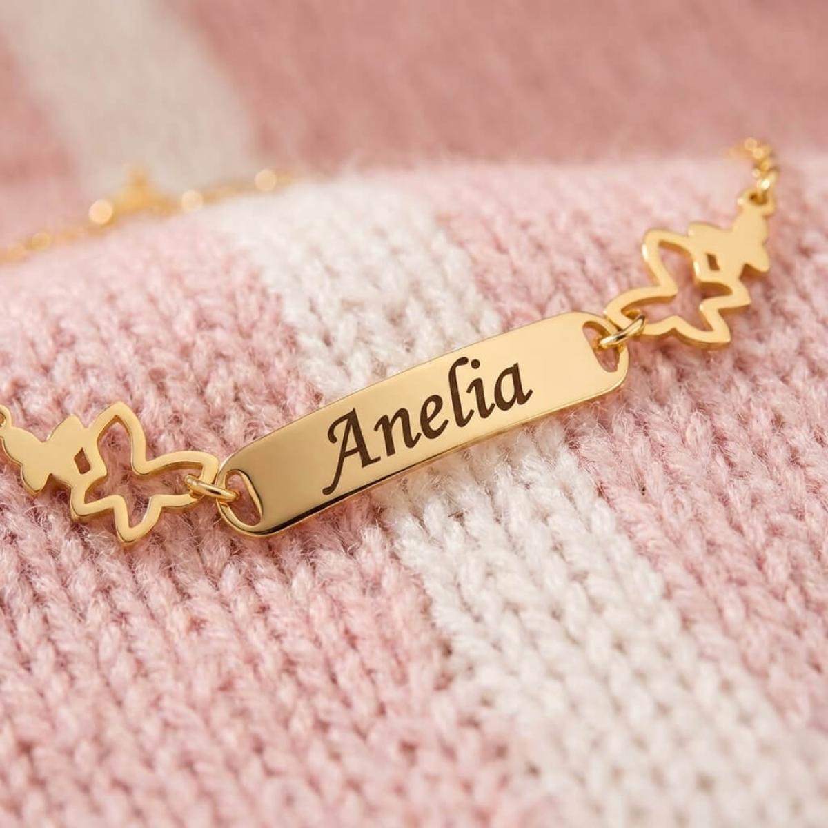 Детската златна гривна Пеперуди с малка плочка е нежно и изискано бижу, предназначено да украси малките ръчички с изящество и стил.