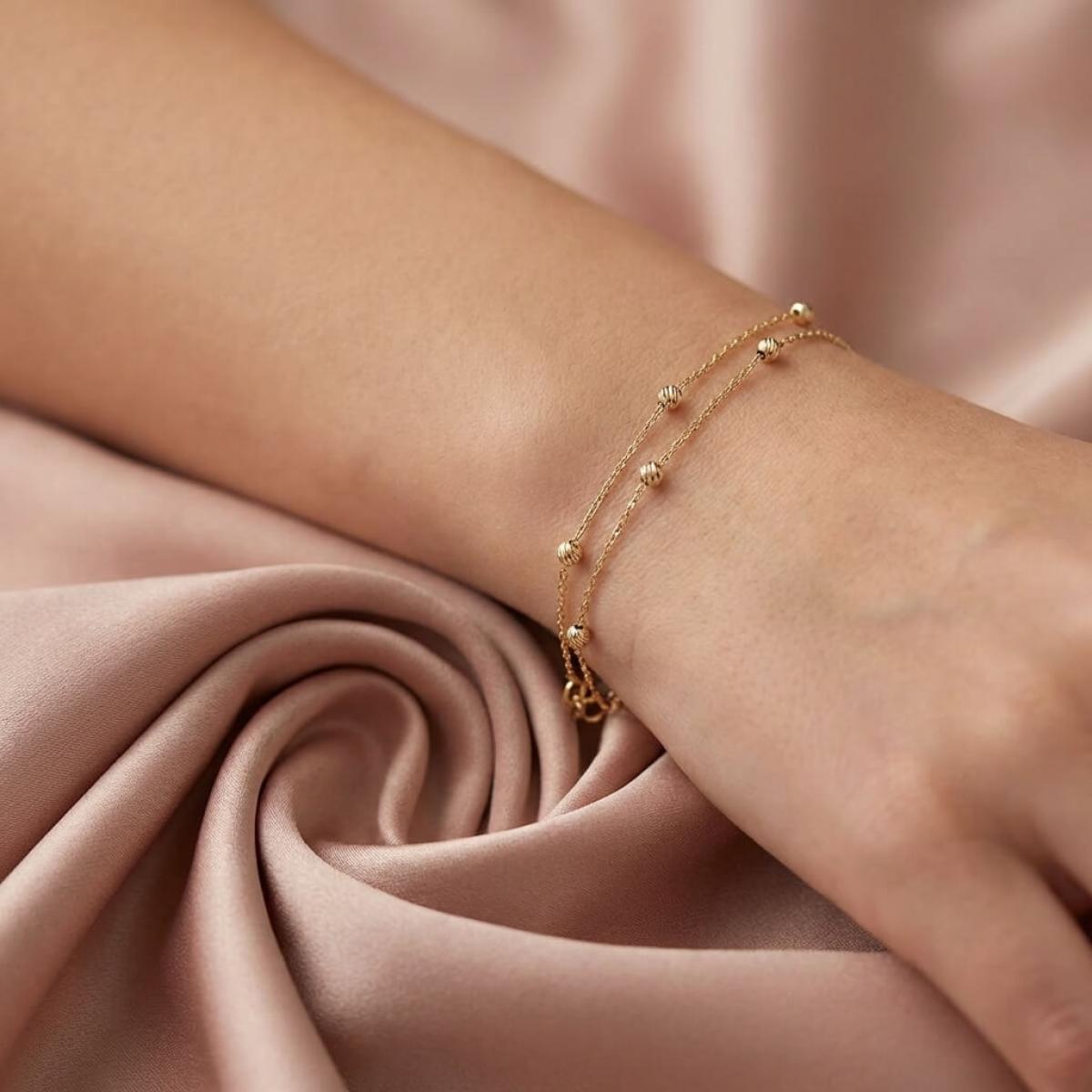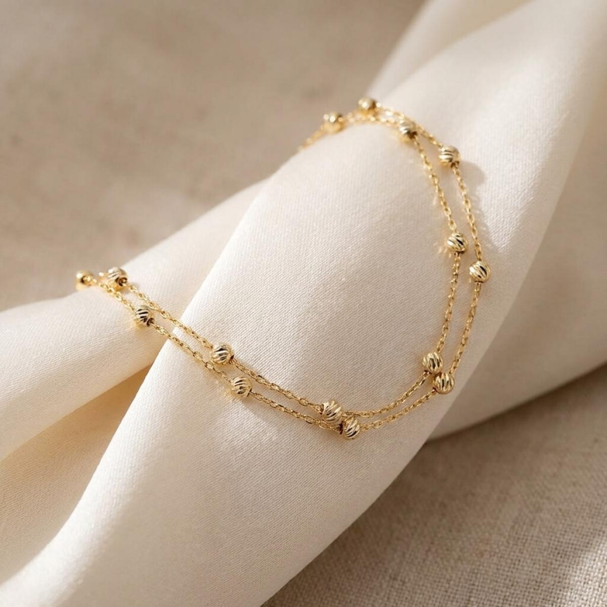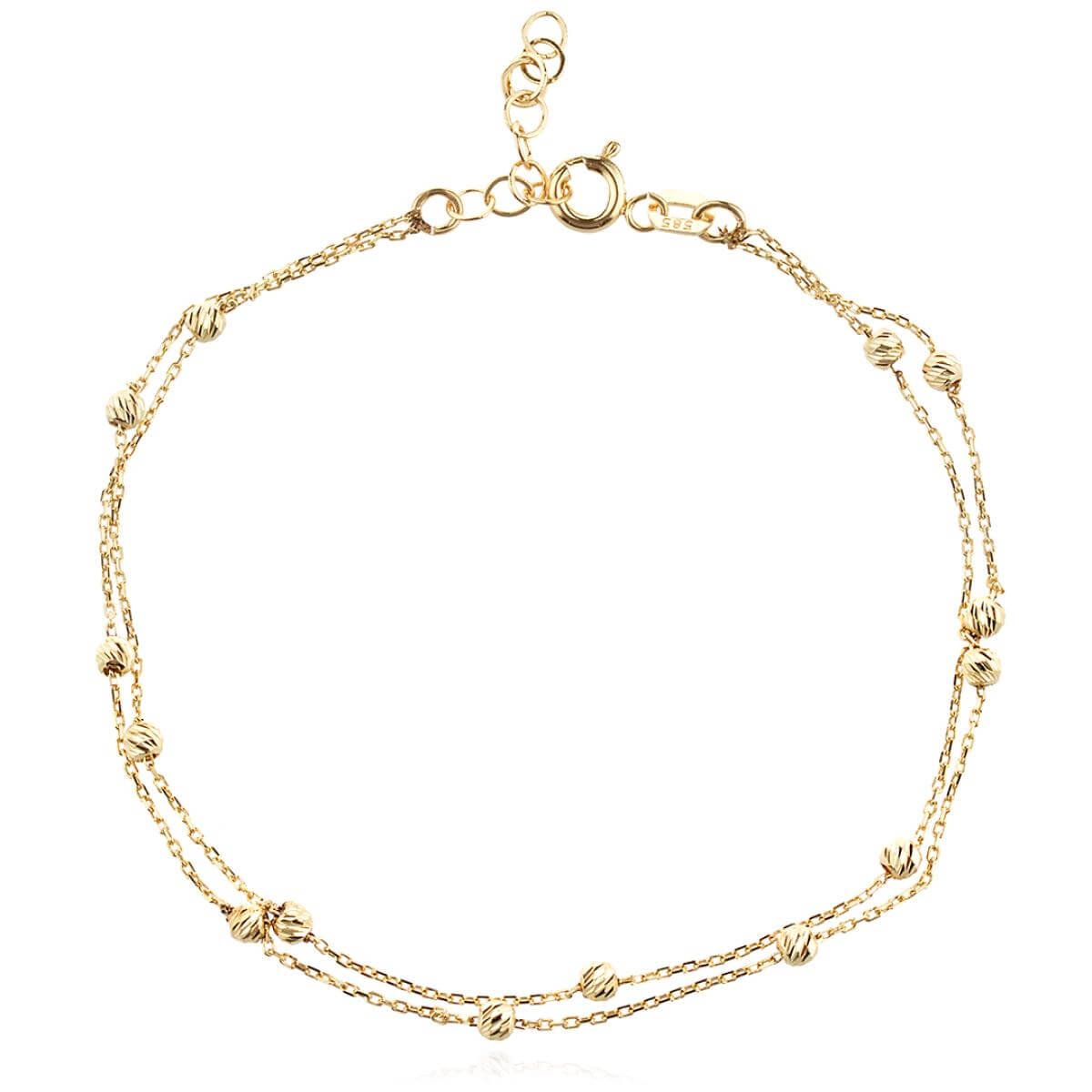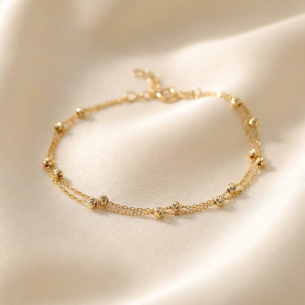 Изработена от жълто злато проба 585, тази гривна се отличава с двоен синджир, който ѝ придава модерна визия и изисканост. Малките златни топчета, равномерно разположени по гривната, добавят деликатен блясък и динамичен акцент.
