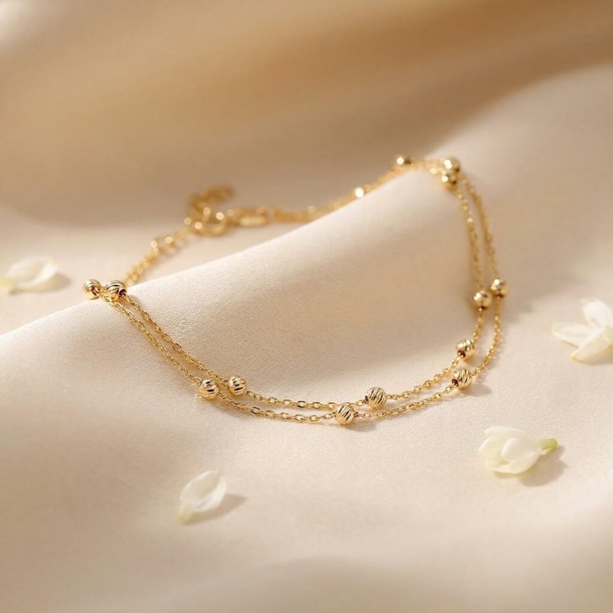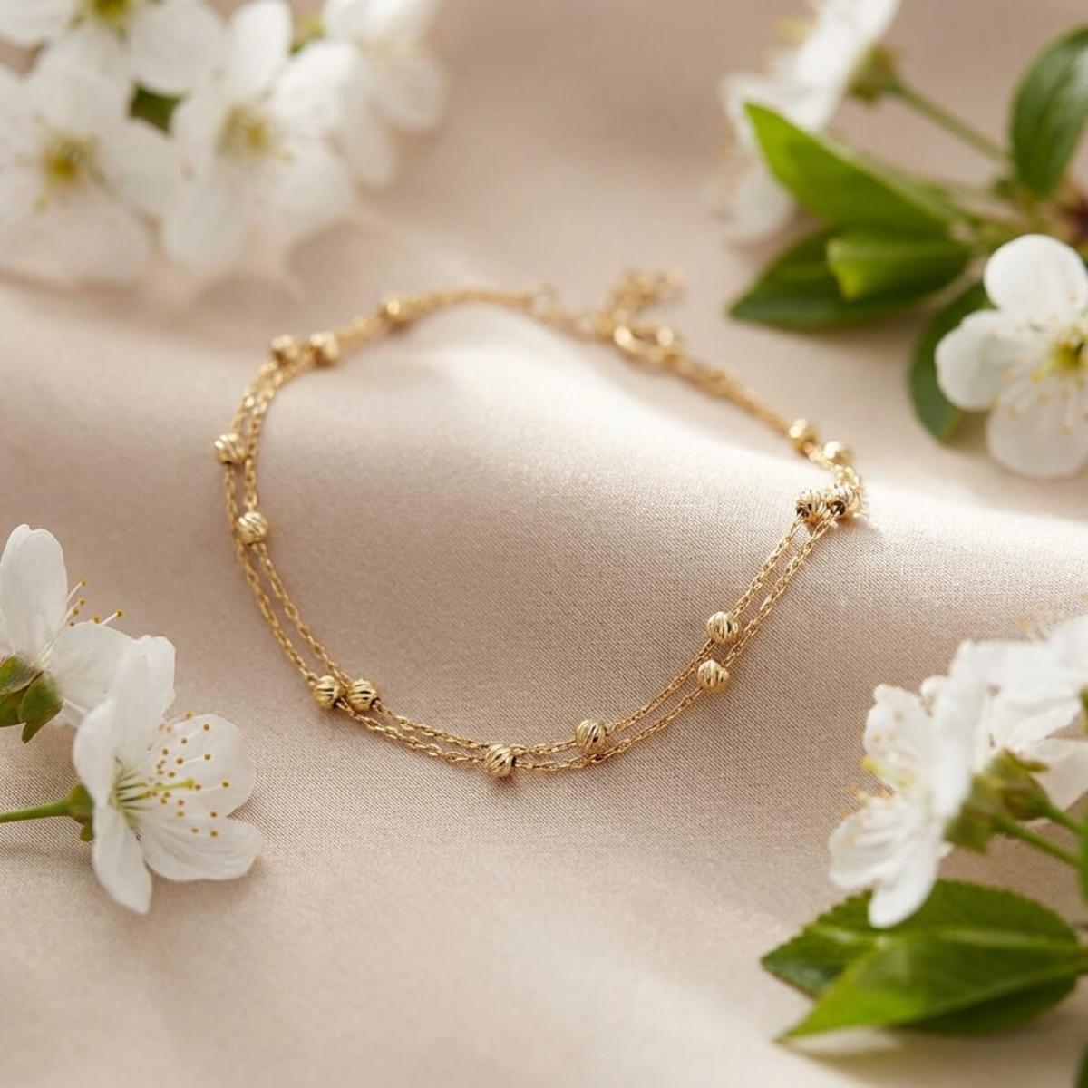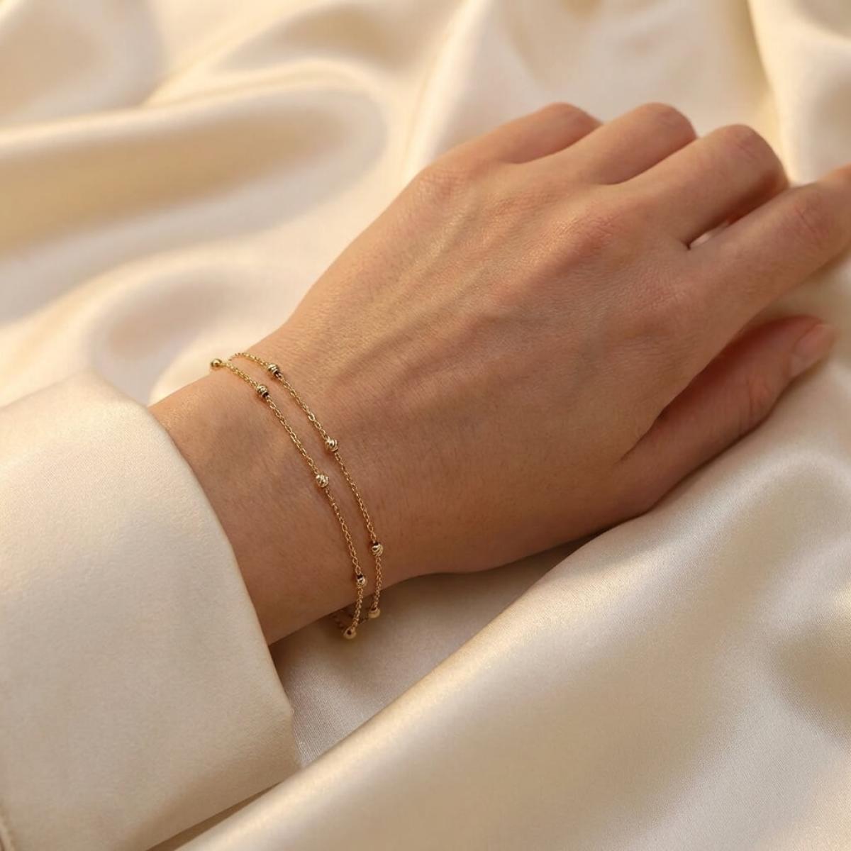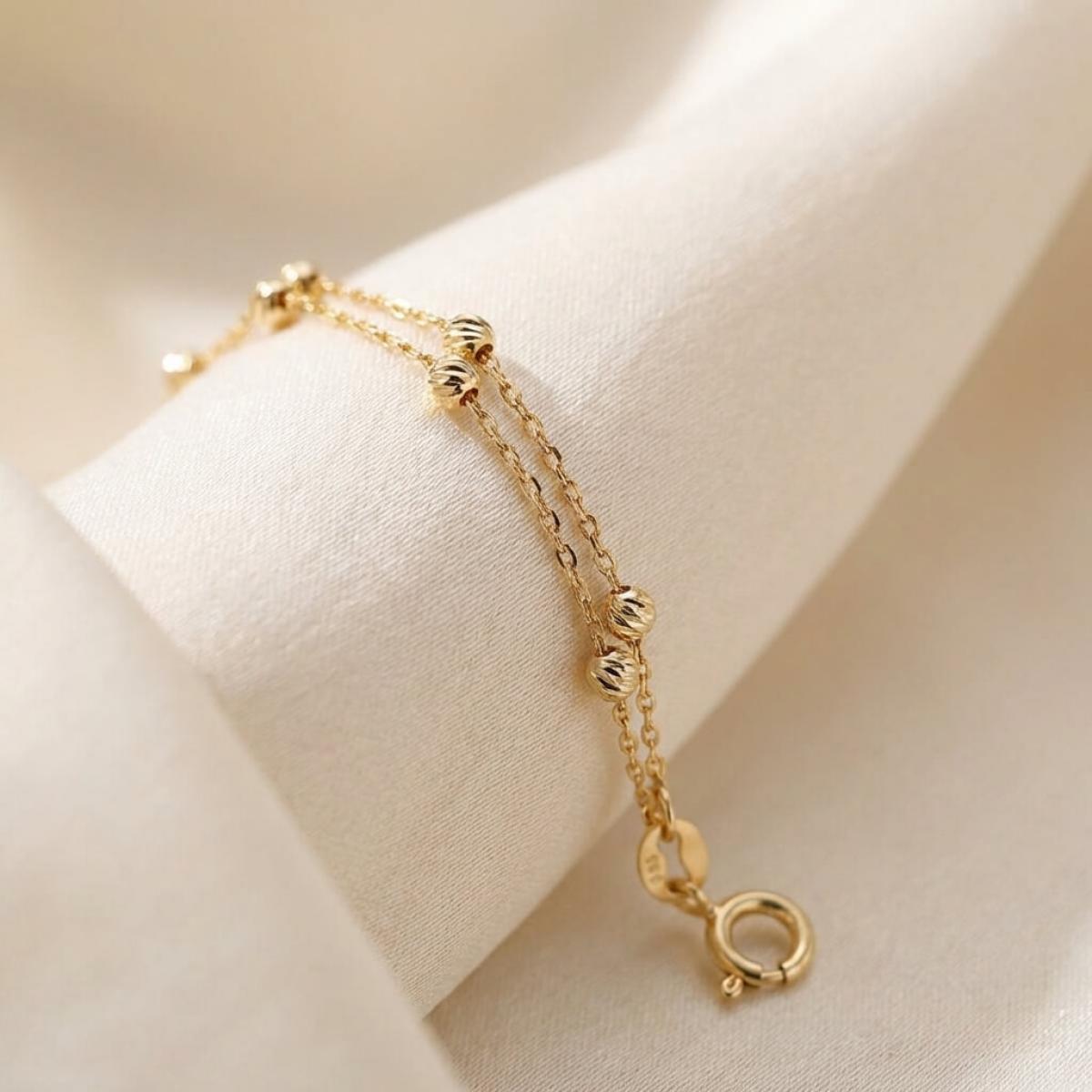 Изработена от жълто злато проба 585, тази гривна се отличава с двоен синджир, който ѝ придава модерна визия и изисканост. Малките златни топчета, равномерно разположени по гривната, добавят деликатен блясък и динамичен акцент.