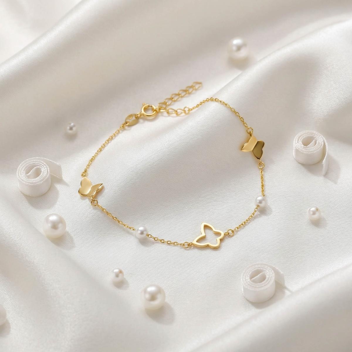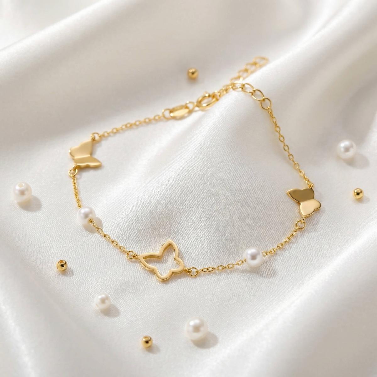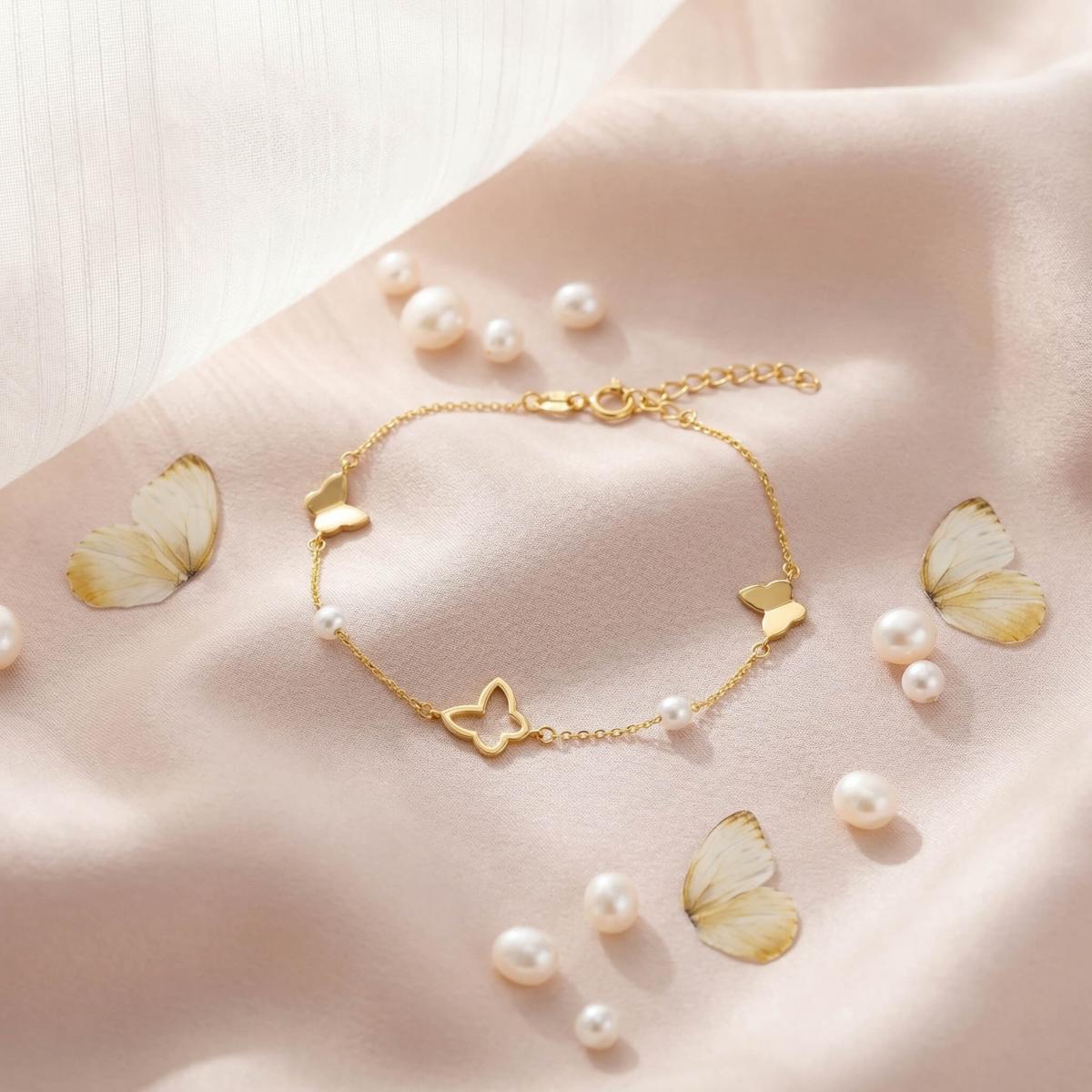 Златна гривна Перлени Пеперуди е елегантно и стилно бижу, което съчетава нежността на перлите с изяществото на пеперудите.