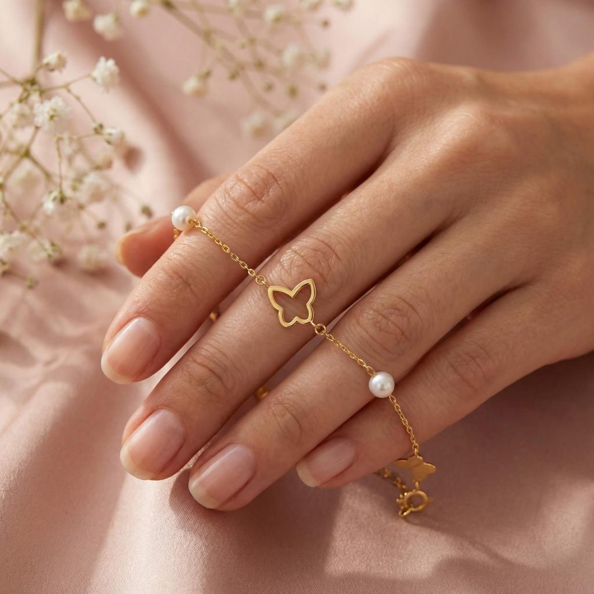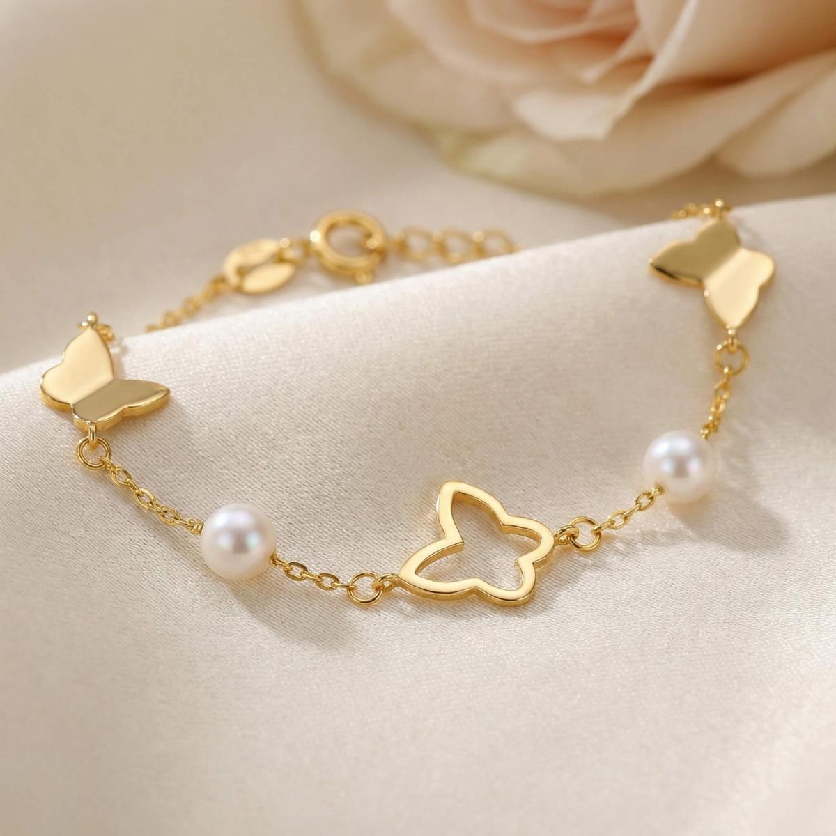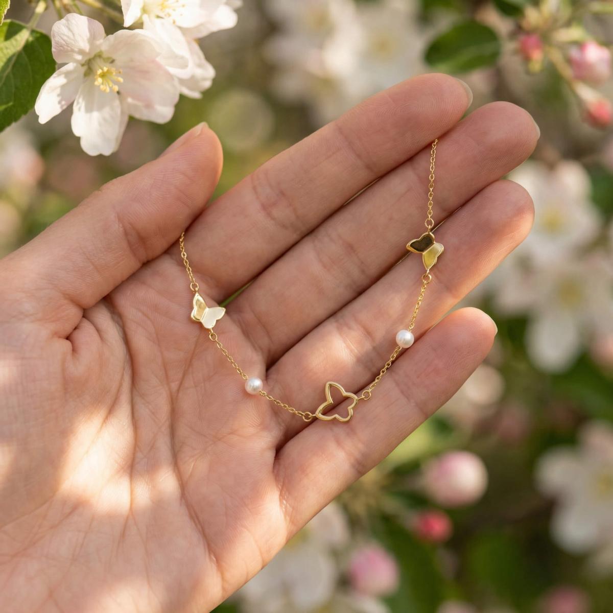Златна гривна Перлени Пеперуди е елегантно и стилно бижу, което съчетава нежността на перлите с изяществото на пеперудите.