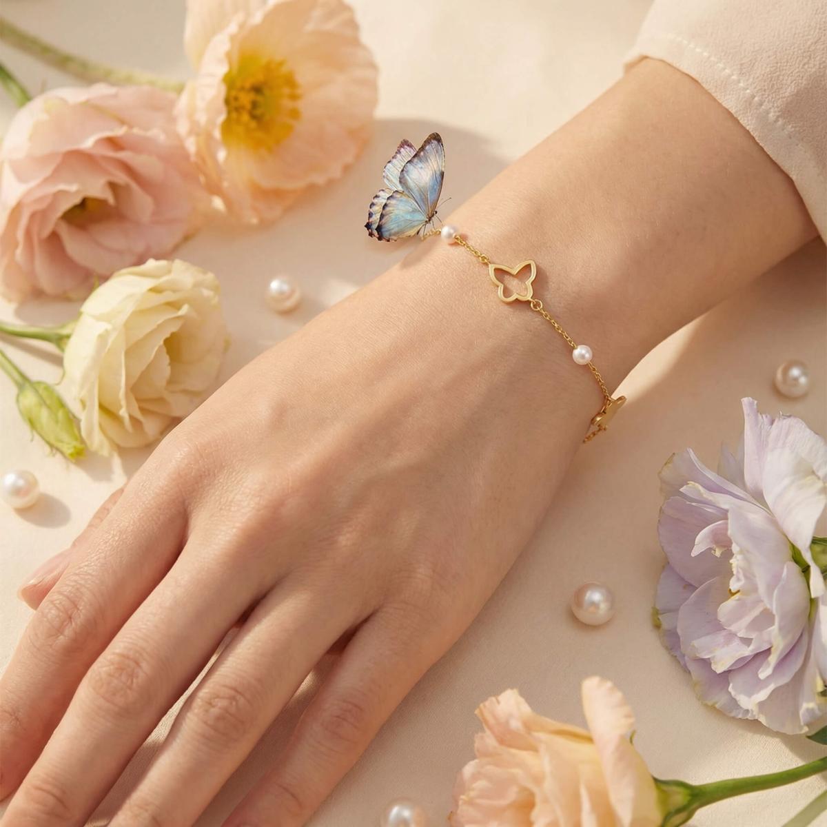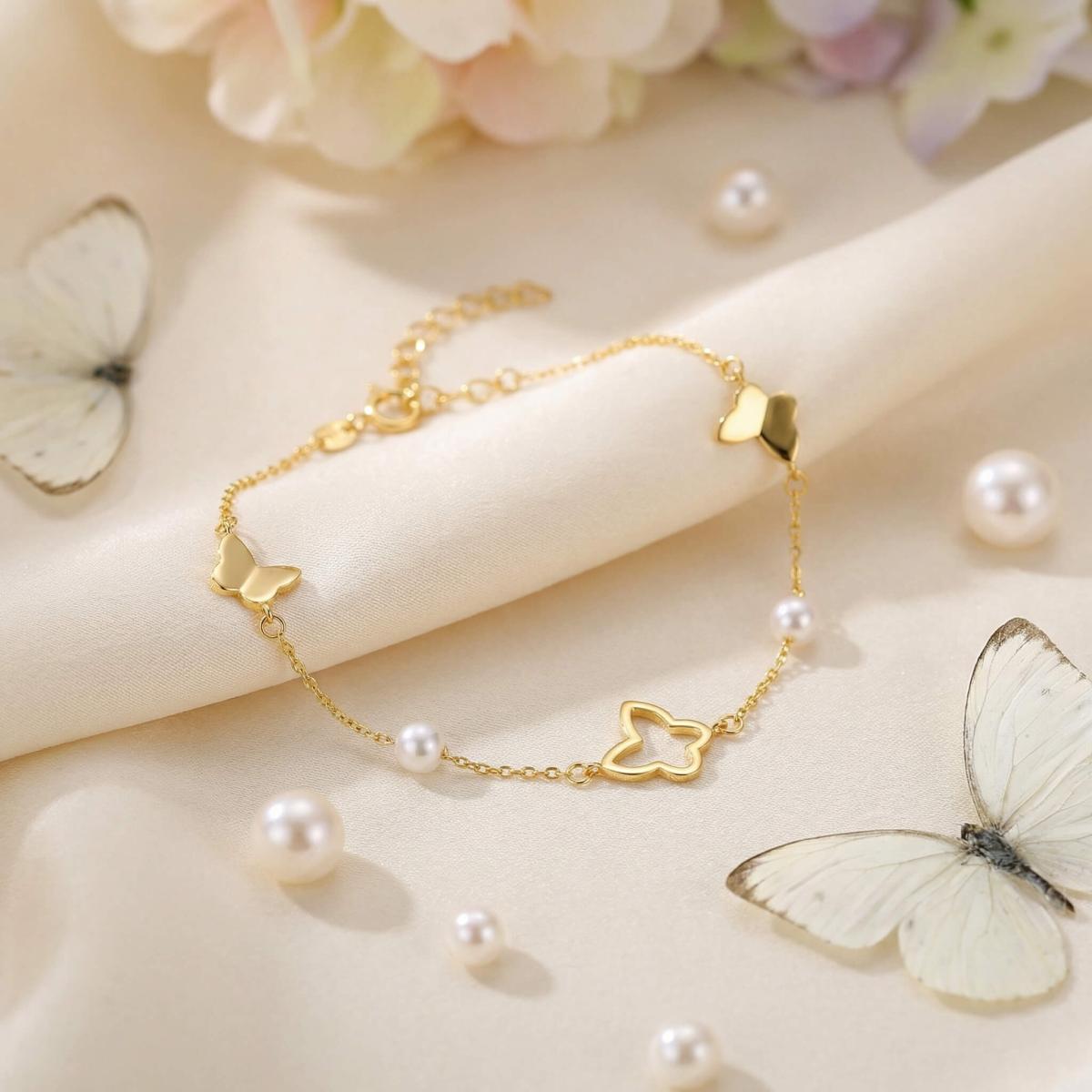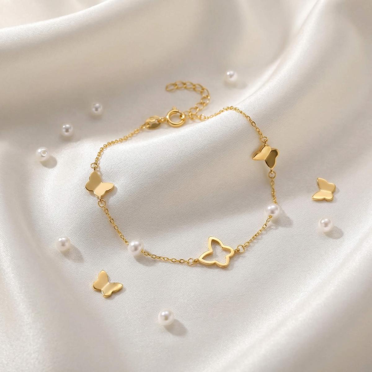Със своето красиво изпълнение и символично значение, златната гривна с пеперуди и перли е идеален подарък за специален човек или изискано допълнение към вашата лична колекция от бижута.